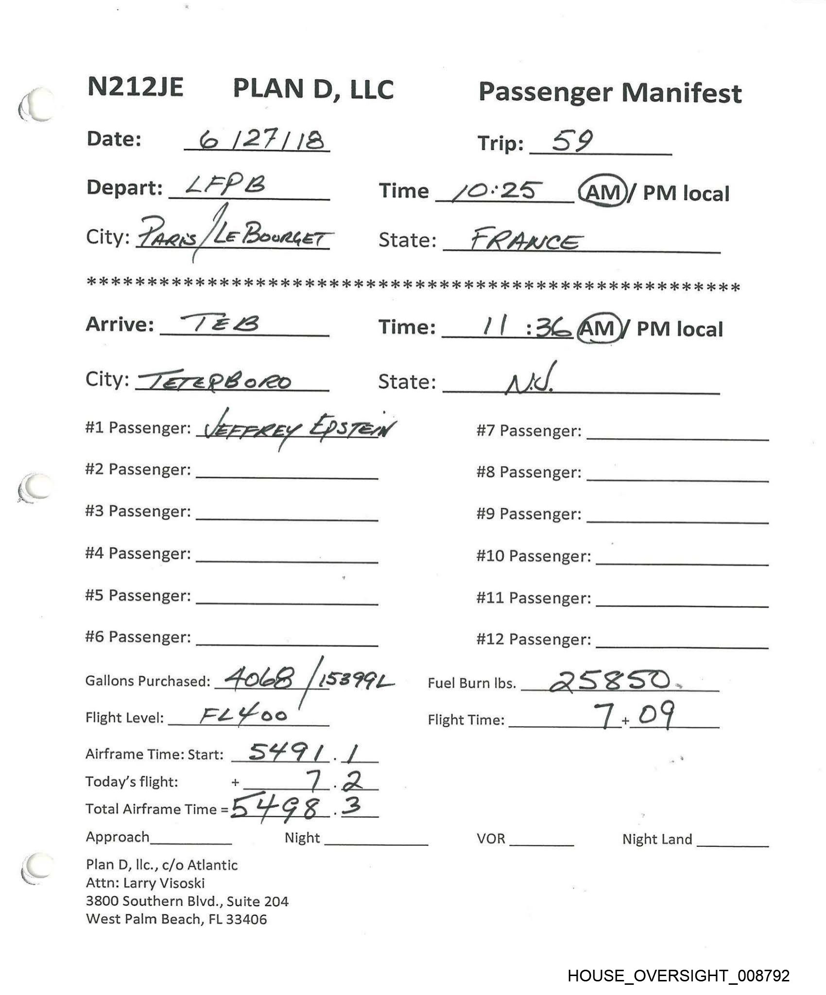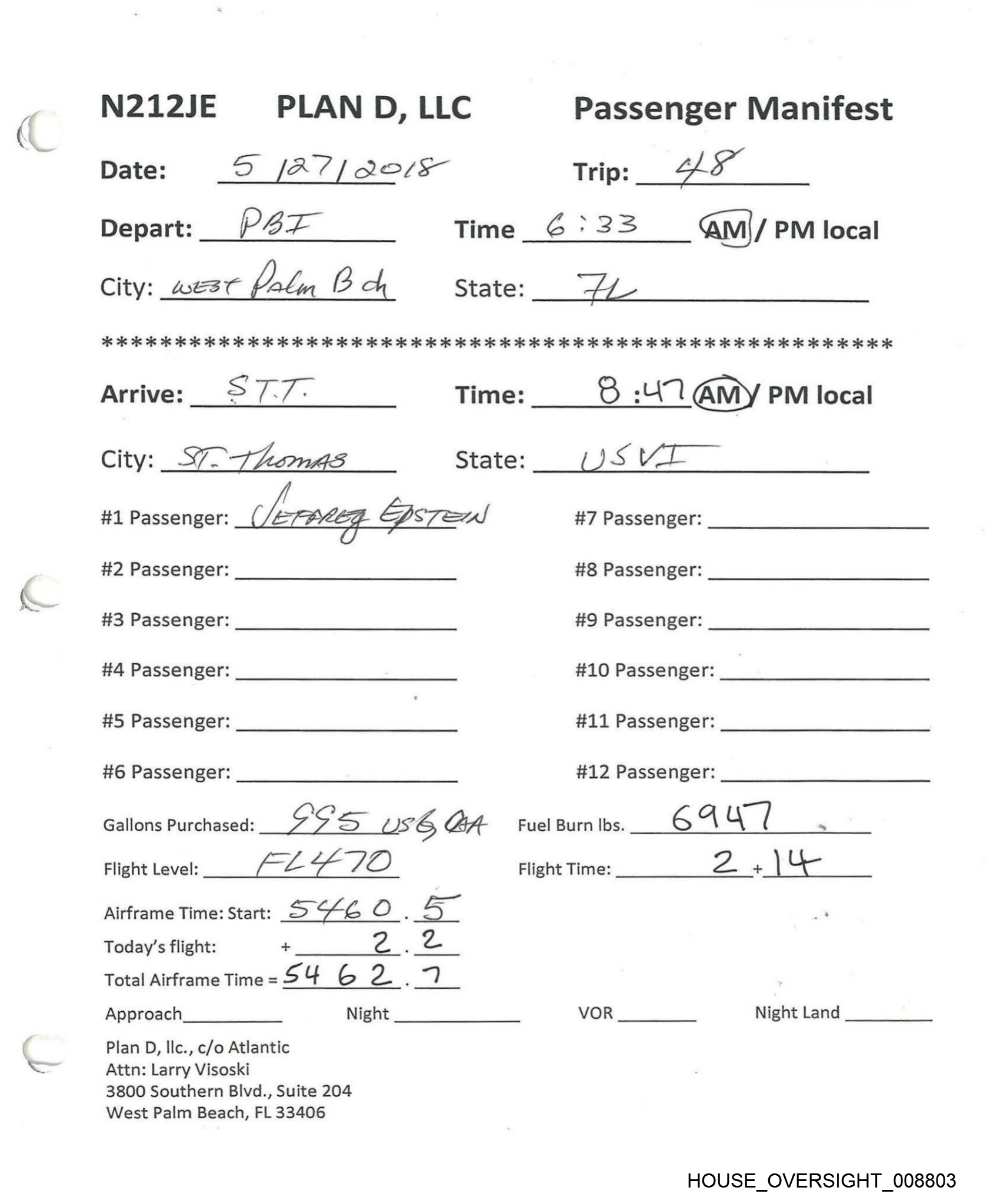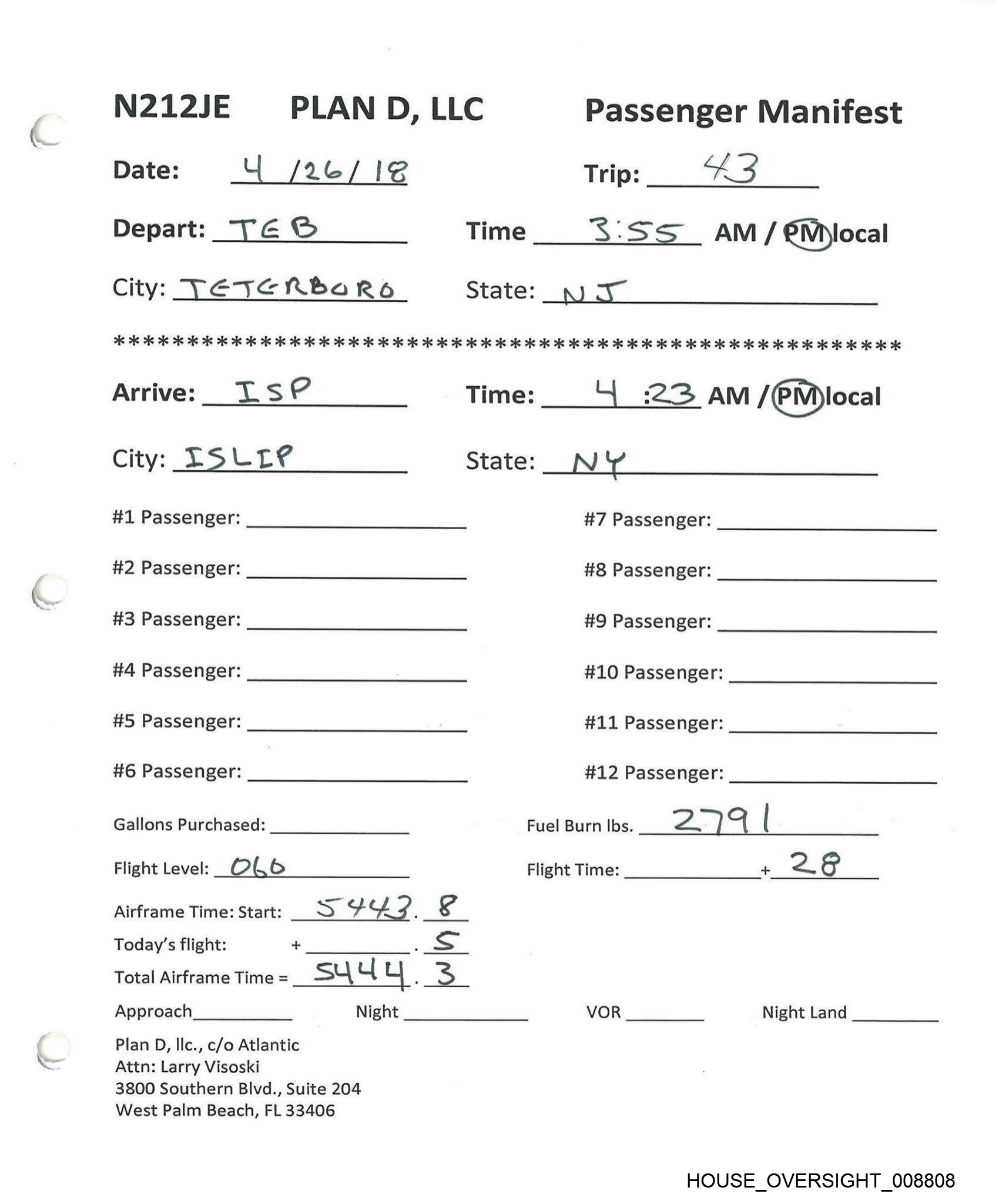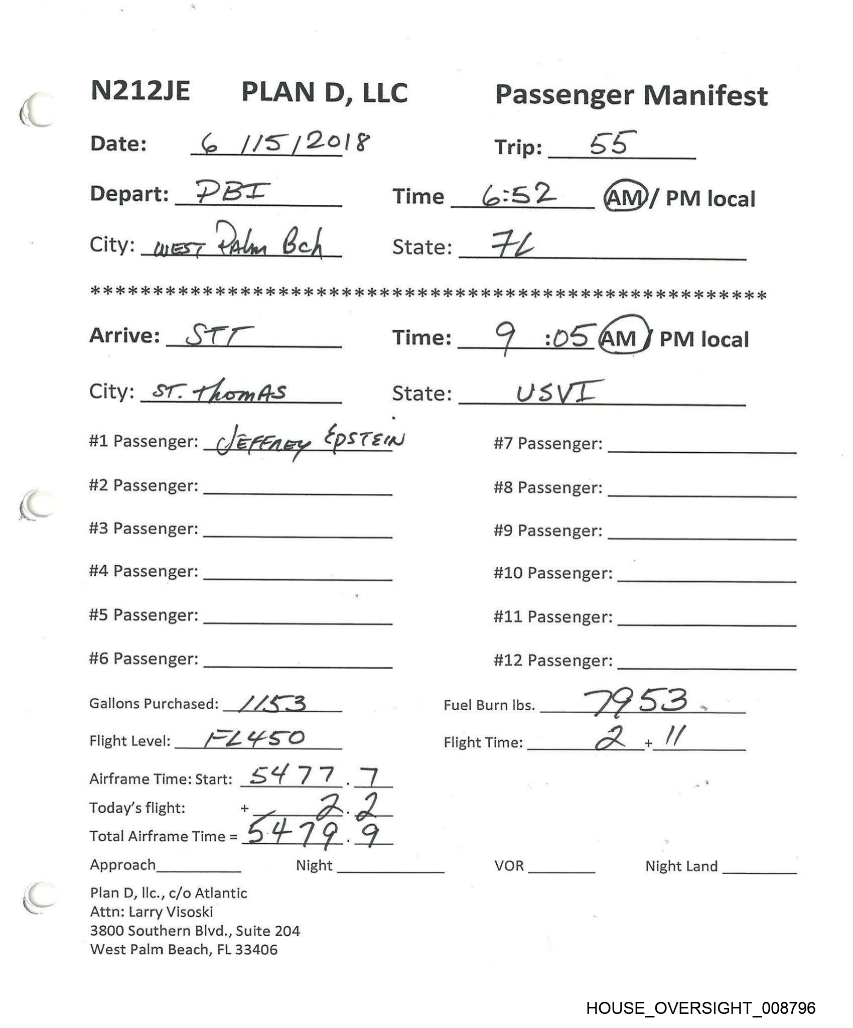 N212JE PLAN D, LLC Passenger Manifest