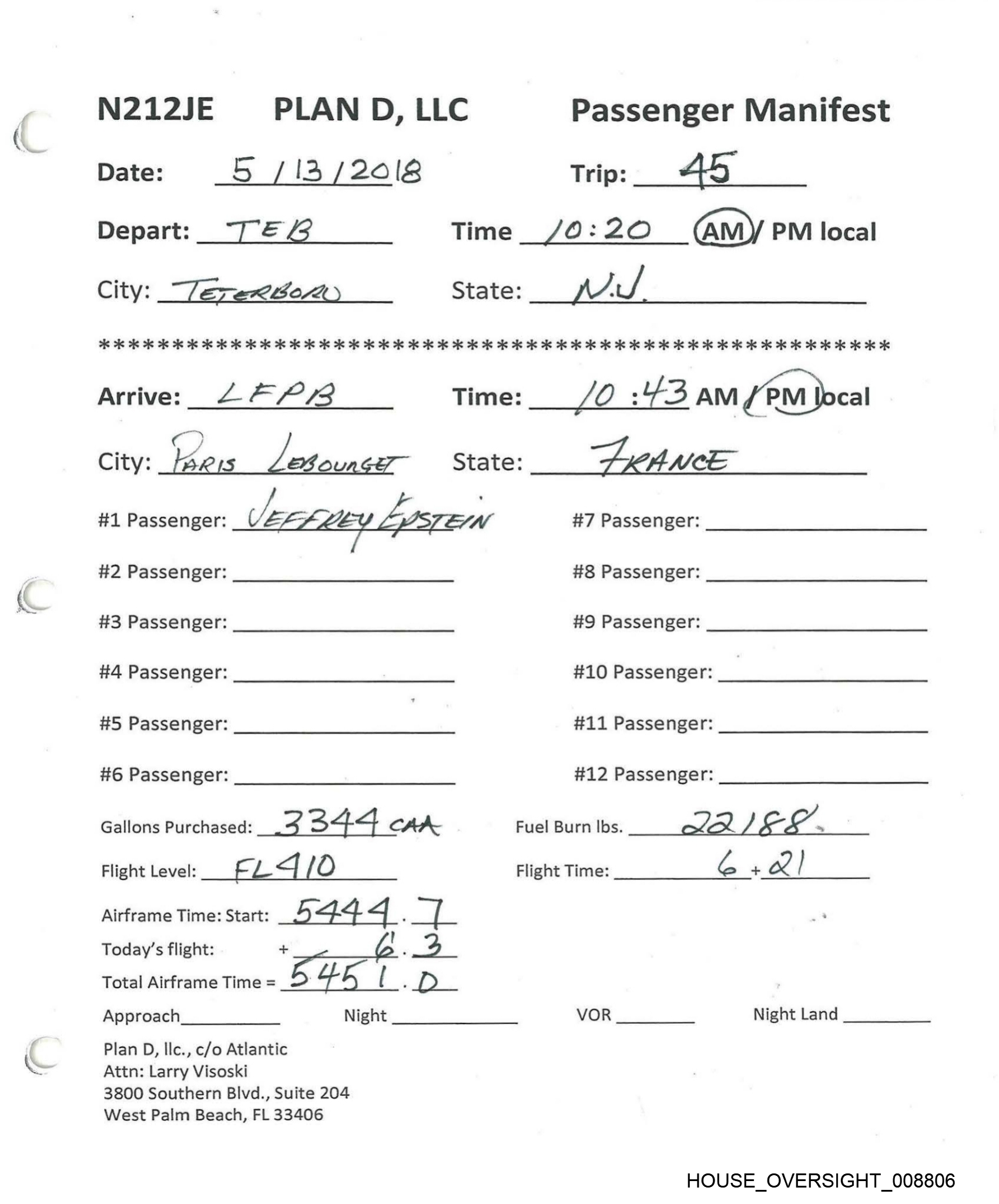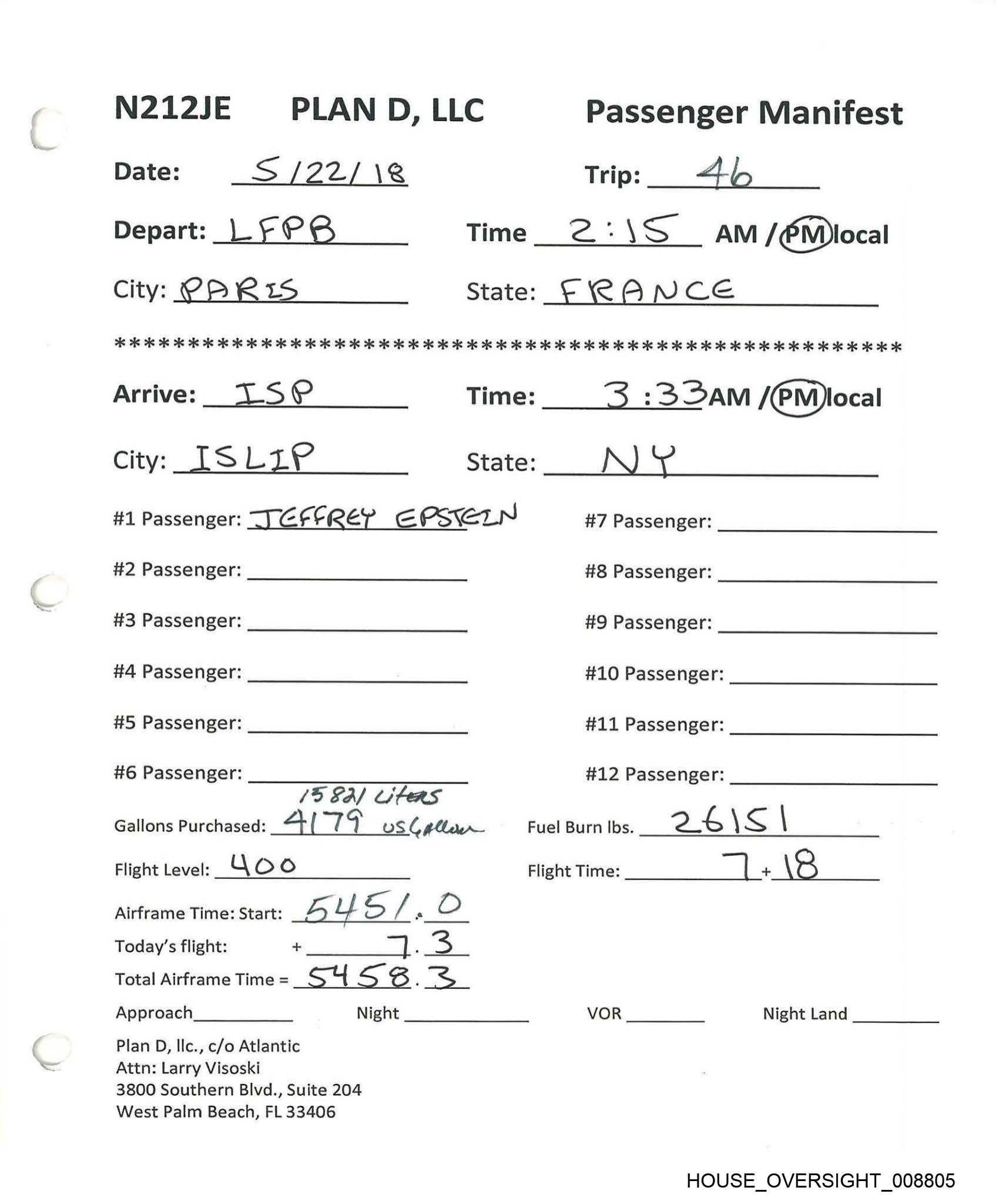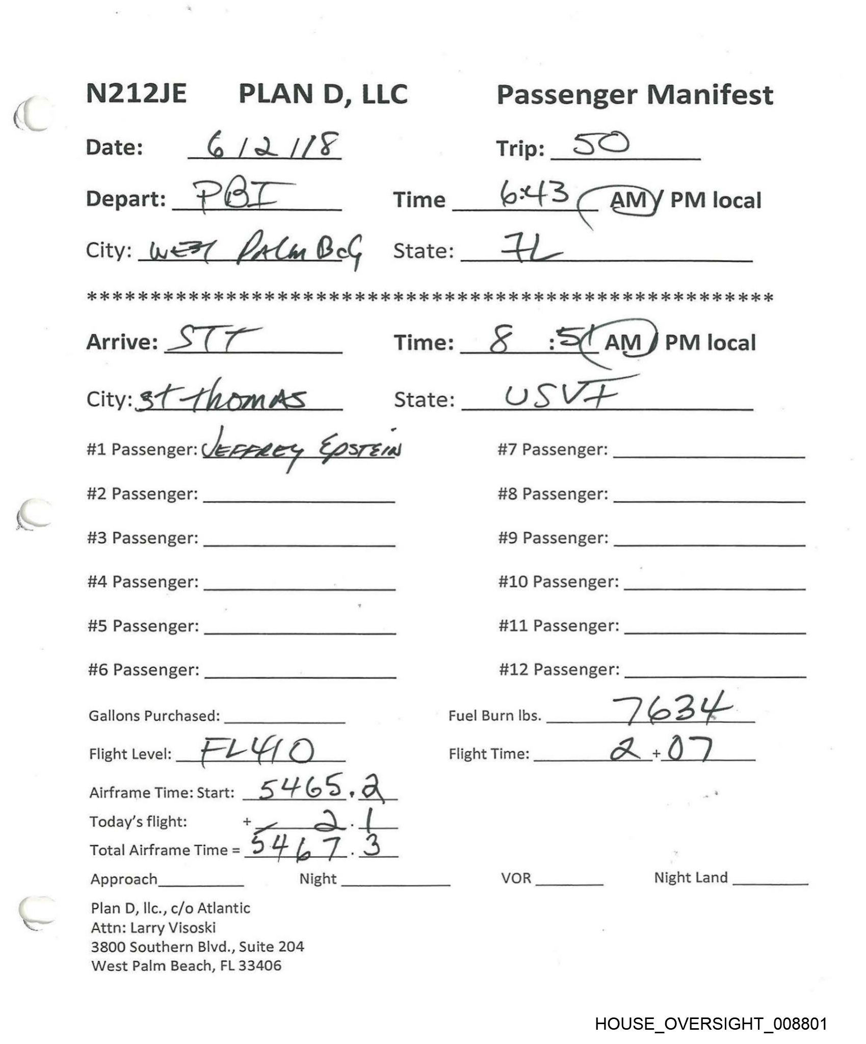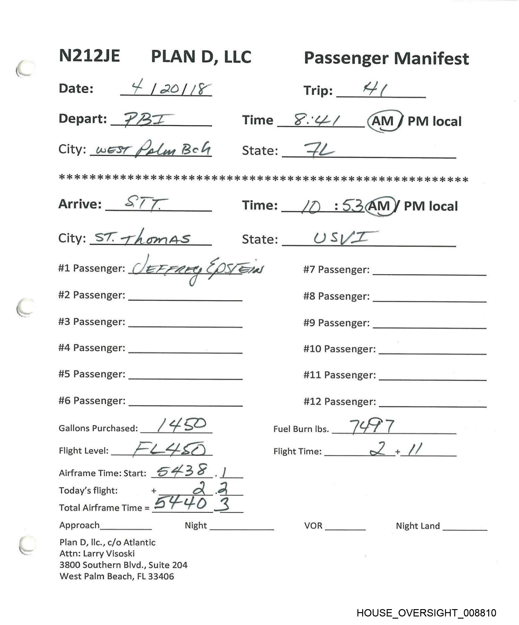 N212JE PLAN D, LLC Passenger Manifest