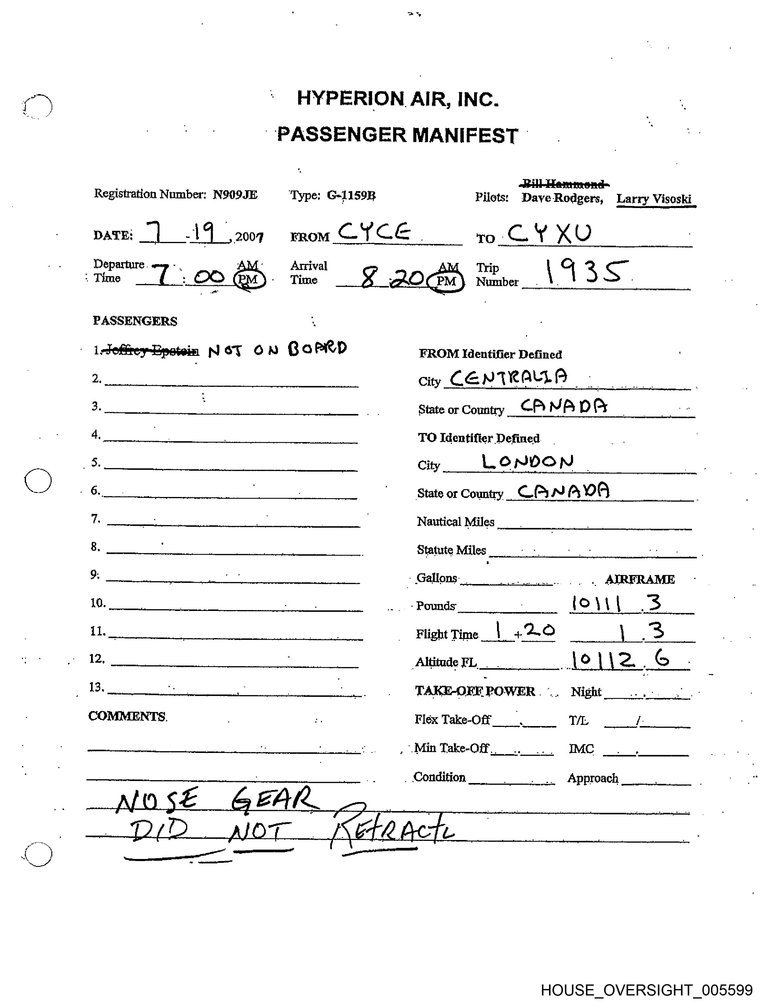 Registration Number: N909JE Type: G-LIS9B Pilcts: . Daye Rodgers# Larry Visoski