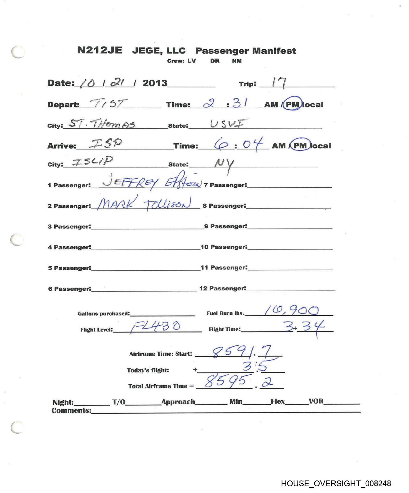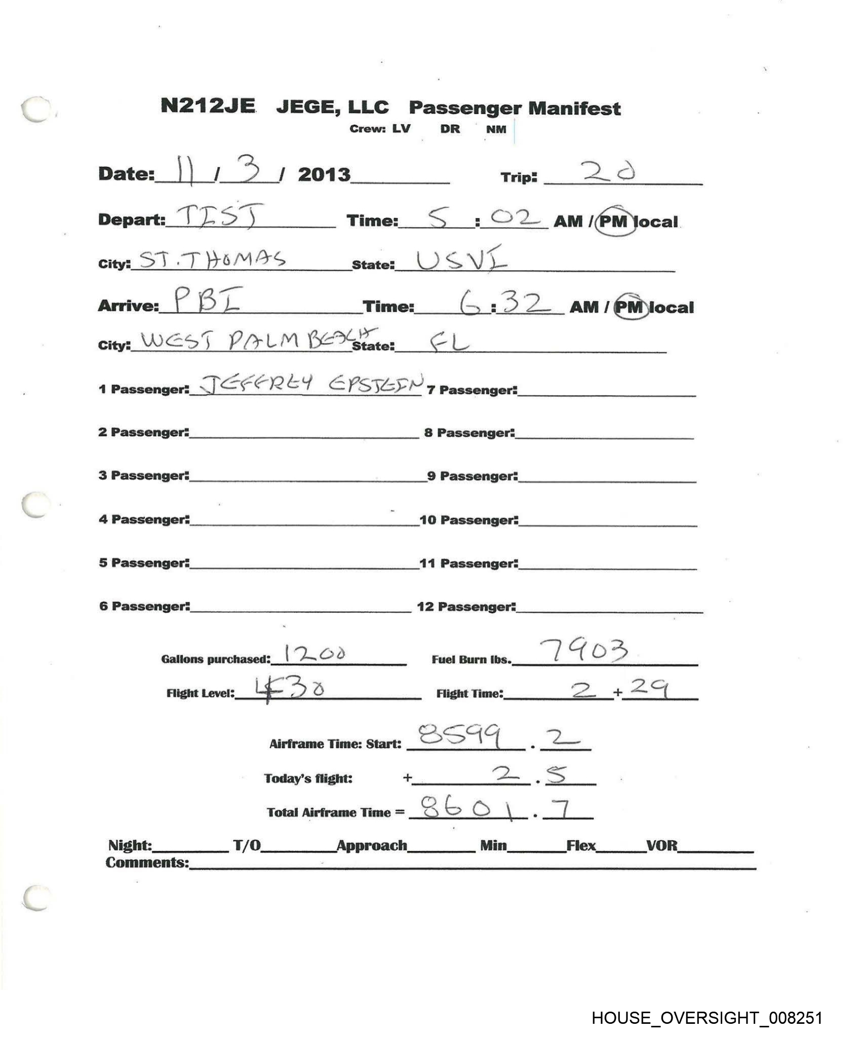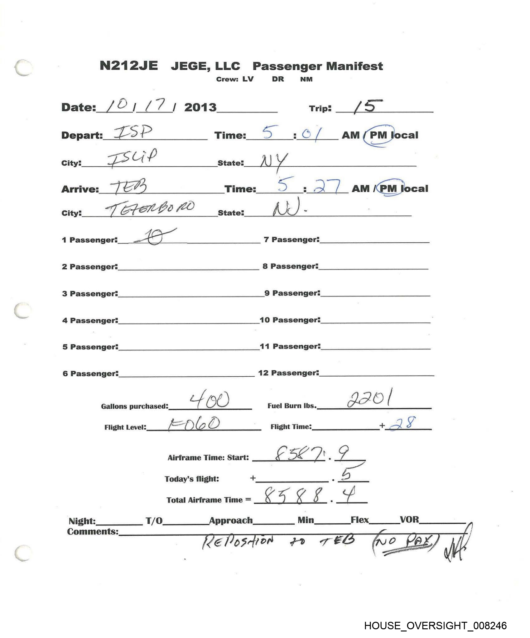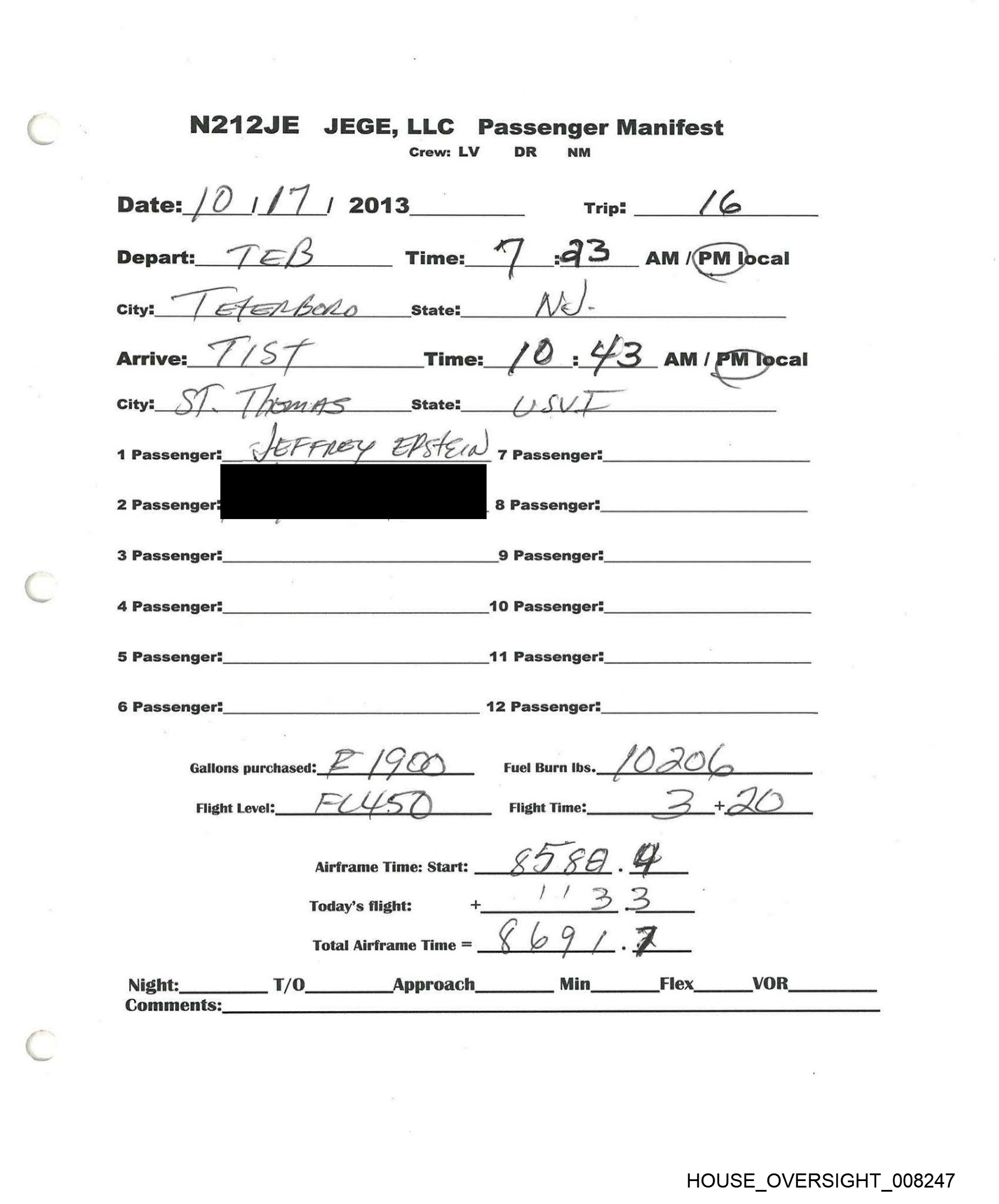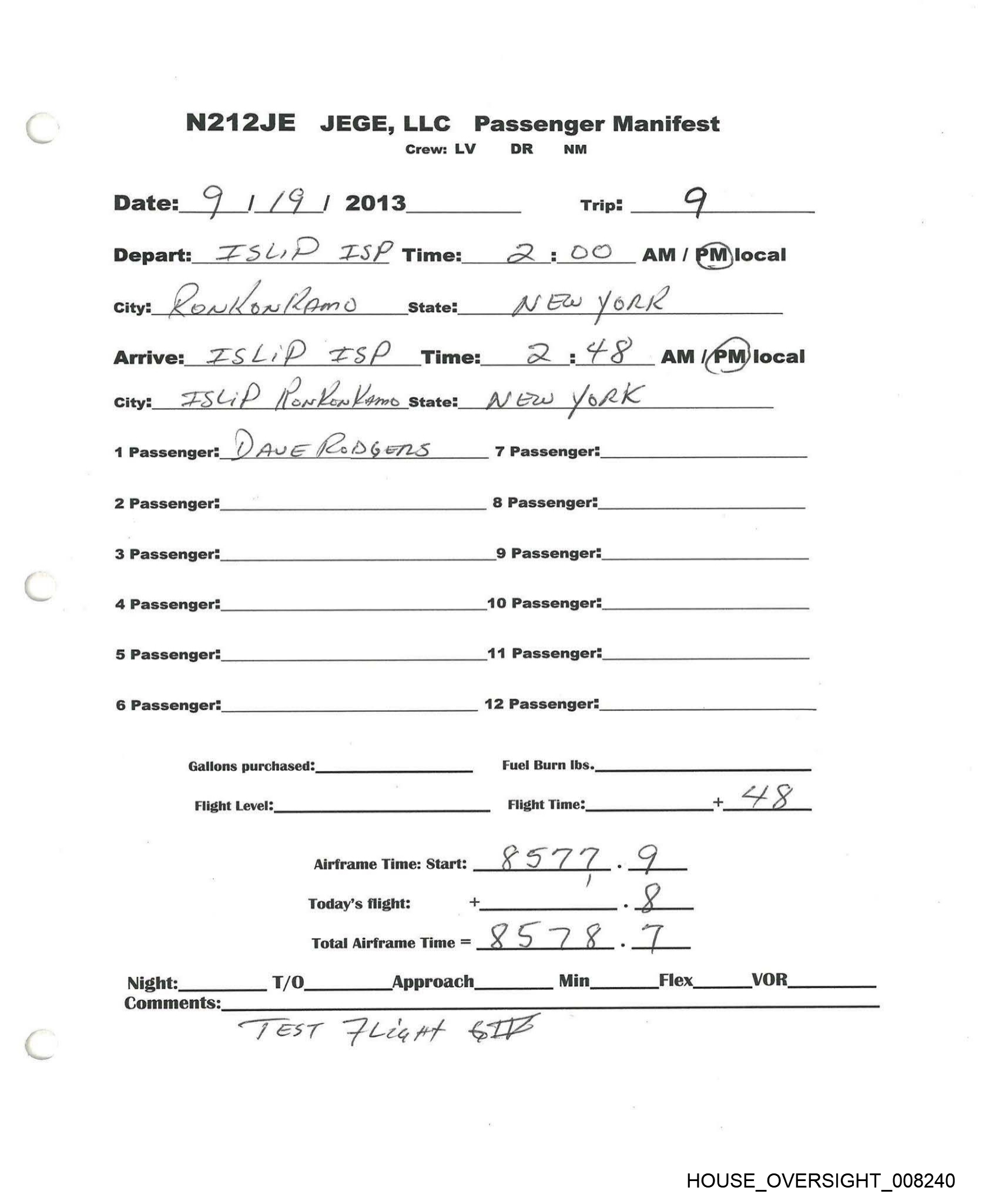 N212JE JEGE,LLC Passenger Manifest