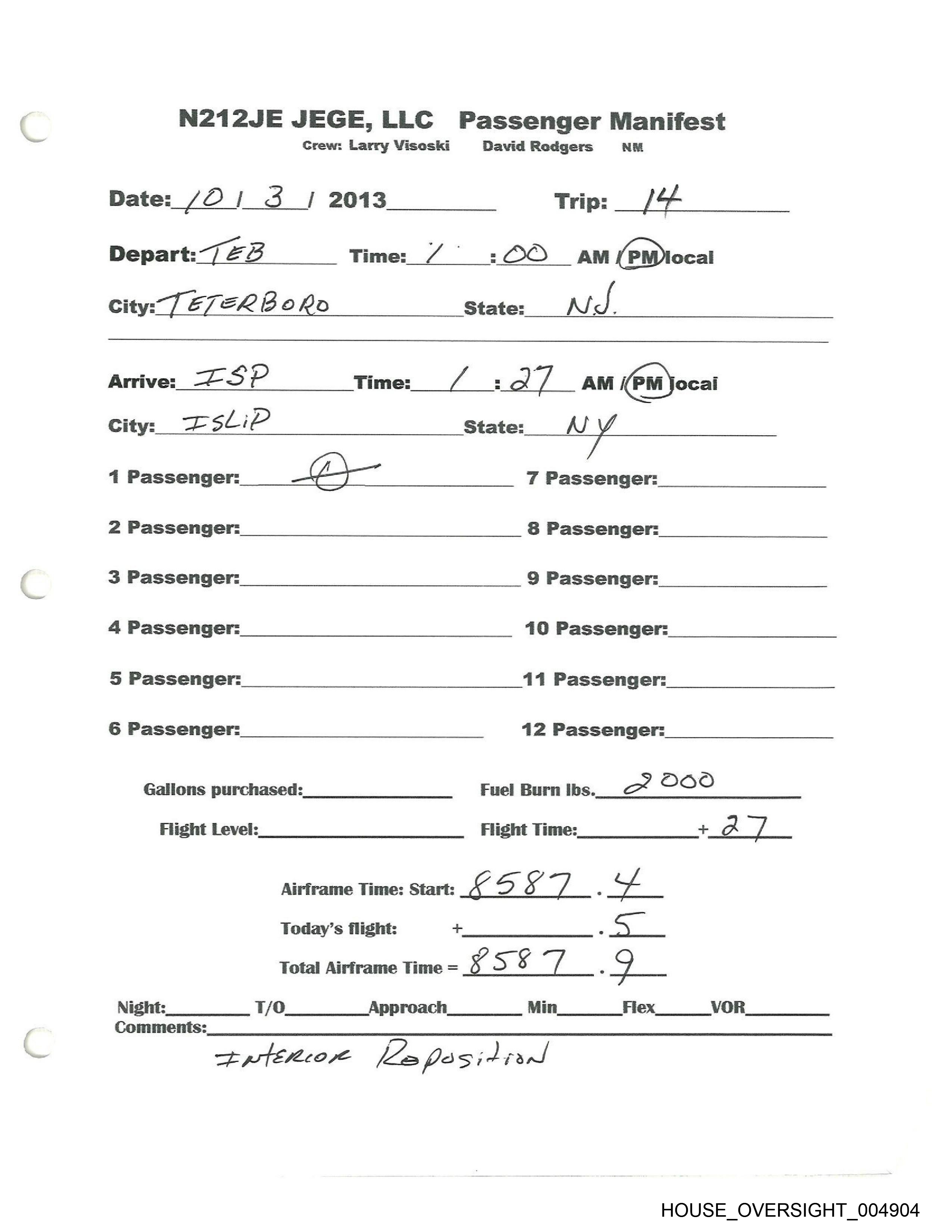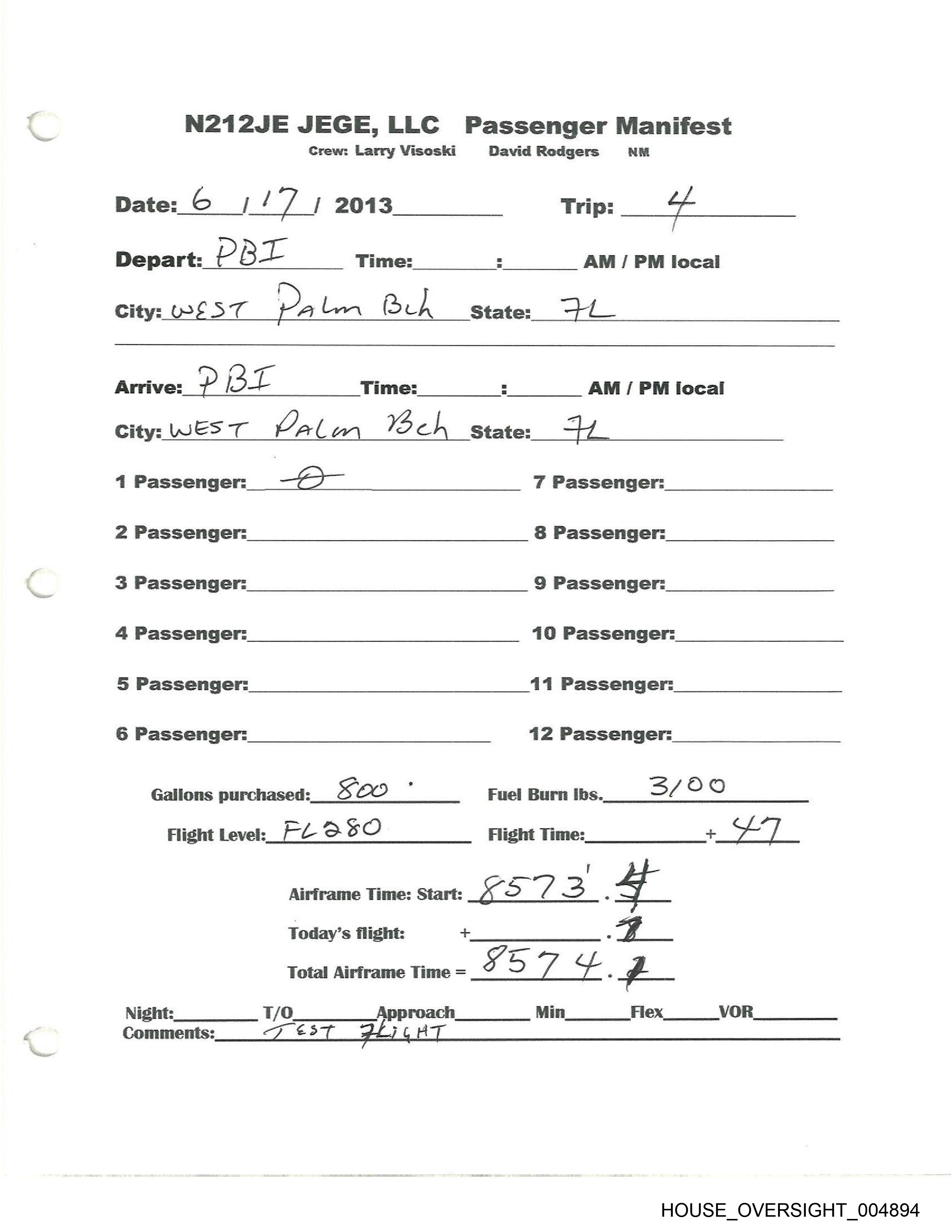 N212JE JEGE,LLC Passenger Manifest Crew: Larry Visoski David Rodgers NM Date: 10 /2%) 2074 Trip: \)8 Depart: | LST Time: 6 :36 (SS) PM local City: ST. THeMAS State:_ OS V L Arrive: (ER Time:__|© : 2.2 @M) PM loca! city: [ETERB ORO state: NJ 1 Passenger: TECEREY CYSTELN 7 Passenger: 2 Passenger 8 Passenger: 3 Passenger: 9 Passenger: 4 Passenger: 10 Passenger: 5 Passenger: 11 Passenger: — 6 Passenger: 12 Passenger: Flight Level: "aes 2) _ Fight Time___*3 + Airframe Time: Start: CGU 2 .3 | Today’s flight: + a ne Sie 6 7 Night: 1/0 Approach___ Min Flex VOR Comments: HOUSE _OVERSIGHT_005007