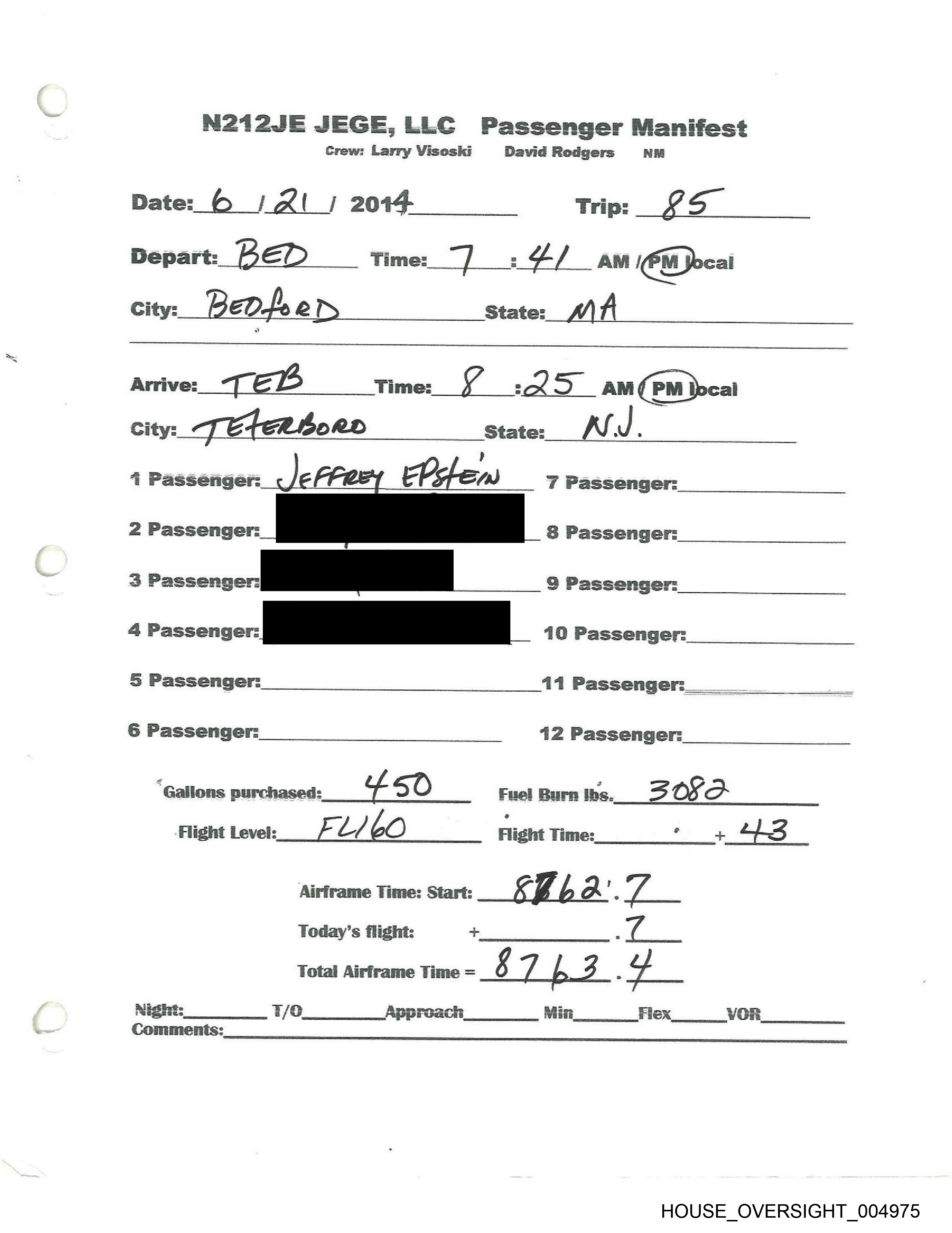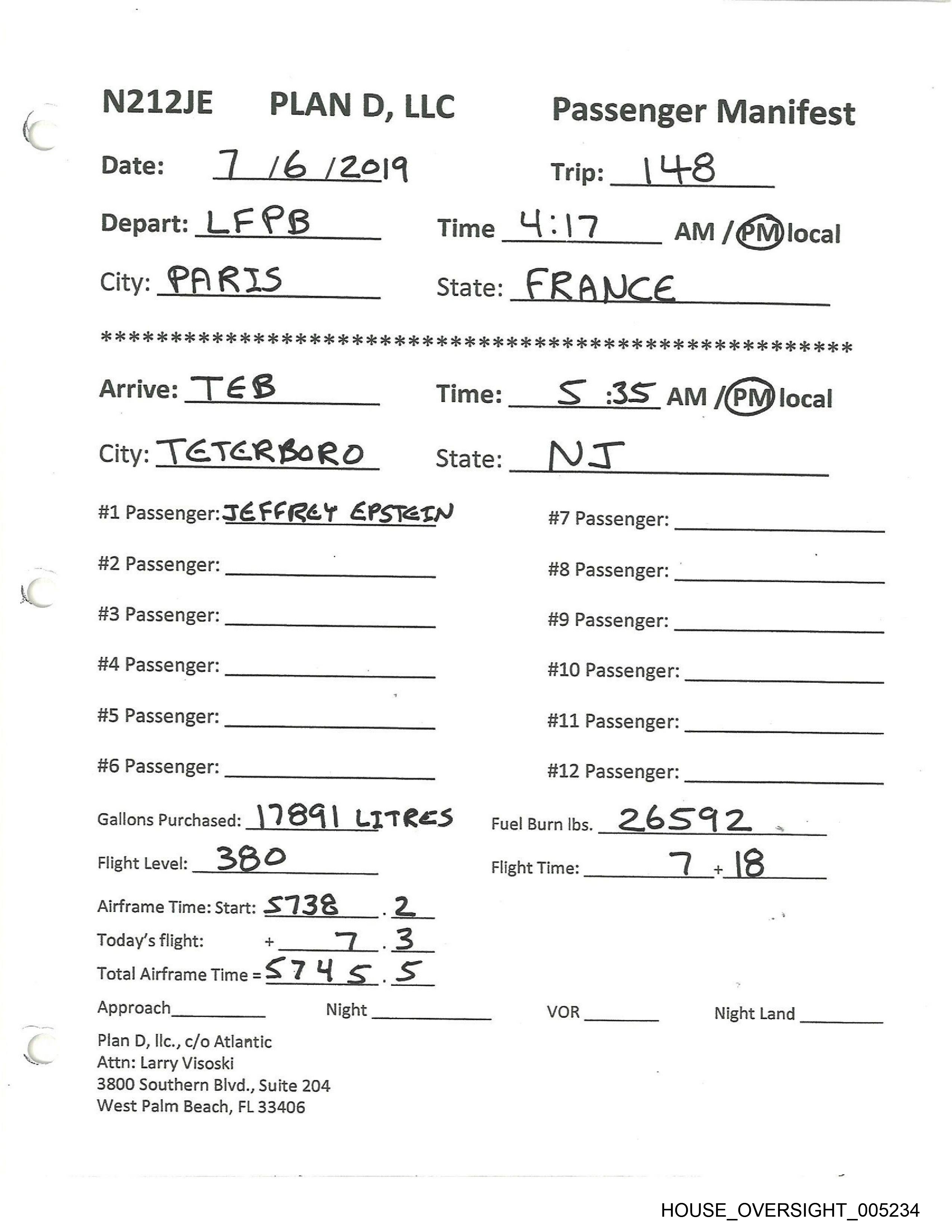 N212JE PLAND, LLC Passenger Manifest Date: | 6 [ZO |4 Trip: [4-8 Depart: LEP 8 Time 4: teh ek AM /€M)locat City: PA KRiS State: F R FY a Ee 8 78 8 OR 2B 28 oR OR A oe RK ER RA EAR EERE RK RRR KKKKKERKRRKK EES Arrive: rES | Time: S 3S AM /@N) local City: JETER BRO State: [NI #1 Passenger: JEFFIREY EPSTEIN #7 Passenger: eee #2 Passenger: #8 Passenger: _ #3 Passenger: #9 Passenger: #4 Passenger: #10 Passenger: #5 Passenger: #11 Passenger: #6 Passenger: #12 Passenger: Gallons Purchased: \ oha| | LITRES Fuel Burn lbs. 2654 - 2 Flight Level: 3B0 Flight Time: “l + | S | Airframe Time: Start: S138 , a Today’s flight: + 7.3. Total Airframe Time = g q uf Ss . Ss Approach Night VOR Night Land Plan D, Ilc., c/o Atlantic Attn: Larry Visoski 3800 Southern Blvd., Suite 204 West Palm Beach, FL 33406 —_ HOUSE_OVERSIGHT_005234