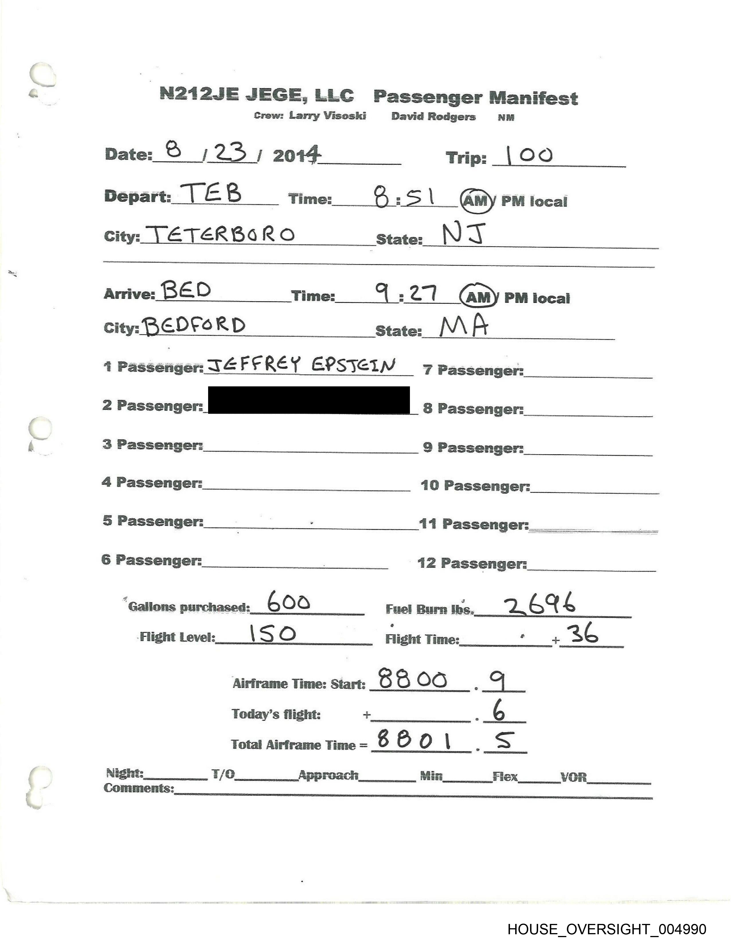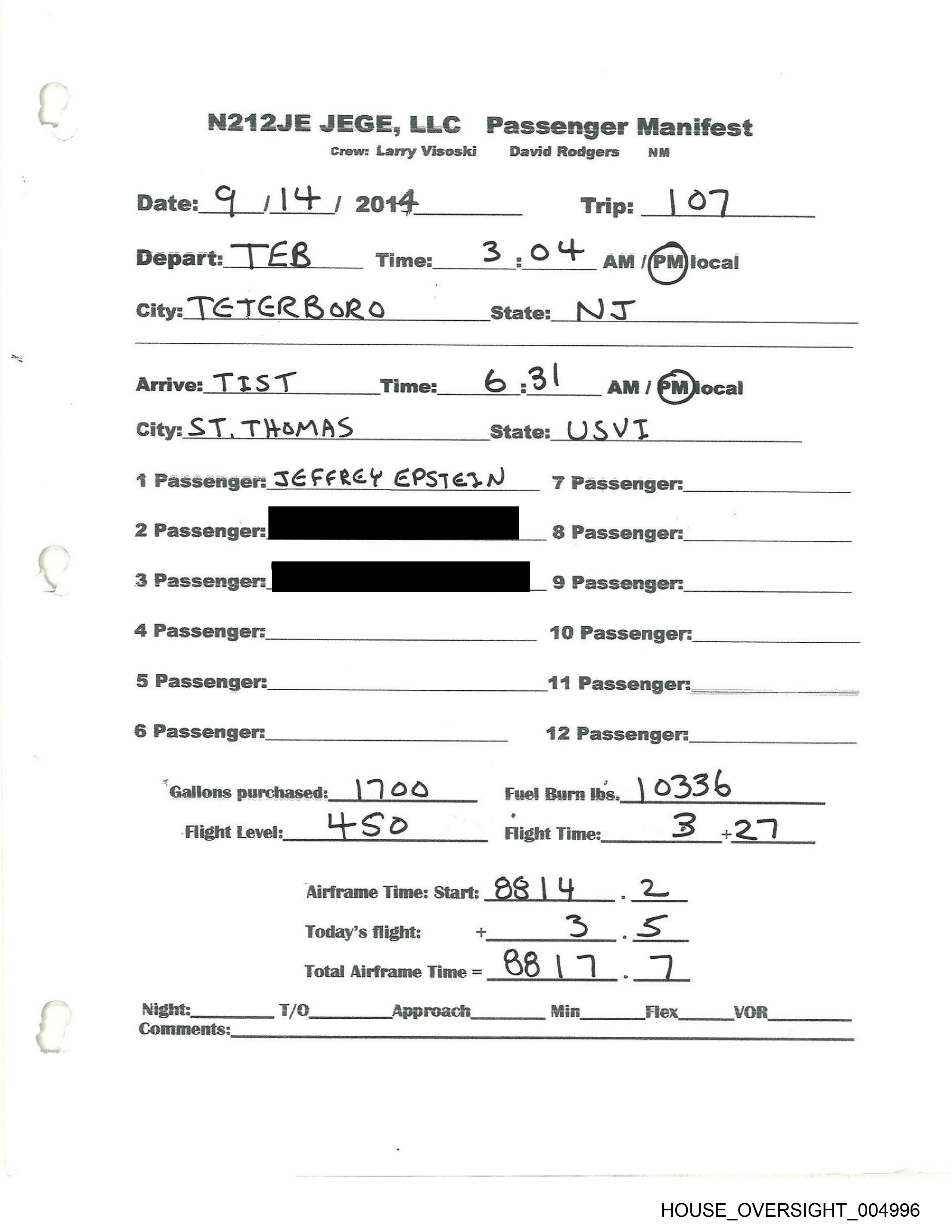 N212JE JEGE,LLC Passenger Manifest Crew: Larry Visoski David Rodgers NBM Date: 4 / bus / 2014- Trip: | O | Depart: ER Time: 5 -O si AM Im)tocat City: ETER OKO __ State NJ | Arrive: 1 TST Time: 6 oO | AM / €M)ocal City: ST, THOMAS State: USVI 4 Passenger: TCFERCY EPSTEIN 7 Passenger: z —— fF 8 Passenger: 3 Passenger: EE 9 Passenger: 4 Passenger: 10 Passenger: > Passenger: 11 Passenger: a 6 Passenger: 12 Passenger: “Gallons purchased: 17) Od Fuel Burn Ibs. 033 2 Fight teva; {SO Flight Time: 3 4.27 Today’s flight: + S . Ss Total Airframe Time = Bh ~ ‘ } Night: 1/8 Approach waida rlex YOR Comments: HOUSE_OVERSIGHT_004996