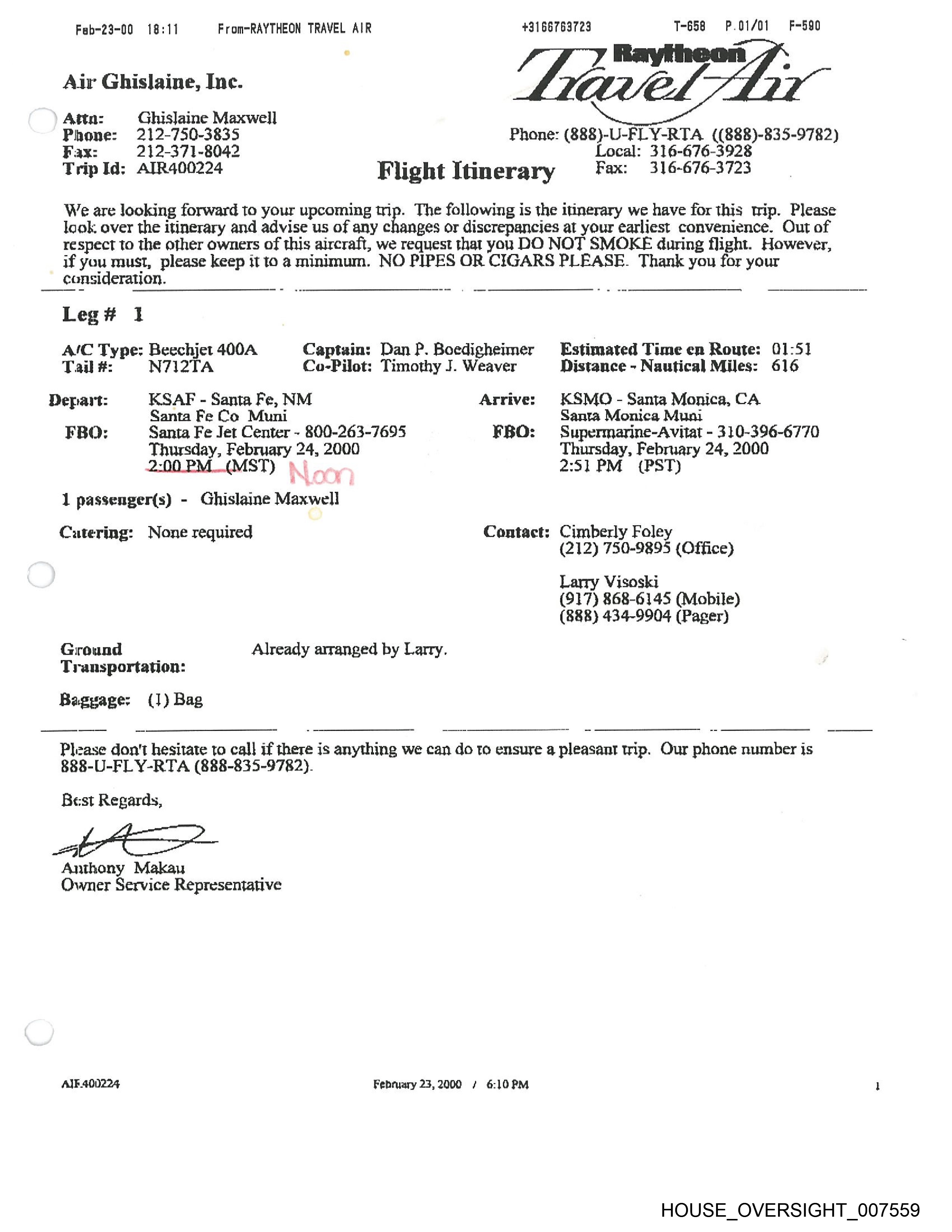 +3166763723 T-658 P.O1/01 F590 Fab-23-00 18:11 From-RAYTHEON TRAVEL AIR Air Ghislaine, Inc. Attn: Ghislaine Maxwell Phone: 212-750-3835 Phone: (888)-U-FLY-RTA ((888)-835-9782) Fax: 242-371-8042 Local: 316-676-3928 Trip Id; ATR400224 Fax: 316-676-3723 Flight Itinerary We are looking forward to your upcoming trip. The following is the itinerary we have for this wip. Please look. over the itinerary and advise us of any changes or discrepancies at your earliest convenience. Out of respect to the other owners of this aircraft, we request that youn DO NOT SMOKE during flight. However, if you must, please keep it to a minimum. NO PIPES OR CIGARS PLEASE. Thank you for your consideration. Lleg# 1 = om ‘ a ° SY AIC Type: Beechjet 400A Captain: Dan P. Boedigheimer Estimated Time en Route: 01:51 Taal #: N7VI2ZTA Co-Pilot: Timothy J. Weaver Distance - Nautical Miles: 616 Depart: KSAF - Santa Fe, NM Arrive: KSMO - Santa Monica, CA Santa Fe Co Muni Santa Monica Muni FBO: Santa Fe Jet Center ~ 800-263-7695 FBO: Supermarine-Avitat - 310-396-6770 Thursday, February 24, 2000 Thursday, February 24, 2000 2:00. PM_ (MST) 2:51 PM {PST) ———————————s 1 passenger(s) - Ghislaine Maxwell Catering: None required Contact: Cimberly Foley (212) 750-9895 (Office) Larry Visoski (917) 868-6145 (Mobile) (888) 434-9904 (Pager) Ground Already arranged by Larry. Transportation: Baggage: (J) Bag — a ee - ——————s Please don't hesitate to call if there is anything we can do to ensure a pleasant tri