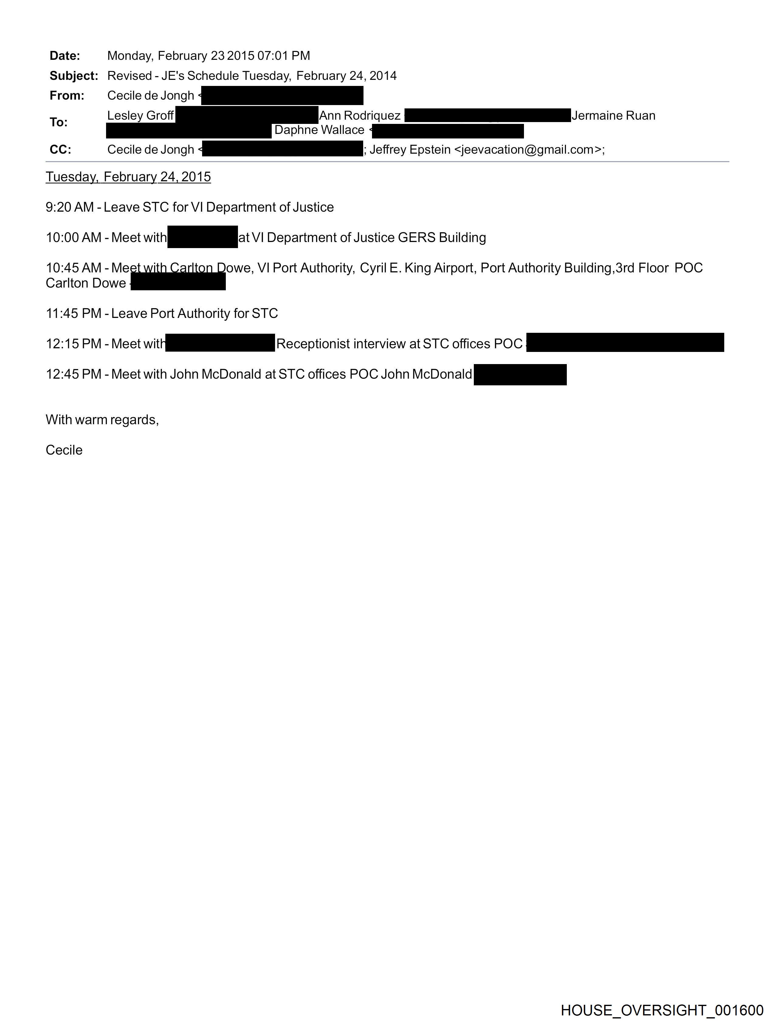 Date: Monday, February 23 2015 07:01 PM Subject: Revised - JE's Schedule Tuesday, February 24, 2014 1. Lesley Groff Ann Rocique7 i ermaine Ruan O: Daphne Wallace _jiiiaaaa CC: Cecile de Jongh ee. Jeffrey Epstein <jeevacation@gmail.com>; Tuesday, February 24, 2015 9:20 AM - Leave STC for VI Department of Justice 10:00 AM - Meet with NNER at VI Department of Justice GERS Building 10:45 AM - ———* VI Port Authority, Cyril E. King Airport, Port Authority Building,3rd Floor POC Carlton Dowe 11:45 PM - Leave Port Authority for STC 12:15 PM - Meet wit iil Receptionist interview at STC offices POC 12:45 PM - Meet with John McDonald at STC offices POC John McDonald [iin With warm regards, Cecile HOUSE_OVERSIGHT_001600