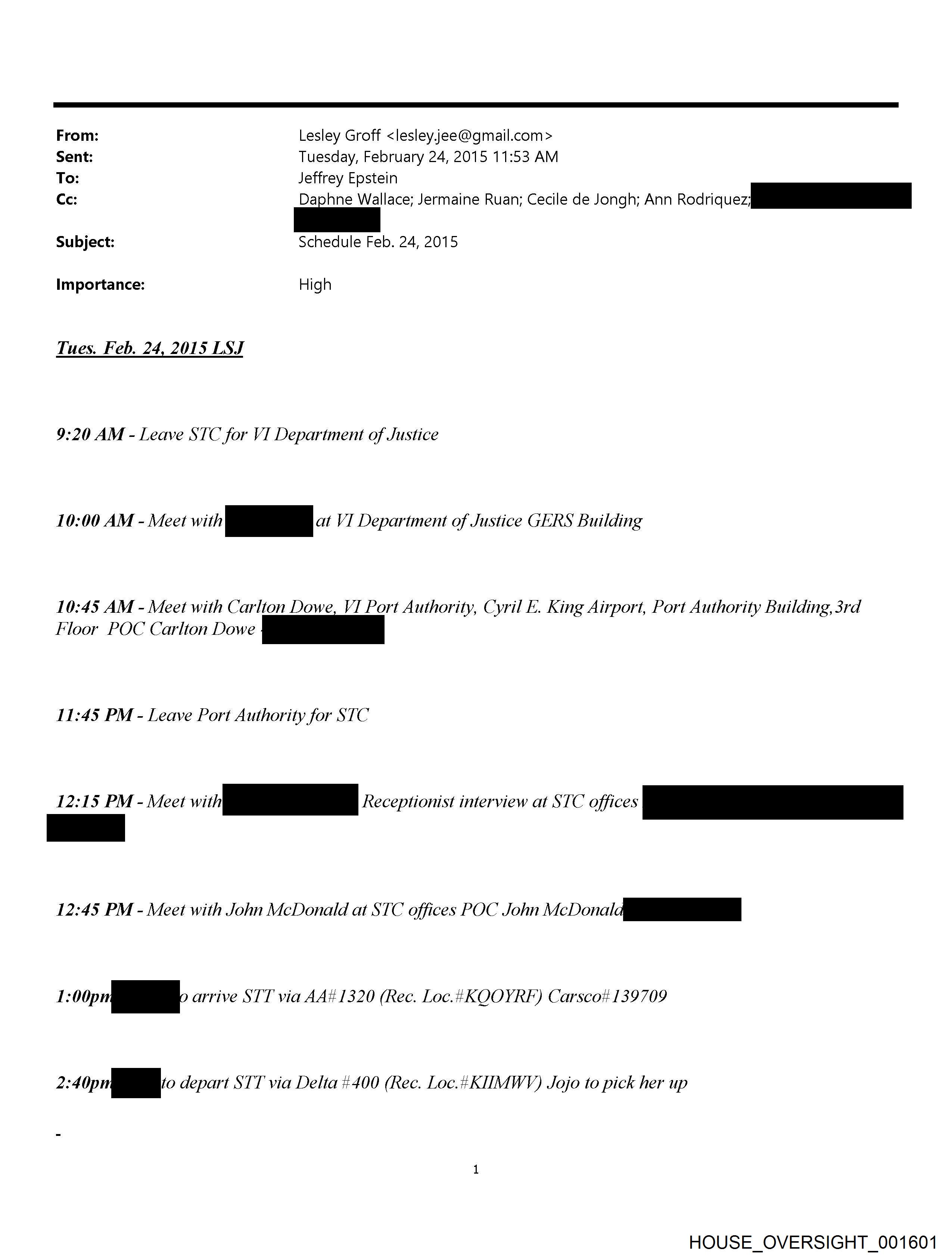From: Lesley Groff <lesley.jee@qmail.com> Sent: Tuesday, February 24, 2015 11:53 AM To: Jeffrey Epstein Ce: a Wallace; Jermaine Ruan; Cecile de Jongh; Ann Peciriq ice Subject: Schedule Feb. 24, 2015 Importance: High Tues. Feb. 24, 2015 LSJ 9:20 AM - Leave STC for VI Department of Justice 10:00 AM - Meet with a at VI Department of Justice GERS Building 10:45 AM - Meet with Carlton Dowe, VI Port Authority, Cyril E. King Airport, Port Authority Building, 3rd Floor POC Carlton Dowe rT 11:45 PM - Leave Port Authority for STC 12:15 PM - Meet i Receptionist interview at STC offices a 12:45 PM - Meet with John McDonald at STC offices POC John Vin k—i I op —, arrive STT via AA# 1320 (Rec. Loc.t¢KOOYRF) Carsco# 139709 2:40pn i 0 depart STT via Delta #400 (Rec. Loc.4¢KIHIMWYV) Jojo to pick her up HOUSE_OVERSIGHT_001601