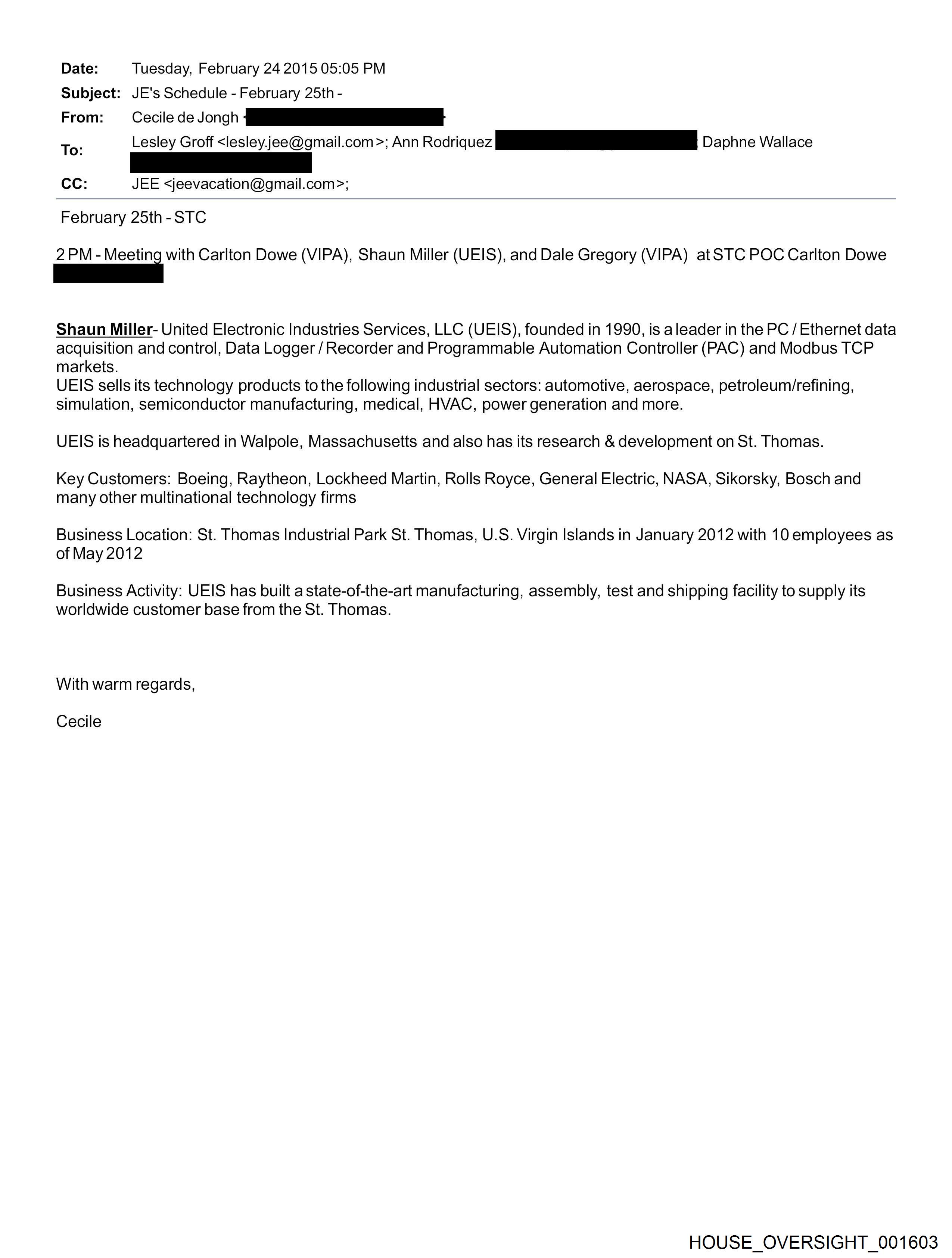 Date: Tuesday, February 24 2015 05:05 PM Subject: JE's Schedule - February 25th - From: Cecile de Jongh To: Lesley Groff <lesley.jee@gmail.com >; Ann Rodriquez P| Daphne Wallace CC: JEE <jeevacation@gmail.com>; February 25th-STC 2PM- — with Carlton Dowe (VIPA), Shaun Miller (UEIS), and Dale Gregory (VIPA) at STC POC Carlton Dowe Shaun Miller- United Electronic Industries Services, LLC (UEIS), founded in 1990, is aleader in the PC / Ethernet data acquisition and control, Data Logger / Recorder and Programmable Automation Controller (PAC) and Modbus TCP markets. UEIS sells its technology products to the following industrial sectors: automotive, aerospace, petroleum/refining, simulation, semiconductor manufacturing, medical, HVAC, power generation and more. UEIS is headquartered in Walpole, Massachusetts and also has its research & development on St. Thomas. Key Customers: Boeing, Raytheon, Lockheed Martin, Rolls Royce, General Electric, NASA, Sikorsky, Bosch and many other multinational technology firms Business Location: St. Thomas Industrial Park St. Thomas, U.S. Virgin Islands in January 2012 with 10 employees as of May 2012 Business Activity: UEIS has built a state-of-the-art manufacturing, assembly, test and shipping facility to supply its worldwide customer base from the St. Thomas. With warm regards, Cecile HOUSE_OVERSIGHT_001603
