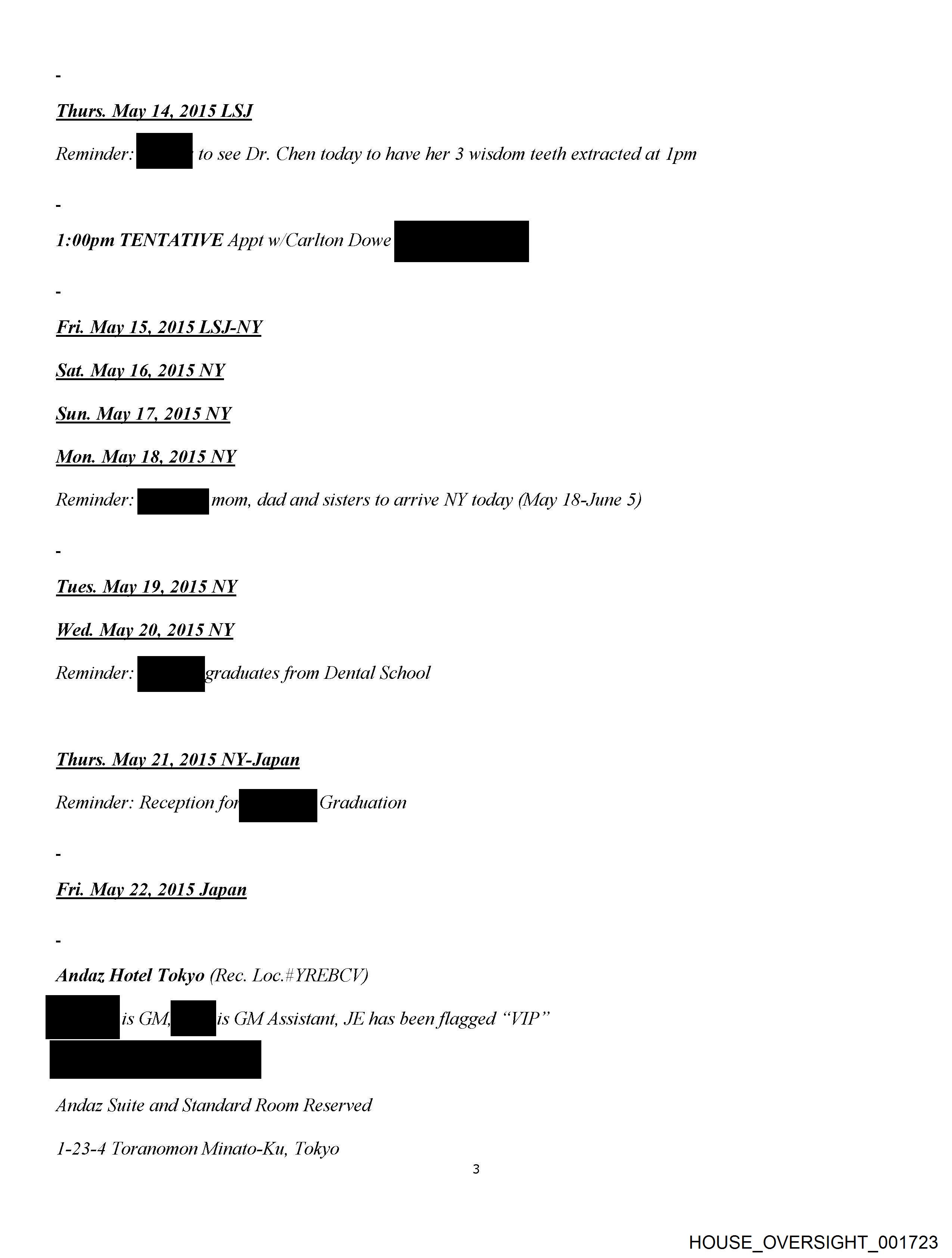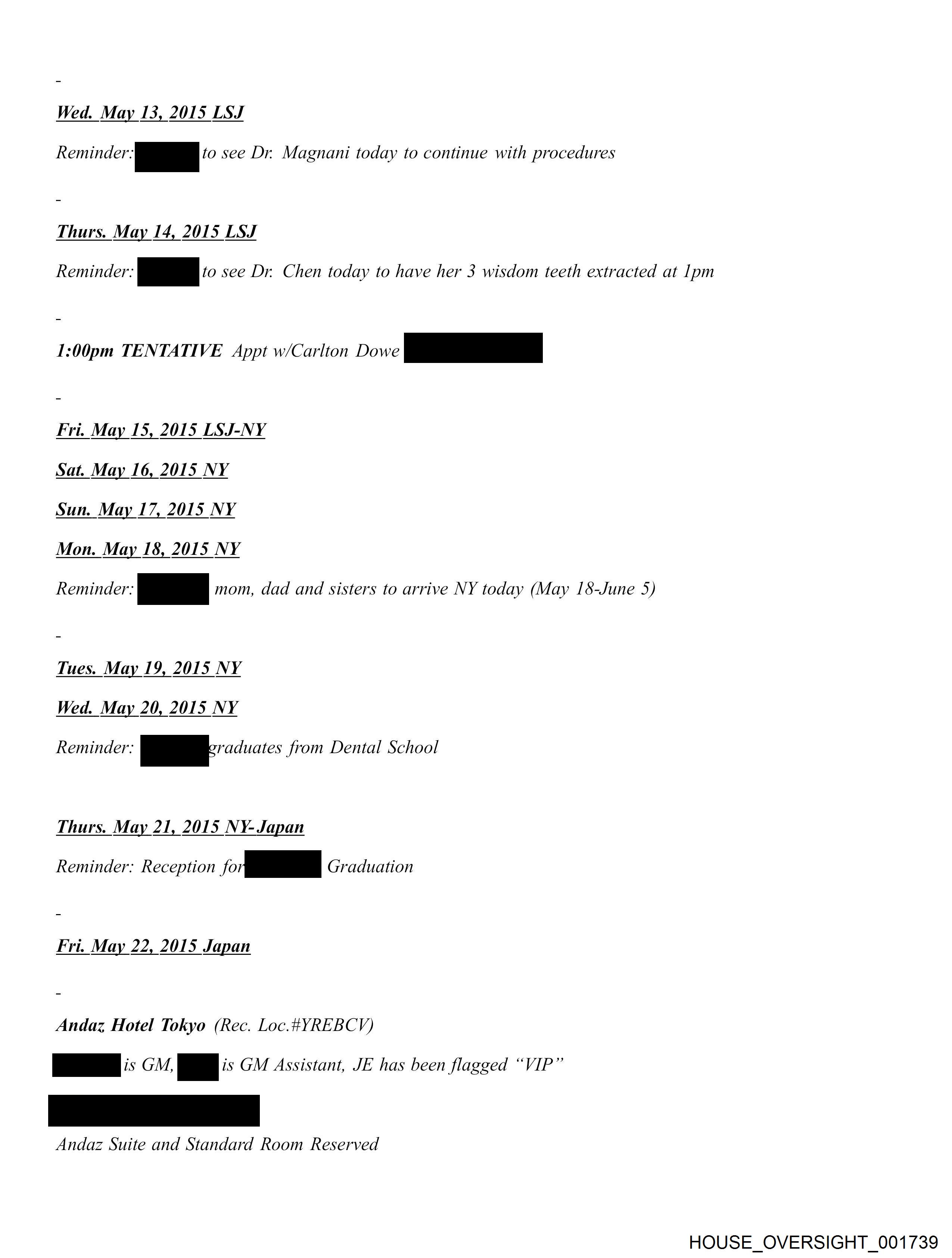 Wed. May 13, 2015 LSJ Reminder. i to see Dr. Magnani today to continue with procedures Thurs. May 14, 2015 LSJ Reminder: MM 10 see Dr. Chen today to have her 3 wisdom teeth extracted at lpm 1:00pm TENTATIVE Appt w/Carlton Dowe a Fri. May 15, 2015 LSJ-NY Sat. May 16, 2015 NY Sun. May 17, 2015 NY Mon. May 18, 2015 NY Reminder: mom, dad and sisters to arrive NY today (May 1I8-June 5) Tues. May 19, 2015 NY Wed. May 20, 2015 NY Reminder: RR acuates from Dental School Thurs. May 21, 2015 NY- Japan Reminder: Reception nh Graduation Fri. May 22, 2015 Japan Andaz Hotel Tokyo (Rec. Loc.4YREBCYV) ae i: GM, | GM Assistant, JE has been flagged “VIP” Andaz Suite and Standard Room Reserved HOUSE_OVERSIGHT_001739