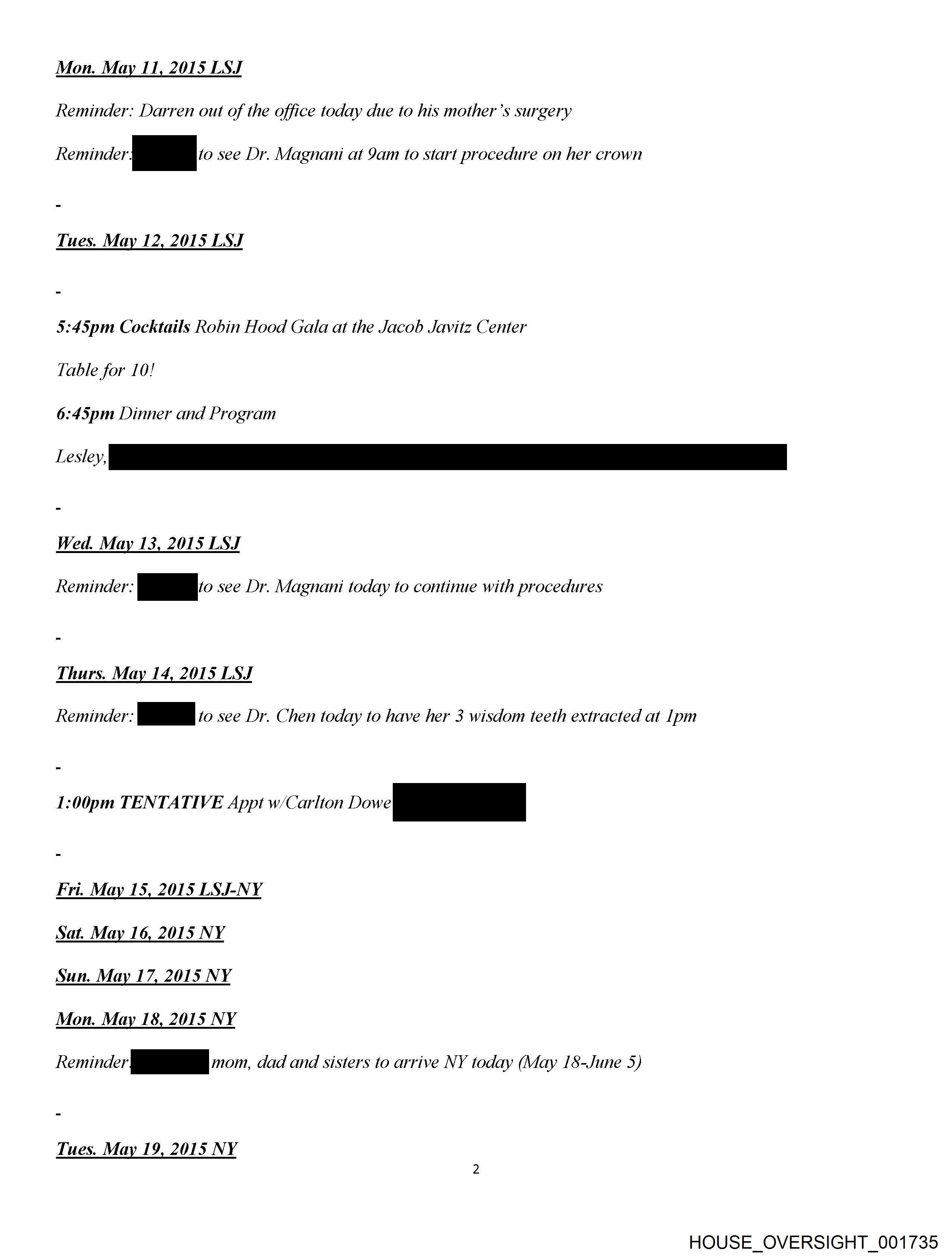 Sat. May 9, 2015 LSJ?? Reminder: a sons Bar Mitzvah at 5:30pm Sun. May 10, 2015 LSJ Mon. May 11, 2015 LSJ Reminder: Darren out of the office today due to his mother’s surgery Reminder: wo see Dr. Magnani at Yam to start procedure on her crown Tues. May 12, 2015 LSJ 5:45pm Cocktails Robin Hood Gala at the Jacob Javitz Center Table for 10! 6:45pm Dinner and Program Wed. May 13, 2015 LSJ Reminder i to see Dr. Magnani today to continue with procedures Thurs. May 14, 2015 LSJ Reminder: (0 see Dr. Chen today to have her 3 wisdom teeth extracted at Ipm 1:00pm TENTATIVE Appt w/Carlton Dowe Fd Fri. May 15, 2015 LSJ-NY Sat. May 16, 2015 NY HOUSE_OVERSIGHT_001730