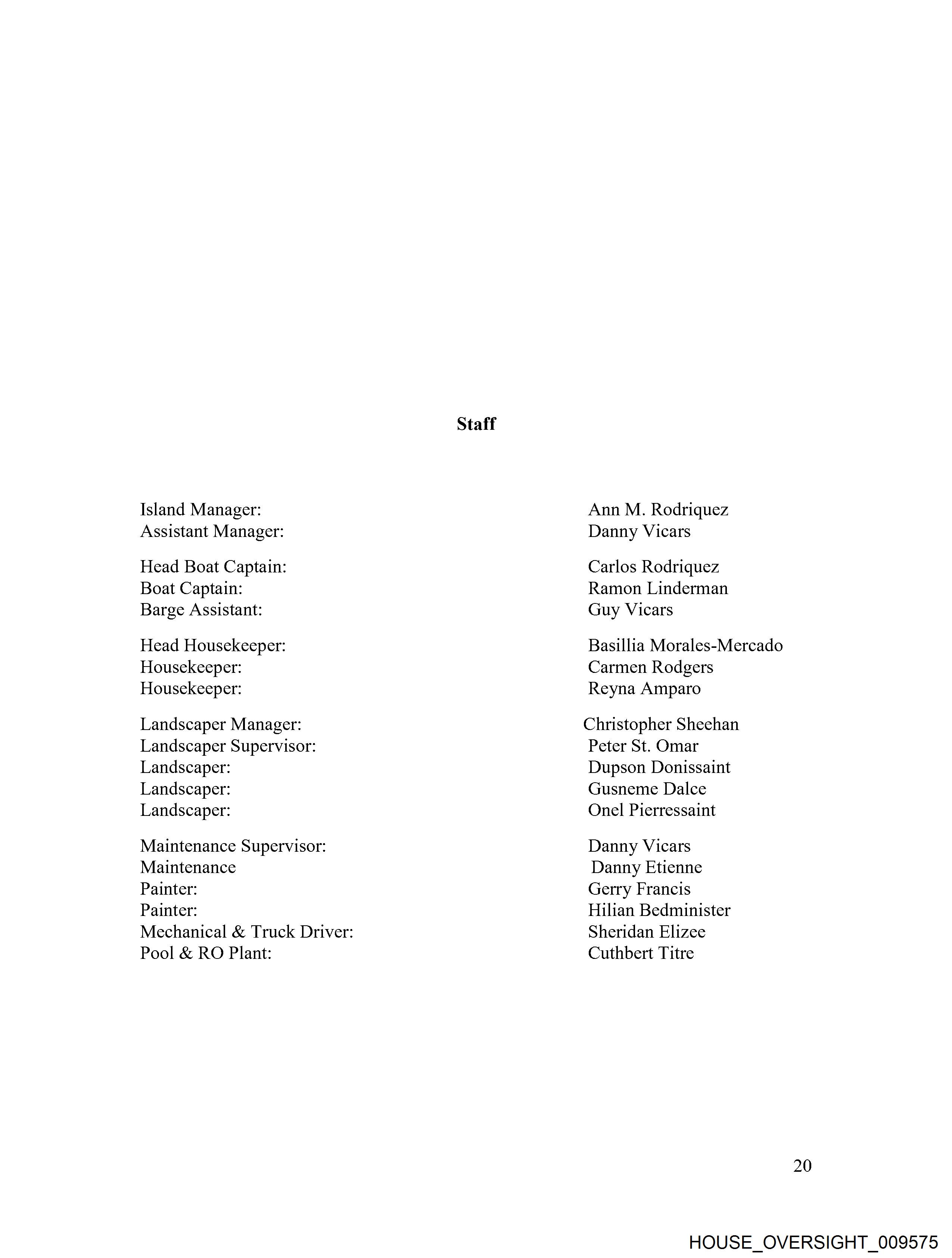 Island Manager: Assistant Manager: Head Boat Captain: Boat Captain: Barge Assistant: Head Housekeeper: Housekeeper: Housekeeper: Landscaper Manager: Landscaper Supervisor: Landscaper: Landscaper: Landscaper: Maintenance Supervisor: Maintenance Painter: Painter: Mechanical & Truck Driver: Pool & RO Plant: Staff Ann M. Rodriquez Danny Vicars Carlos Rodriquez Ramon Linderman Guy Vicars Basillia Morales-Mercado Carmen Rodgers Reyna Amparo Christopher Sheehan Peter St. Omar Dupson Donissaint Gusneme Dalce Onel Pierressaint Danny Vicars Danny Etienne Gerry Francis Hilian Bedminister Sheridan Elizee Cuthbert Titre 20 HOUSE_OVERSIGHT_009717