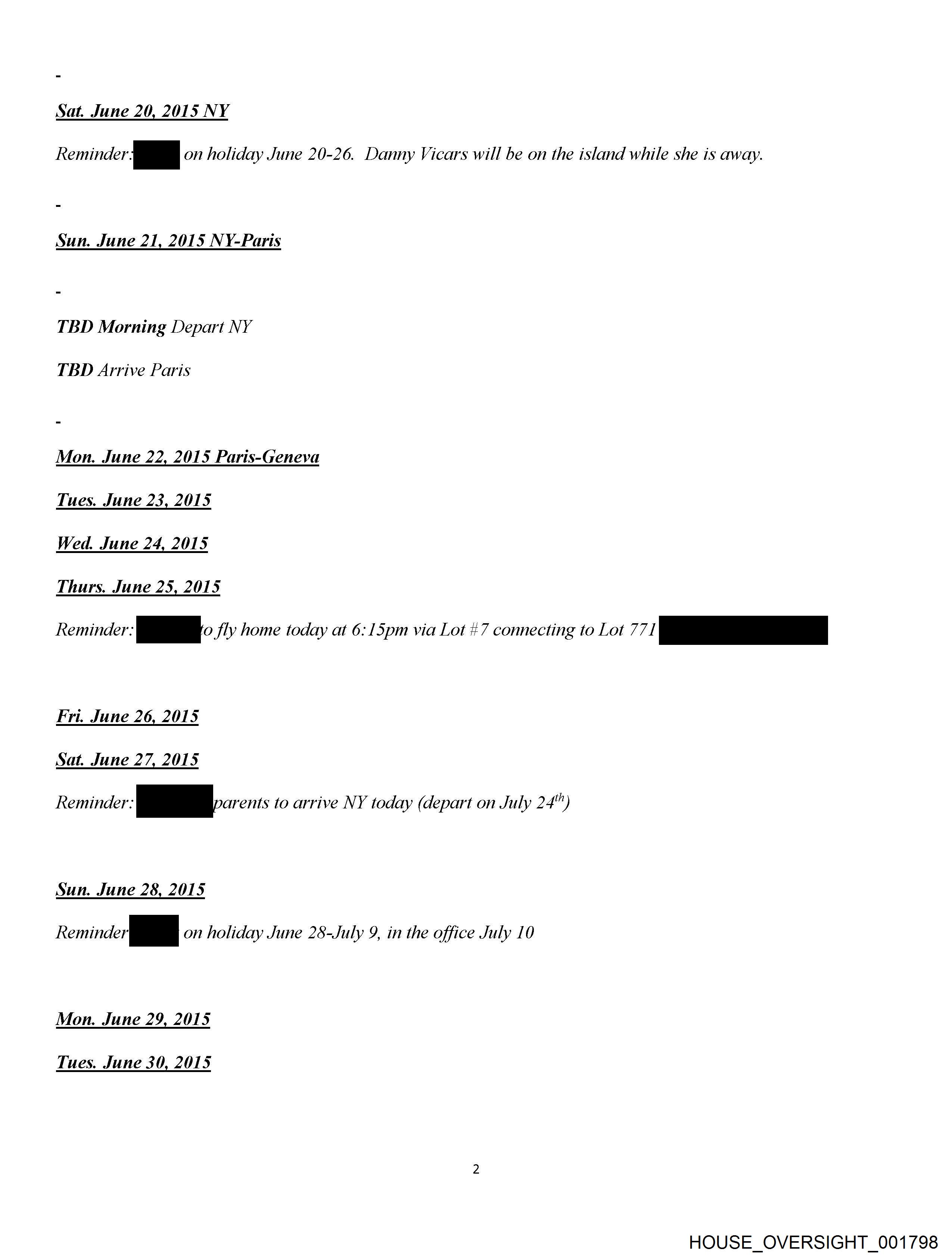 Sat. June 20, 2015 NY Reminder 7i/ on holiday June 20-26. Danny Vicars will be on the island while she is away. Sun. June 21, 2015 NY-Paris TBD Morning Depart NY TBD Arrive Paris Mon. June 22, 2015 Paris-Geneva Tues. June 23, 2015 Wed. June 24, 2015 Thurs. June 25, 2015 Reminder: ff fly home today at 6:15pm via Lot #7 connecting to Lot 771 pT Fri. June 26, 2015 Sat. June 27, 2015 Reminder: aa to arrive NY today (depart on July 24") Sun. June 28, 2015 Reminder} on holiday June 28-July 9, in the office July 10 Mon. June 29, 2015 Tues. June 30, 2015 HOUSE_OVERSIGHT_001798