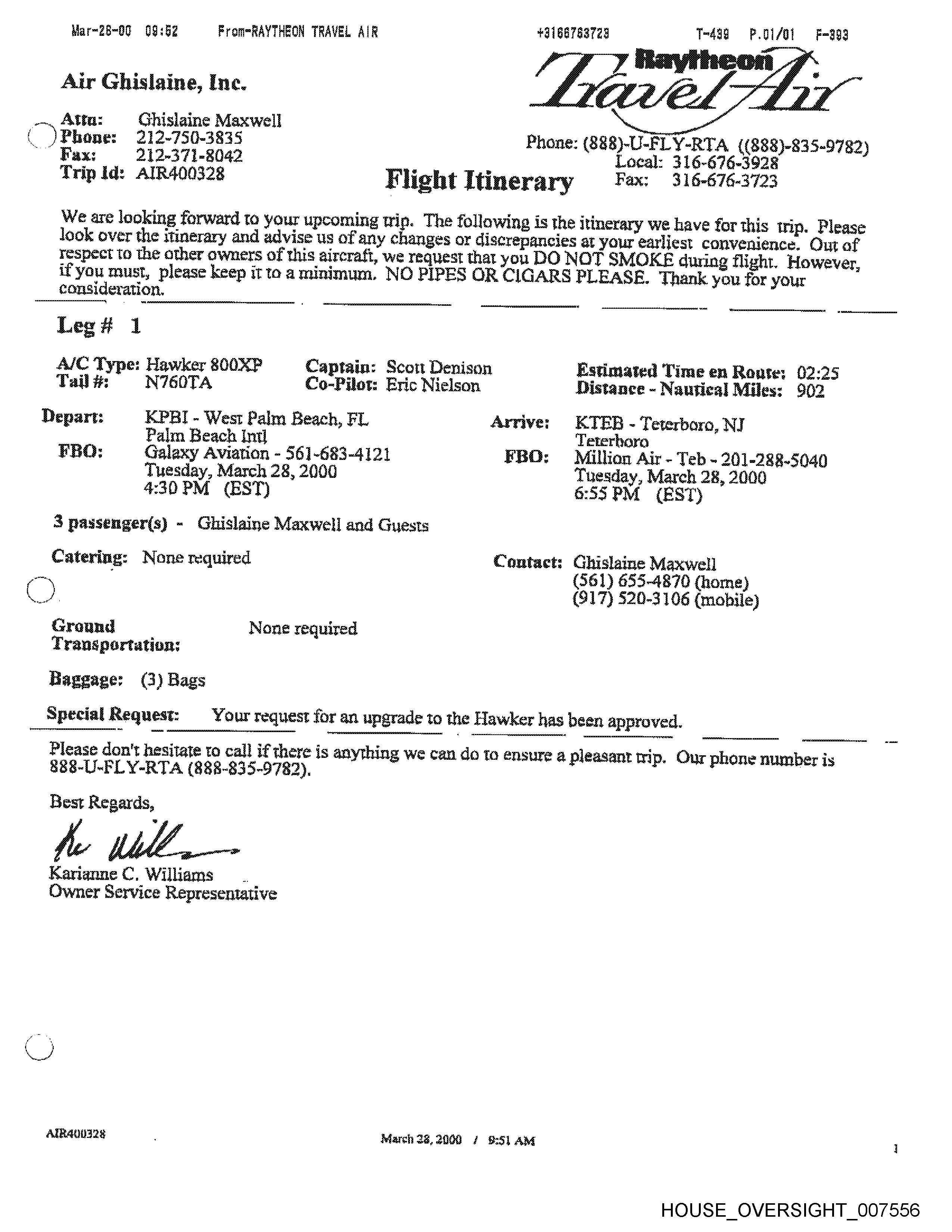 A/C Type: Hawker 800XP Captain: Scott Denison Estimated Time en Route: 02:25