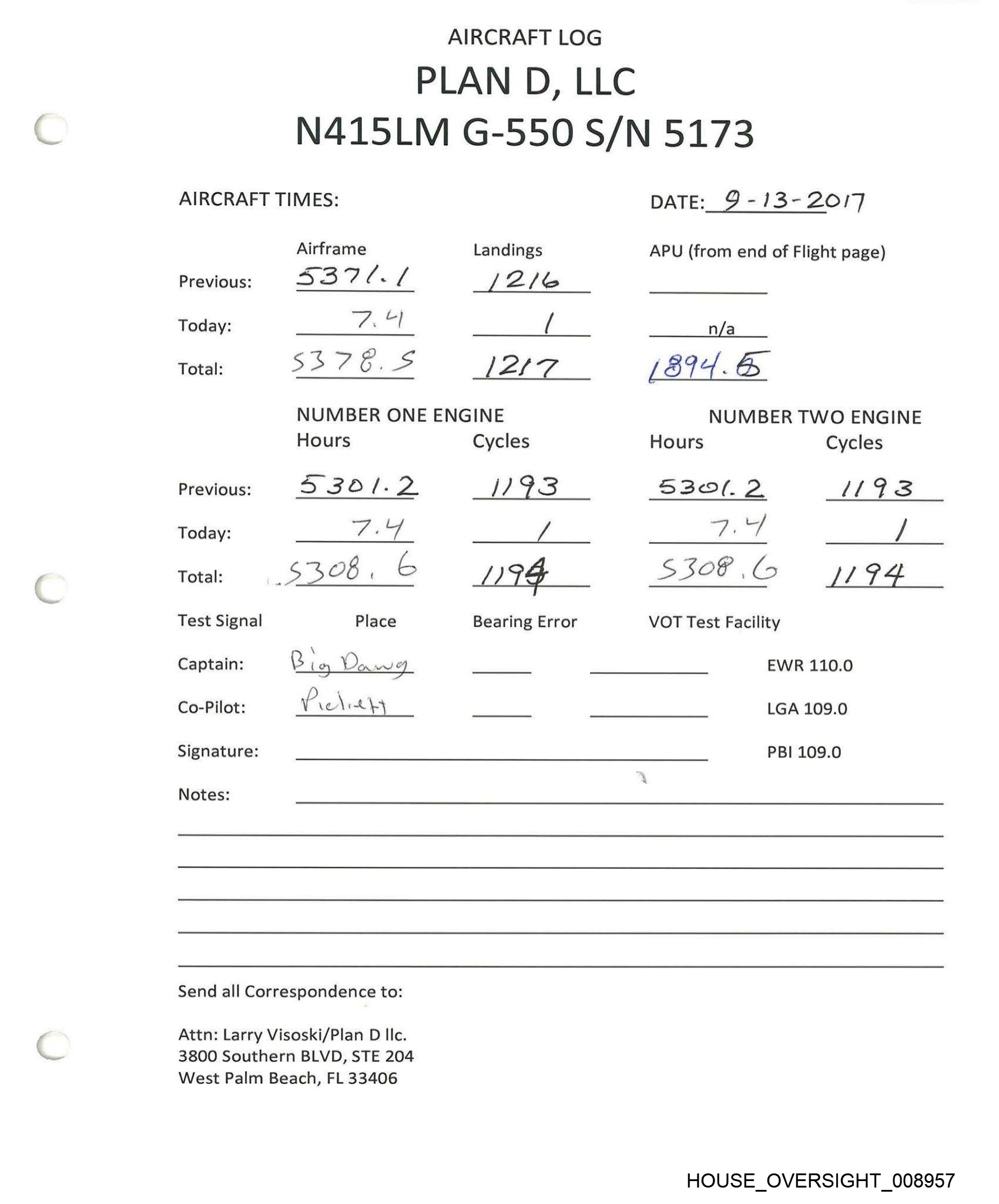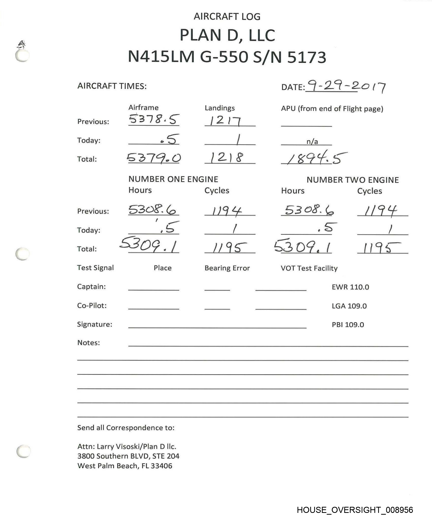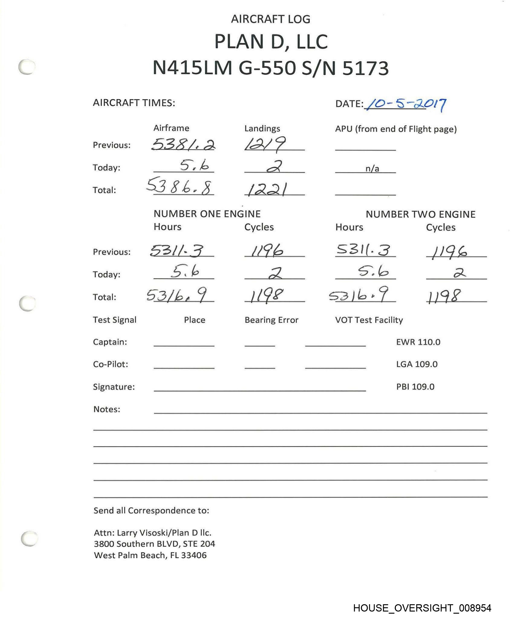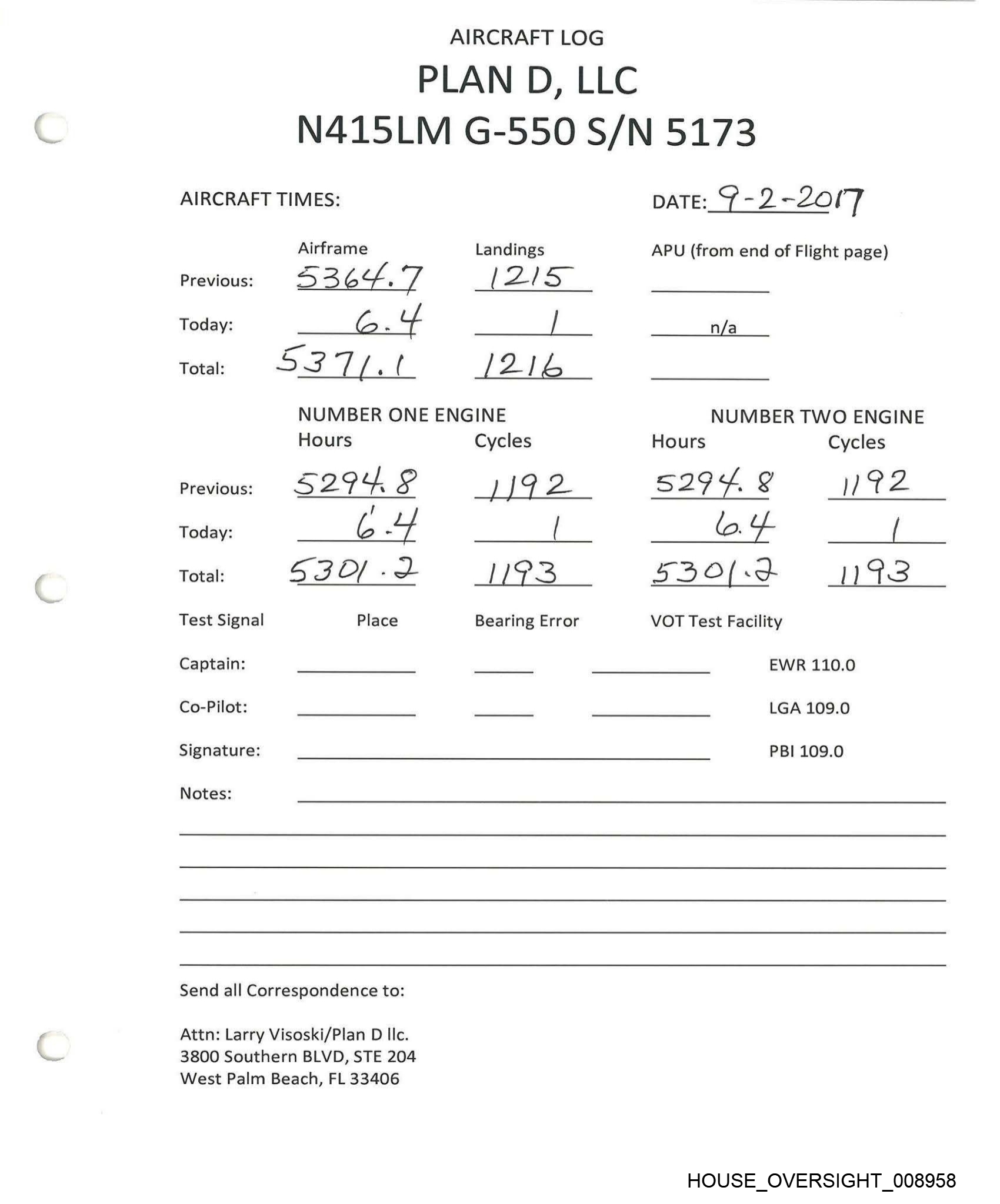 AIRCRAFT LOG PLAN D, LLC N415LM G-550 S/N 5173 AIRCRAFT TIMES: Airframe Landings Previous: 53 8 7- S22 Today: G t i | Total: ee fa ¢ 4 L AAA NUMBER ONE ENGINE Hours Cycles Previous: 453/7-F od ¥ 7 Today: C. = ( Total: 5323.5 (ROO Test Signal Place Bearing Error Captain: _ Co-Pilot: _ Signature: Notes: Send all Correspondence to: Attn: Larry Visoski/Plan D llc. 3800 Southern BLVD, STE 204 West Palm Beach, FL 33406 DATE:_ /O-9-30/ 7 APU (from end of Flight page) n/a NUMBER TWO ENGINE Hours Cycles Sar7.¥ di? ? CS / 33AZB.F J200 VOT Test Facility EWR 110.0 LGA 109.0 PBI 109.0 HOUSE_OVERSIGHT_008952