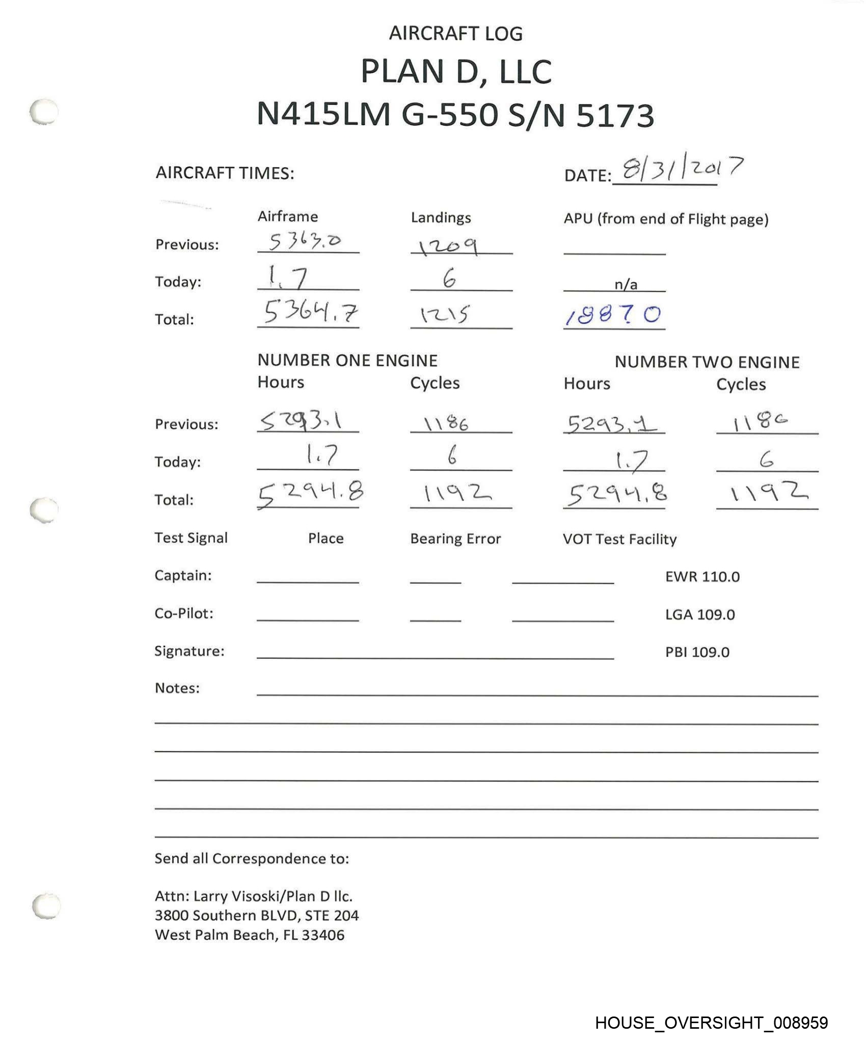 Previous: Today: Total: Previous: Today: Total: Test Signal Captain: Co-Pilot: Signature: Notes: 538.8 AIRCRAFT LOG PLAN D, LLC N415LM G-550 S/N 5173 AIRCRAFT TIMES: Airframe Landings SZ8L2A2 LY? 5. at NUMBER ONE ENGINE Hours Cycles 23-5 = Ufo 5b a MOL. Place Bearing Error Send all Correspondence to: Attn: Larry Visoski/Plan D Ilc. 3800 Southern BLVD, STE 204 West Palm Beach, FL 33406 a ike «7 DATE: JO-S “A017 APU (from end of Flight page) n/a NUMBER TWO ENGINE Hours Cycles Ssi(.3Z NGL Sib A VOT Test Facility EWR 110.0 LGA 109.0 PBI 109.0 HOUSE_OVERSIGHT_008954