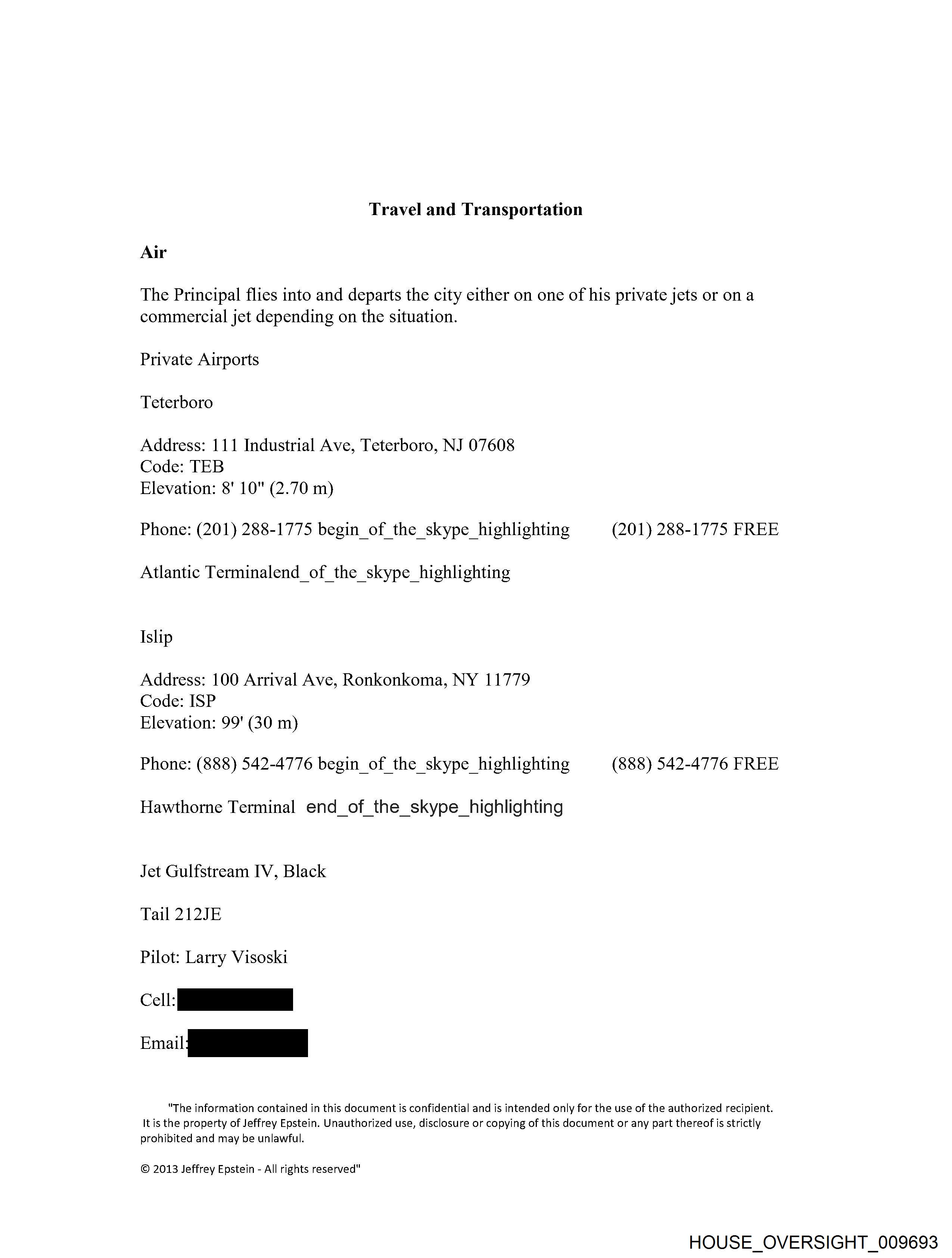 Travel and Transportation Air The Principal flies into and departs the city either on one of his private jets or on a commercial jet depending on the situation. Private Airports Teterboro Address: 111 Industrial Ave, Teterboro, NJ 07608 Code: TEB Elevation: 8' 10" (2.70 m) Phone: (201) 288-1775 begin of the skype highlighting (201) 288-1775 FREE Atlantic Terminalend of the skype highlighting Islip Address: 100 Arrival Ave, Ronkonkoma, NY 11779 Code: ISP Elevation: 99' (30 m) Phone: (888) 542-4776 begin of the skype highlighting (888) 542-4776 FREE Hawthorne Terminal end of the skype_highlighting Jet Gulfstream IV, Black Tail 212JE Pilot: Larry Visoski Cl "The information contained in this document is confidential and is intended only for the use of the authorized recipient. Itis the property of Jeffrey Epstein. Unauthorized use, disclosure or copying of this document or any part thereof is strictly prohibited and may be unlawful. © 2013 Jeffrey Epstein - All rights reserved" HOUSE_OVERSIGHT_009693