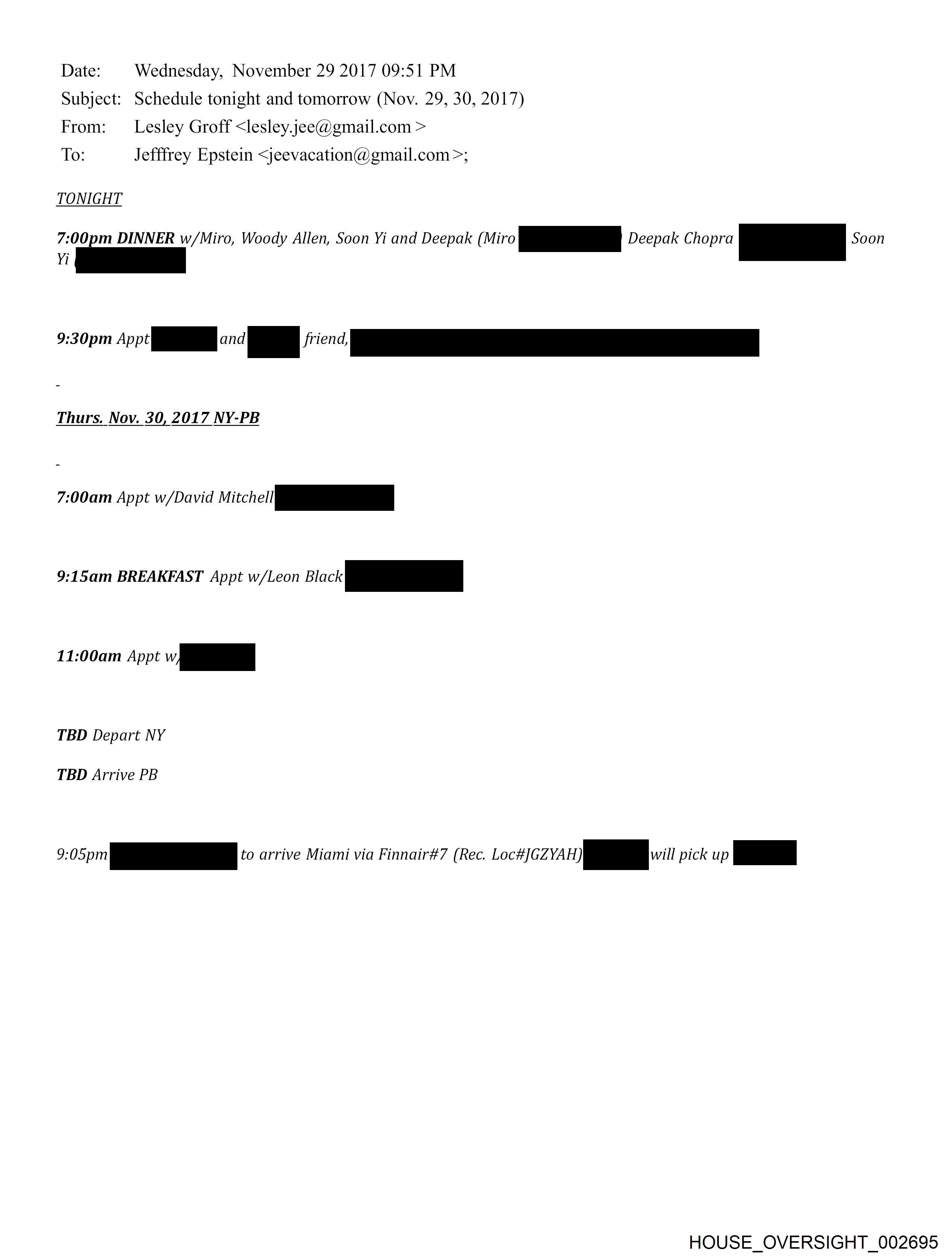 Date: Wednesday, November 29 2017 09:51 PM Subject: Schedule tonight and tomorrow (Nov. 29, 30, 2017) From: — Lesley Groff <lesley.jee@gmail.com > To: Jefffrey Epstein <jeevacation@gmail.com >; TONIGHT 7:00pm DINNER w/Miro, Woody Allen, Soon Yi and Deepak i= Deepak Chopra a Soon Thurs. Nov. 30, 2017 NY-PB 7:00am Appt w/David iii _—_— 9:15am BREAKFAST Appt w/Leon Black 11:00am Appt _—_ TBD Depart NY TBD Arrive PB 9:05) i — to arrive Miami via Finnair#7 (Rec. Loct#/GZYAH) i il pick up 7 HOUSE_OVERSIGHT_002695