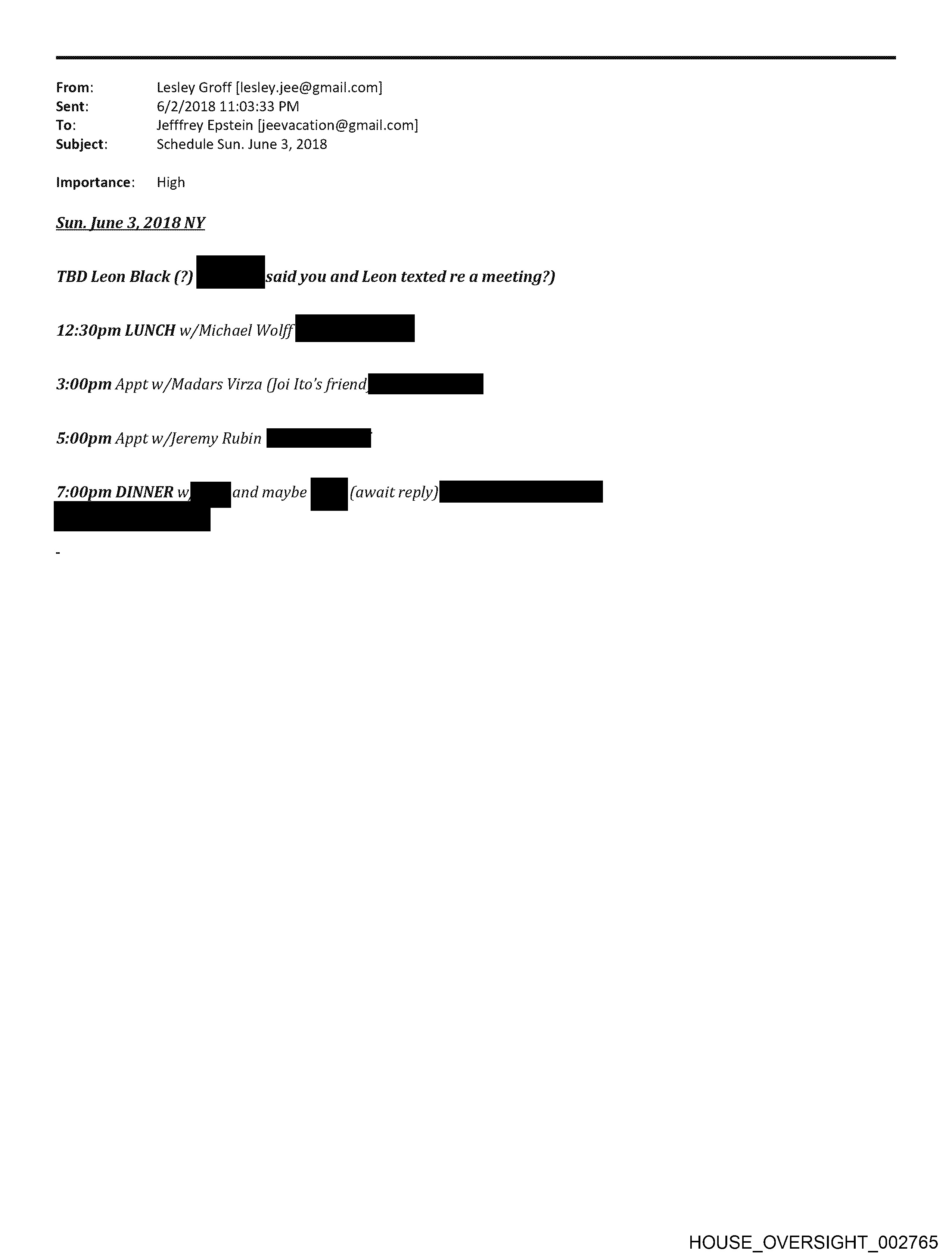 From: Lesley Groff [lesley.jee@gmail.com] Sent: 6/2/2018 11:03:33 PM To: Jefffrey Epstein [jeevacation@gmail.com] Subject: Schedule Sun. June 3, 2018 Importance: High Sun. fune 3, 2018 NY TBD Leon Black (7?) ae you and Leon texted re a meeting?) 12:30pm LUNCH w/Michael wo 3:00pm Appt w/Madars Virza (Joi Ito Seer | 5:00pm Appt w/Jeremy Ruin’ 7:00pm DINNER " maybe Ge oy) 0 (_wst:*~‘;s;sés*~*™Y HOUSE_OVERSIGHT_002765