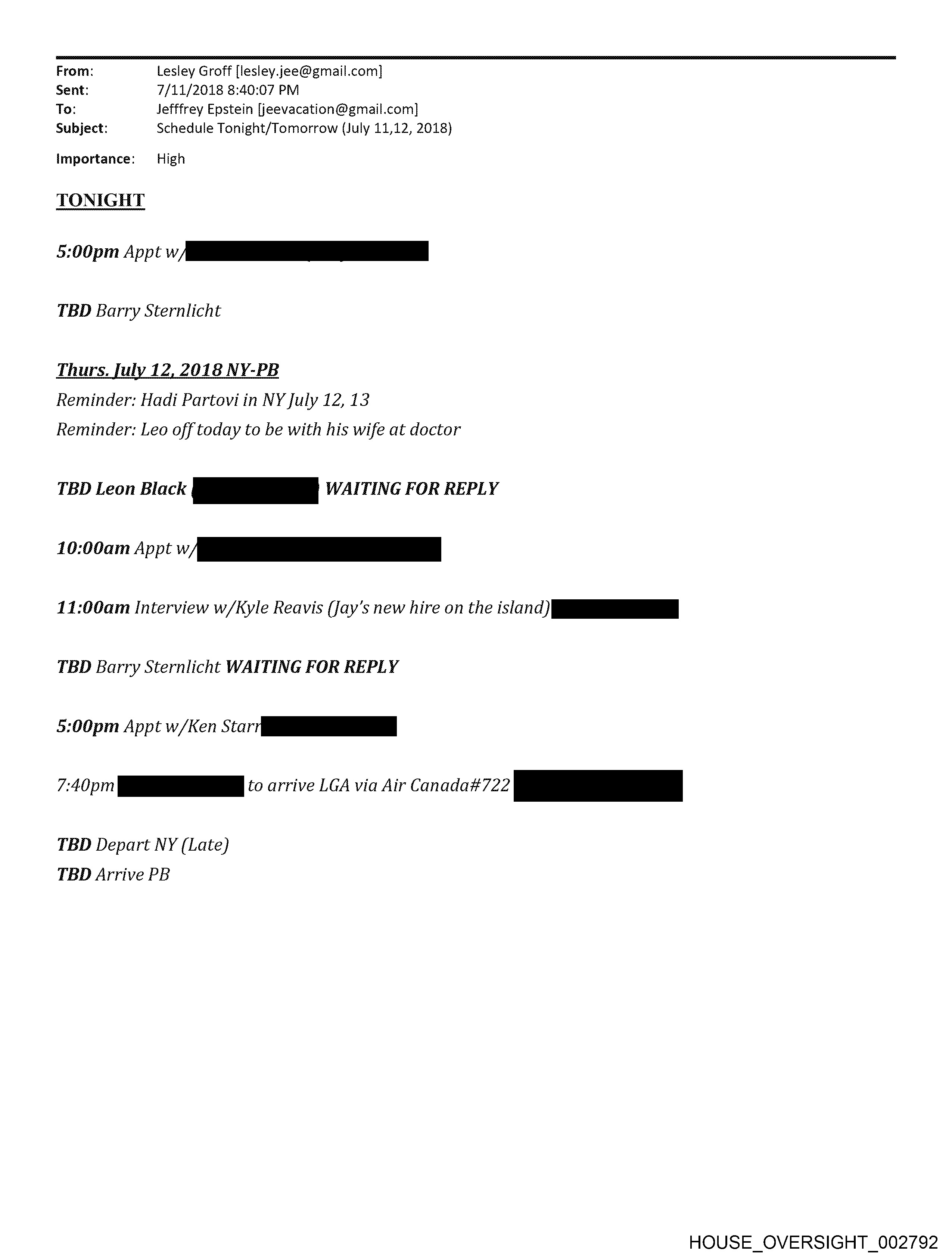From: Lesley Groff [lesley.jee@gmail.com] Sent: 7/11/2018 8:40:07 PM To: Jefffrey Epstein [jeevacation@gmail.com] Subject: Schedule Tonight/Tomorrow (July 11,12, 2018) Importance: High TONIGHT 5:00pm App 0, __ as TBD Barry Sternlicht Thurs. fuly 12,2018 NY-PB Reminder: Hadi Partoviin NY July 12, 13 Reminder: Leo off today to be with his wife at doctor TBD Leon Black a WAITING FOR REPLY 10:00am Appt wr 11:00am Interview w/Kyle Reavis (Jay's new hire on the slr iii TBD Barry Sternlicht WAITING FOR REPLY 5:00pm Appt w/Kken Sar a 7:40pm QR 0. arrive LGA via Air Canada#722 a TBD Depart NY (Late) TBD Arrive PB HOUSE_OVERSIGHT_002792