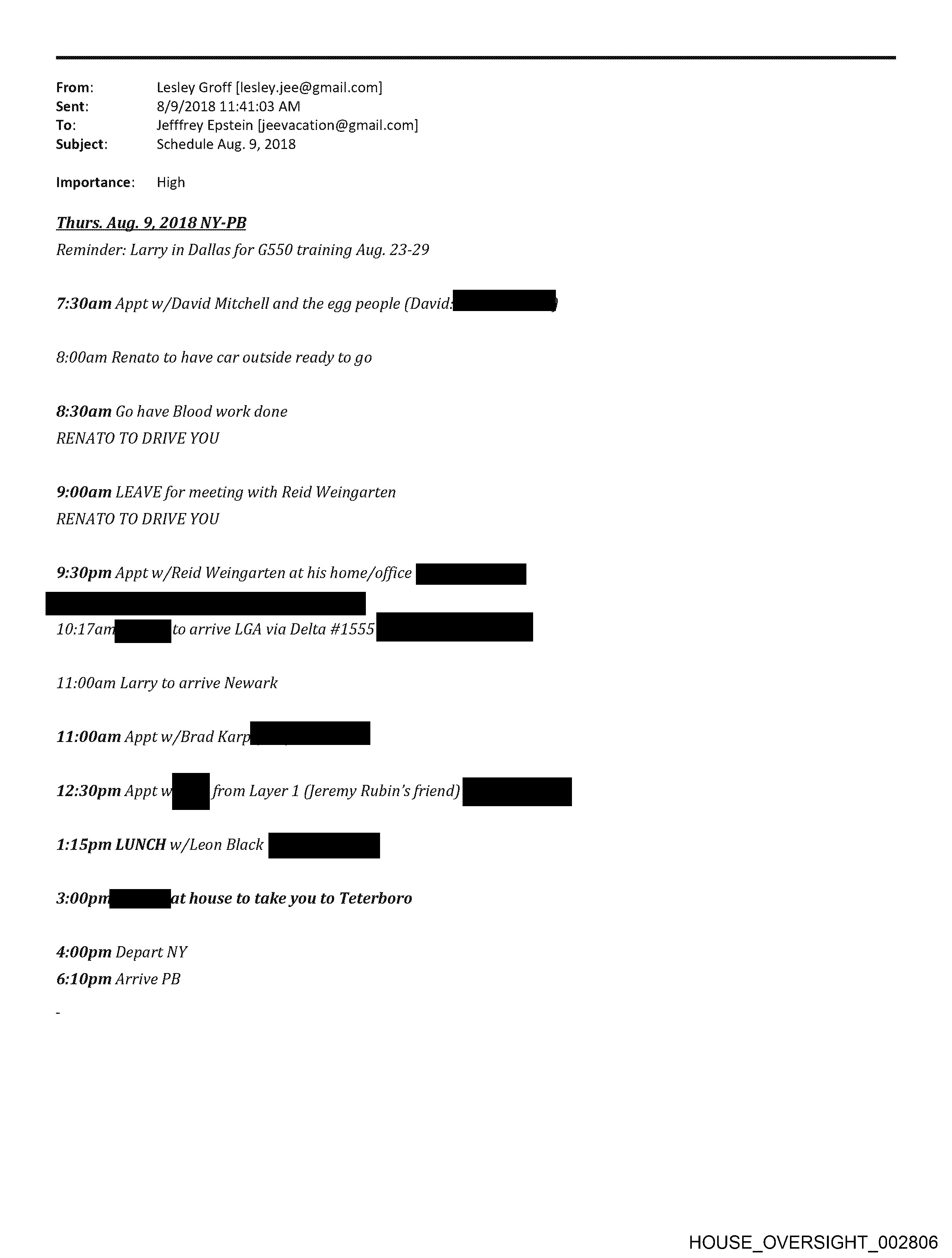 From: Lesley Groff [lesley.jee@gmail.com] Sent: 8/9/2018 11:41:03 AM To: Jefffrey Epstein [jeevacation@gmail.com] Subject: Schedule Aug. 9, 2018 Importance: High Thurs, Aug. 9, 2018 NY-PB Reminder: Larry in Dallas for G550 training Aug. 23-29 7:30am Appt w/David Mitchell and the egg people wit aS 8:00am Renato to have car outside ready to go 8:30am Go have Blood work done RENATO TO DRIVE YOU 9:00am LEAVE for meeting with Reid Weingarten RENATO TO DRIVE YOU 9:30pm Appt w/Reid Weingarten at his home/office Pp 10:1 Ton i co arrive LGA via Delta #1555 11:00am Larry to arrive Newark 11:00am Appt w/Brad Kar 12:30pm Appt vA from Layer 1 (Jeremy Rubin's friend) Pp 1:15pm LUNCH w/Leon Black pe 3:00pn fot house to take you to Teterboro 4:00pm Depart NY 6:10pm Arrive PB HOUSE_OVERSIGHT_002806