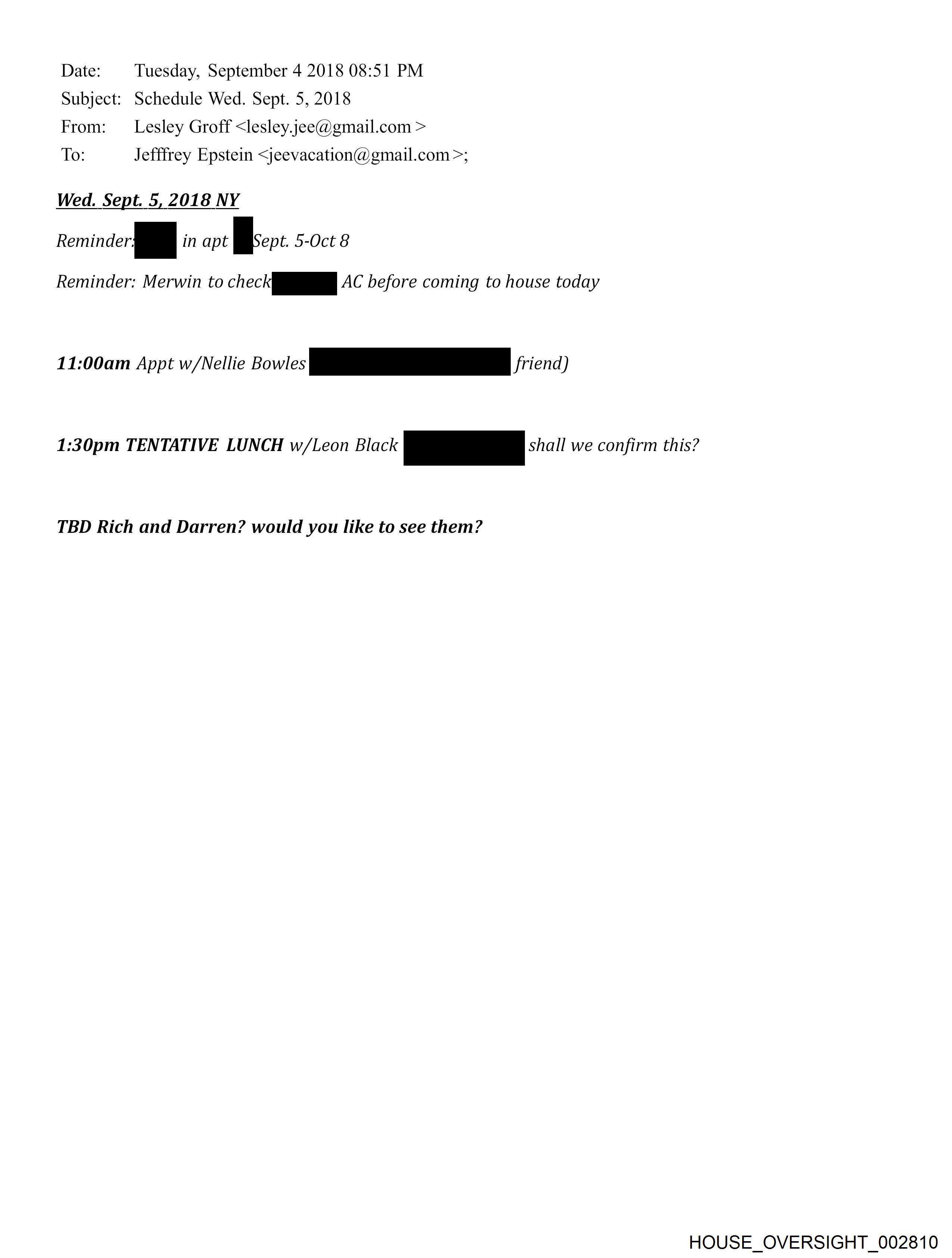 Date: Tuesday, September 4 2018 08:51 PM Subject: Schedule Wed. Sept. 5, 2018 From: Lesley Groff <lesley.jee@gmail.com > To: Jefffrey Epstein <jeevacation@gmail.com >; Wed. Sept. 5, 2018 NY Reminder ily in apt Ben 5-Oct 8 Reminder: Merwin to check{iiil AC before coming to house today 11:00am Appt w/Nellie Bowles pe friend) 1:30pm TENTATIVE LUNCH w/Leon Black ae ::2 we confirm this? TBD Rich and Darren? would you like to see them? HOUSE_OVERSIGHT_002810