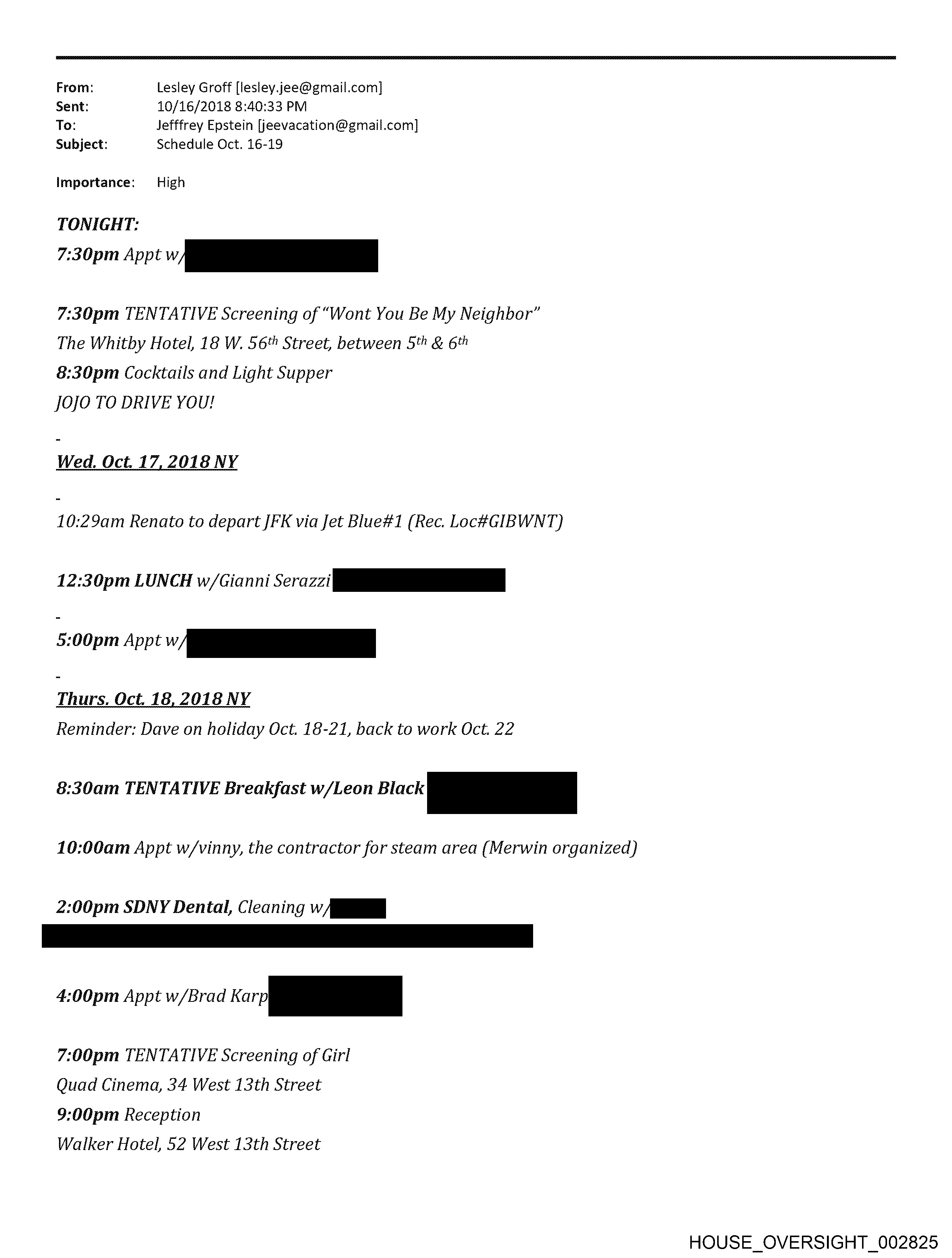 From: Lesley Groff [lesley.jee@gmail.com] Sent: 10/16/2018 8:40:33 PM To: Jefffrey Epstein [jeevacation@gmail.com] Subject: Schedule Oct. 16-19 Importance: High TONIGHT: 7:30pm TENTATIVE Screening of “Wont You Be My Neighbor” The Whitby Hotel, 18 W. 56 Street, between 5 & 6% 8:30pm Cocktails and Light Supper JOJO TO DRIVE YOU! Wed. Oct. 17,2018 NY 10:29am Renato to depart JFK via Jet Blue#1 (Rec. Loc#GIBWNT) 12:30pm LUNCH w/Gianni ceri Kk - Thurs. Oct. 18, 2018 NY Reminder: Dave on holiday Oct. 18-21, back to work Oct. 22 8:30am TENTATIVE Breakfast w/Leon black 10:00am Appt w/vinny, the contractor for steam area (Merwin organized) 2:00pm SDNY Dental, Cleaning V/i ZZ 4:00pm Appt w/Brad kar? 7:00pm TENTATIVE Screening of Girl Quad Cinema, 34 West 13th Street 9:00pm Reception Walker Hotel, 52 West 13th Street HOUSE _OVERSIGHT_002825