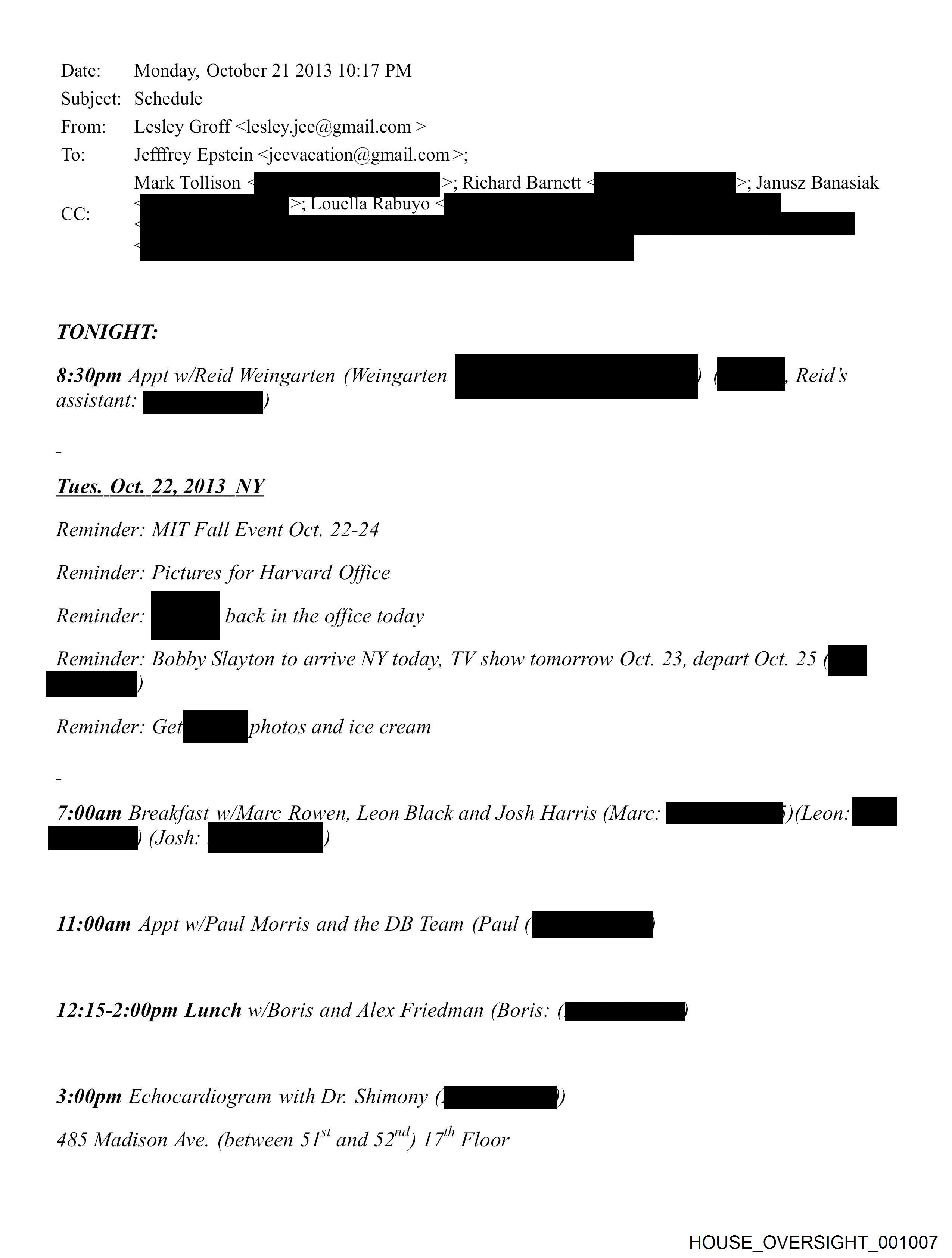 Date: Monday, October 21 2013 10:17 PM Subject: Schedule From: Lesley Groff <lesley.jee@gmail.com > To: Jefffrey Epstein <jeevacation@gmail.com >; Mark Tollison >; Richard Barnett >; Janusz Banasiak CC TONIGHT: 8:30pm Appt w/Reid Weingarten (Weingarten ee YI Reid s Tues. Oct. 22, 2013 NY Reminder: MIT Fall Event Oct. 22-24 Reminder: Pictures for Harvard Office Reminder: _ back in the office today Reminder: Bobby Slayton to arrive NY today, TV show tomorrow Oct. 23, depart Oct. 25 ; Reminder: Gefft photos and ice cream 7:00am Breakfast_w/Marc Rowen, Leon Black and Josh Harris (Marc: RE con a 07: 11:00am Appt w/Paul Morris and the DB Team (Paul (4 12:15-2:00pm Lunch w/Boris and Alex Friedman (boris: ;x——==iyy> 3:00pm Echocardiogram with Dr. Shimony QJ 485 Madison Ave. (between 51° and 52") 17" Floor HOUSE_OVERSIGHT_001007