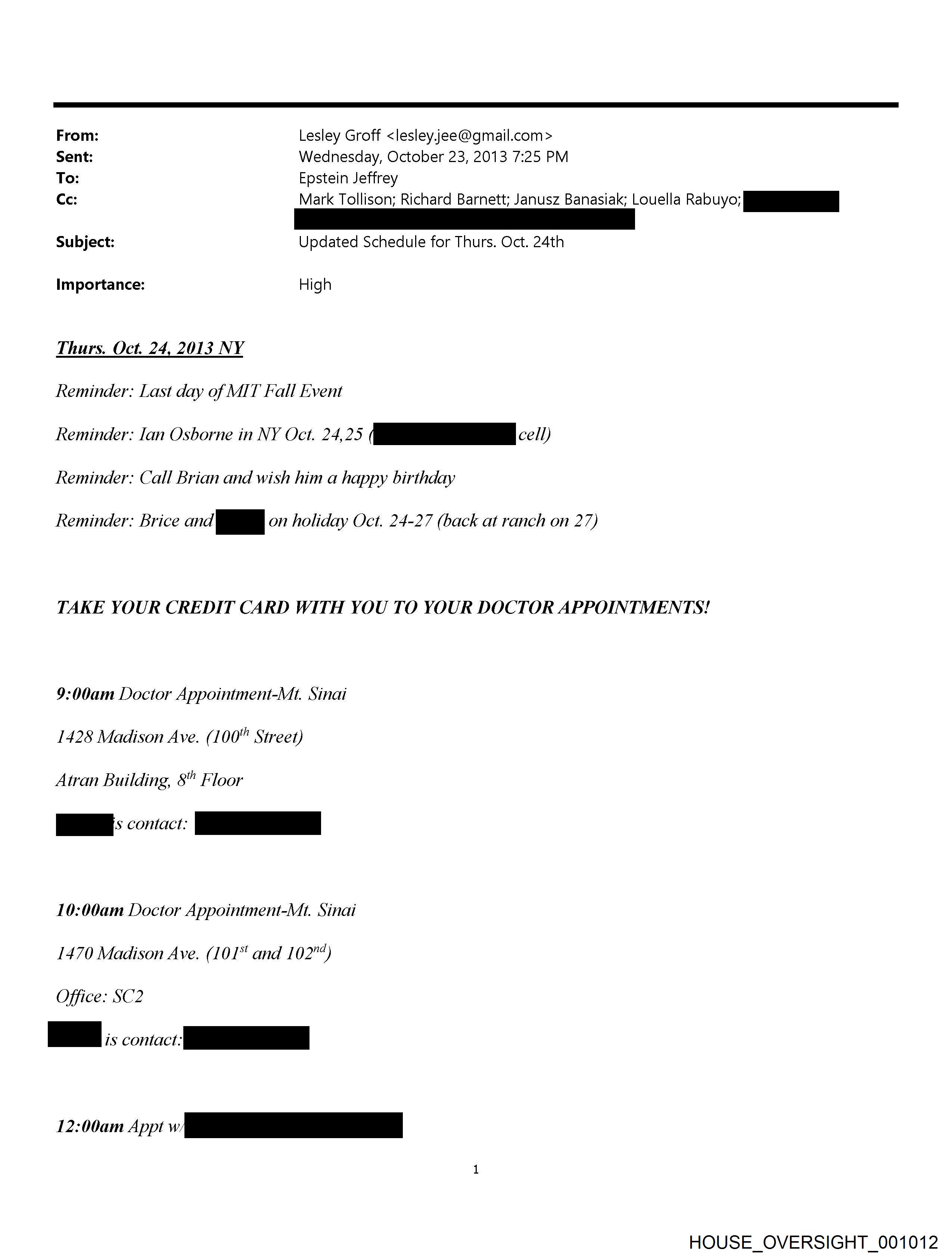 From: Lesley Groff <lesley.jee@qmail.com> Sent: Wednesday, October 23, 2013 7:25 PM To: Epstein Jeffrey Ce: Mark Tollison; Richard Barnett; Janusz Banasiak; Louella Rabuyo; Subject: Updated Schedule for Thurs. Oct. 24th Importance: High Thurs. Oct. 24, 2013 NY Reminder: Last day of MIT Fall Event Reminder: Ian Osborne in NY Oct. 24,25 (RR ¢¢1/) Reminder: Call Brian and wish him a happy birthday Reminder: Brice and a on holiday Oct. 24-27 (back at ranch on 27) TAKE YOUR CREDIT CARD WITH YOU TO YOUR DOCTOR APPOINTMENTS! 9:00am Doctor Appointment-Mt. Sinai 1428 Madison Ave. (100" Street) Atran Building, 8" Floor 10:00am Doctor Appointment-Mt. Sinai 1470 Madison Ave. (101° and 102”) Office: SC2 200m App <r HOUSE_OVERSIGHT_001012