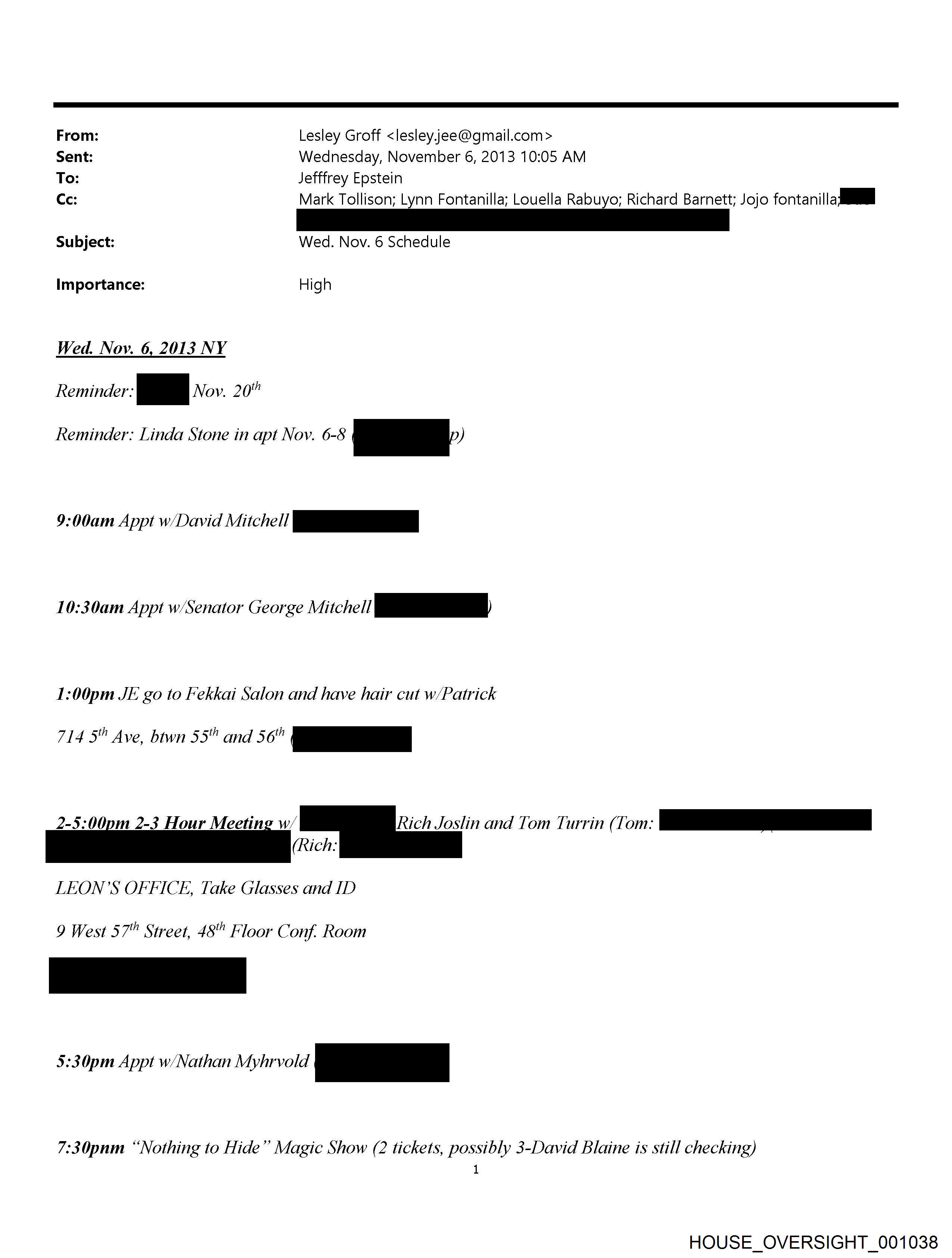 From: Lesley Groff <lesley.jee@qmail.com> Sent: Wednesday, November 6, 2013 10:05 AM To: Jefffrey Epstein Cc: Mark Tollison; Lynn Fontanilla; Louella Rabuyo; Richard Barnett; Jojo fontanilla Aaa Subject: Wed. Nov. 6 Schedule Importance: High Wed. Nov. 6, 2013 NY Reminder: ev... i a Reminder: Linda Stone in apt Nov. 6-8 | OY 9:00am Appt w/David Mitchell a 10:30am Appt w/Senator George Mitchell PY 1:00pm JE go to Fekkai Salon and have hair cut w/Patrick 714 5" Ave, btwn 55" and 56" Po 2-5:00pm 2-3 Hour Meeting w/ (Rich: Rich Joslin and Tom Turrin (Tom: ee LEON’S OFFICE, Take Glasses and ID 9 West 57" Street, 48" Floor Conf. Room 5:30pm Appt w/Nathan Myhrvold a 7:30pnm “Nothing to Hide” Magic Show (2 tickets, possibly 3-David Blaine is still checking) 1 HOUSE_OVERSIGHT_001038