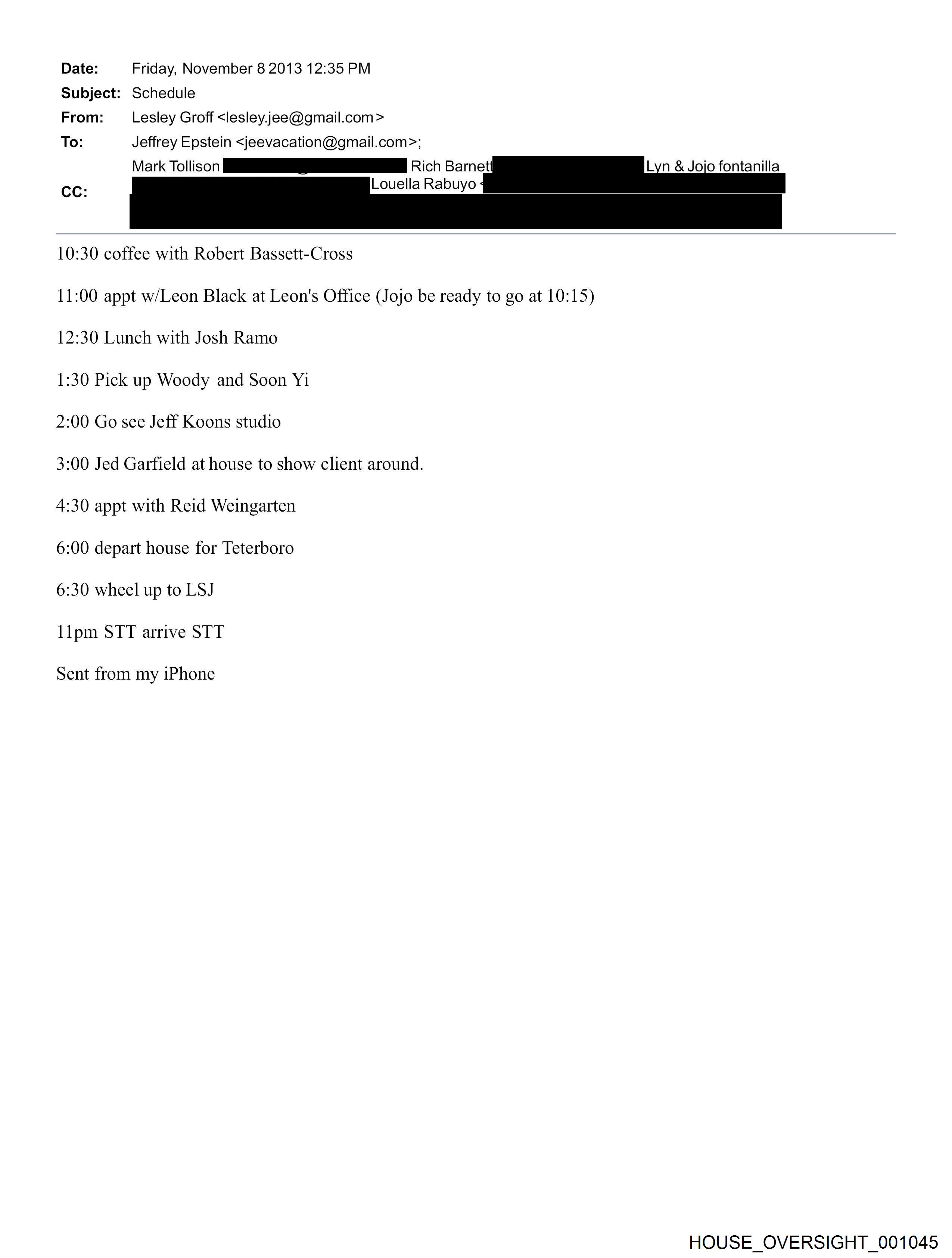 Date: Friday, November 8 2013 12:35 PM Subject: Schedule From: Lesley Groff <lesley.jee@gmail.com > To: Jeffrey Epstein <jeevacation@gmail.com>; Mark Tollison ii Rich Barnet Lyn & Jojo fontanilla CC: EES Rabuyo 10:30 coffee with Robert Bassett-Cross 11:00 appt w/Leon Black at Leon's Office (Jojo be ready to go at 10:15) 12:30 Lunch with Josh Ramo 1:30 Pick up Woody and Soon Y1 2:00 Go see Jeff Koons studio 3:00 Jed Garfield at house to show client around. 4:30 appt with Reid Weingarten 6:00 depart house for Teterboro 6:30 wheel up to LSJ lIlpm STT arrive STT Sent from my iPhone HOUSE_OVERSIGHT_001045