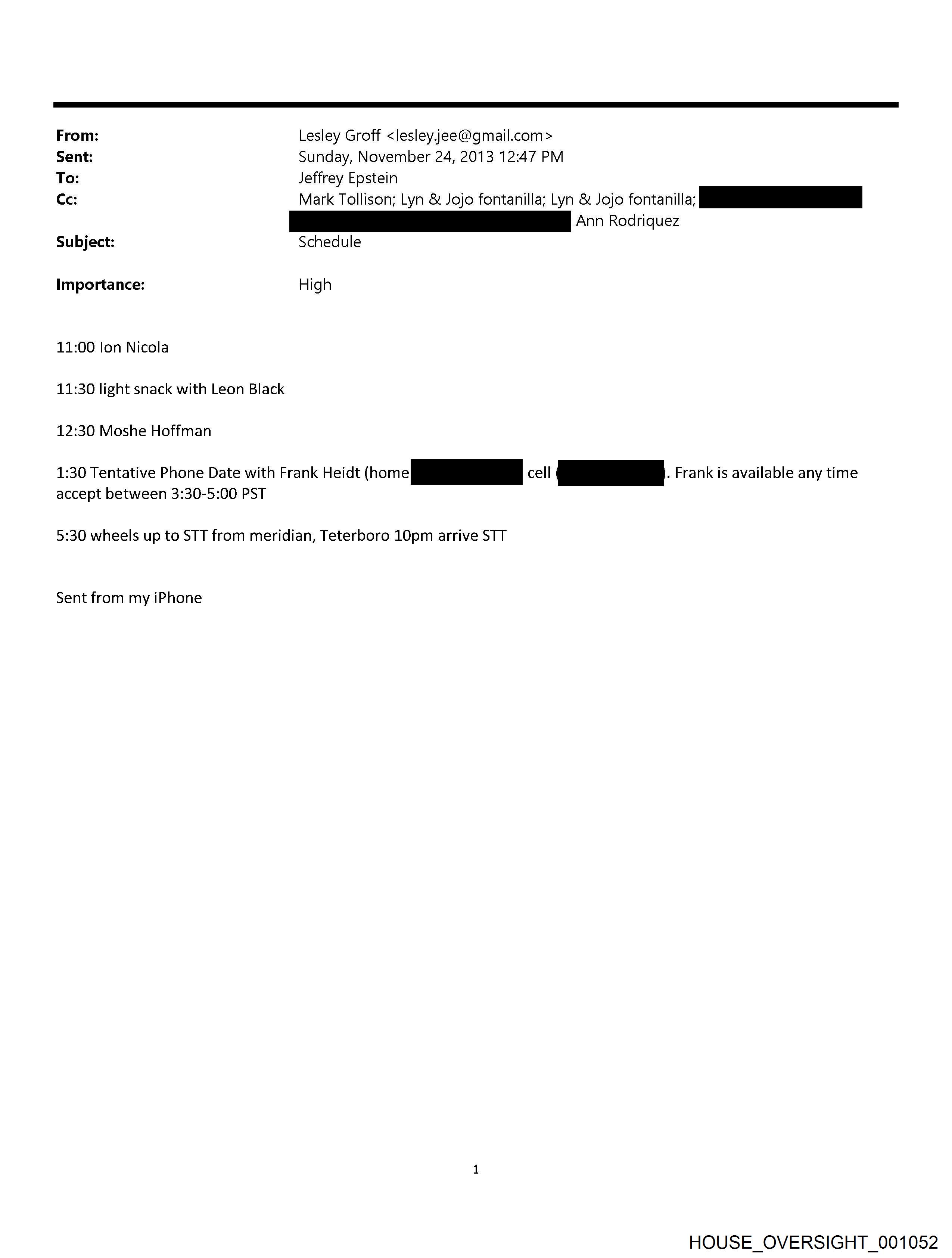 From: Lesley Groff <lesley.jee@qmail.com> Sent: Sunday, November 24, 2013 12:47 PM To: Jeffrey Epstein Cc: Mark Tollison; Lyn & Jojo fontanilla; Lyn & Jojo fontanilla; fa REE 4° Rodriquez Subject: Schedule Importance: High 11:00 lon Nicola 11:30 light snack with Leon Black 12:30 Moshe Hoffman 1:30 Tentative Phone Date with Frank Heidt (home ———_— cell ae. Frank is available any time accept between 3:30-5:00 PST 5:30 wheels up to STT from meridian, Teterboro 10pm arrive STT Sent from my iPhone HOUSE_OVERSIGHT_001052