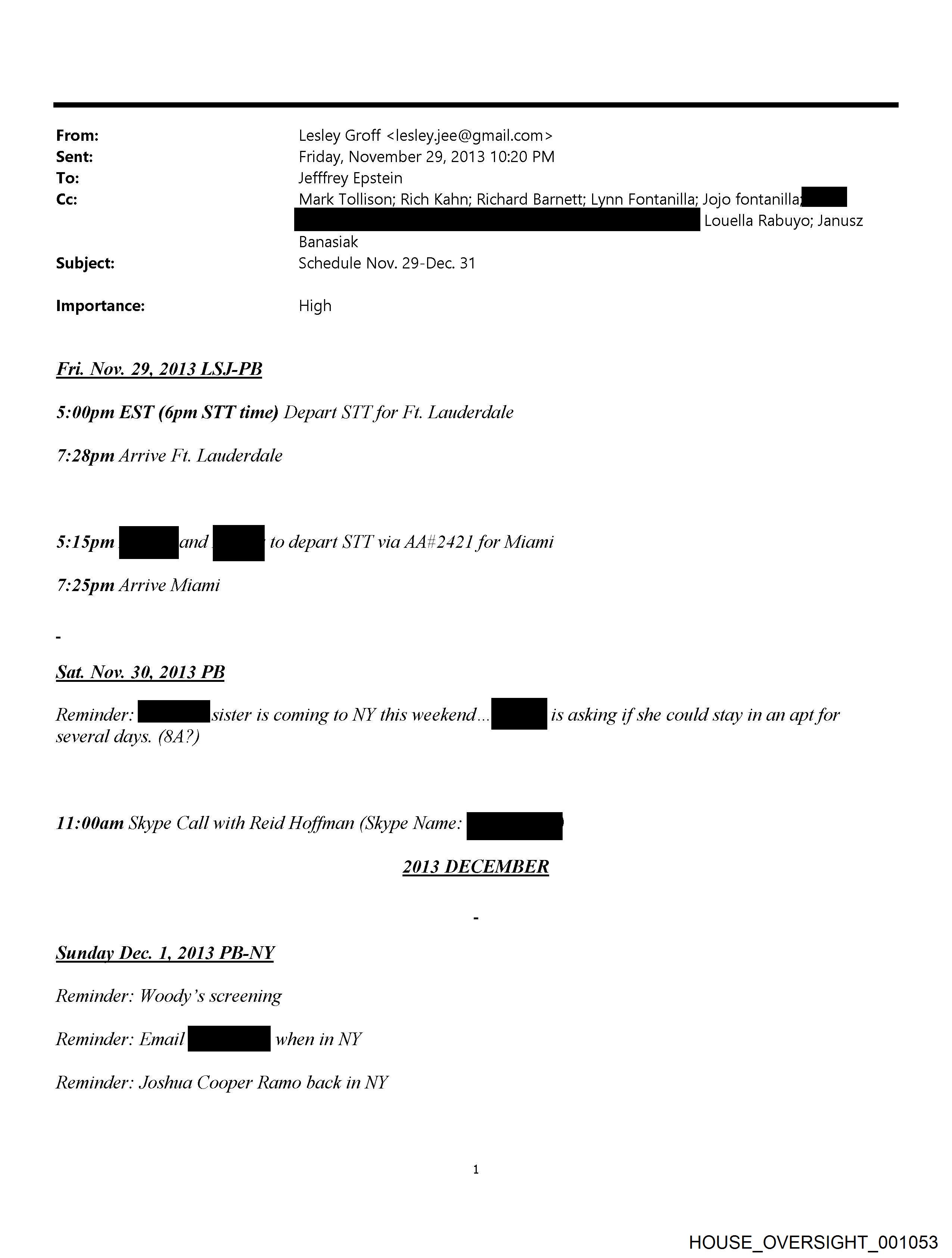 From: Lesley Groff <lesley.jee@qmail.com> Sent: Friday, November 29, 2013 10:20 PM To: Jefffrey Epstein Cc: Mark Tollison; Rich Kahn; Richard Barnett; Lynn Fontanilla; Jojo fontanilla ja Banasiak Subject: Schedule Nov. 29-Dec. 31 Importance: High Fri. Nov. 29, 2013 LSJ-PB 5:00pm EST (6pm STT time) Depart STT for Ft. Lauderdale 7:28pm Arrive Ft. Lauderdale 5:15pm 2 p to depart STT via AA#2421 for Miami 7:25pm Arrive Miami Sat. Nov. 30, 2013 PB Reminder: ee iste: is coming to NY this weekend. _ is asking if she could stay in an apt for several days. (8A?) 11:00am Skype Call with Reid Hoffman (Skype Name: pg 2013 DECEMBER Sunday Dec. 1, 2013 PB-NY Reminder: Woody’s screening Reminder: Email po when in NY Reminder: Joshua Cooper Ramo back in NY HOUSE_OVERSIGHT_001053