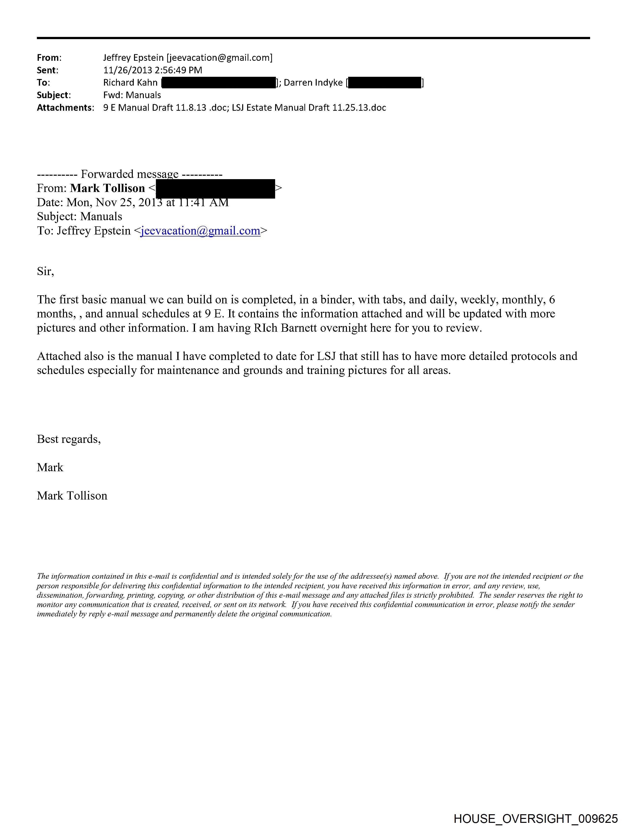From: Jeffrey Epstein [jeevacation@gmail.com] Sent: 11/26/2013 2:57:10 PM To: Richard Kahn |. Darren indyke Po Subject: Fwd: Manuals Attachments: 9E Manual Draft 11.8.13 .doc; LSJ Estate Manual Draft 11.25.13.doc ---------- Forwarded message ---------- From: Mark Tollison Date: Mon, Nov 25, 2013 at 11:41 AM Subject: Manuals To: Jeffrey Epstein <jeevacation@gmail.com> Sir, The first basic manual we can build on is completed, in a binder, with tabs, and daily, weekly, monthly, 6 months, , and annual schedules at 9 E. It contains the information attached and will be updated with more pictures and other information. I am having RIch Barnett overnight here for you to review. Attached also is the manual I have completed to date for LSJ that still has to have more detailed protocols and schedules especially for maintenance and grounds and training pictures for all areas. Best regards, Mark Mark Tollison The information contained in this e-mail is confidential and is intended solely for the use of the addressee(s) named above. If you are not the intended recipient or the person responsible for delivering this confidential information to the intended recipient, you have received this information in error, and any review, use, dissemination, forwarding, printing, copying, or other distribution of this e-mail message and any attached files is strictly prohibited. The sender reserves the right to monitor any communication that is created, received, or sent on its network. If