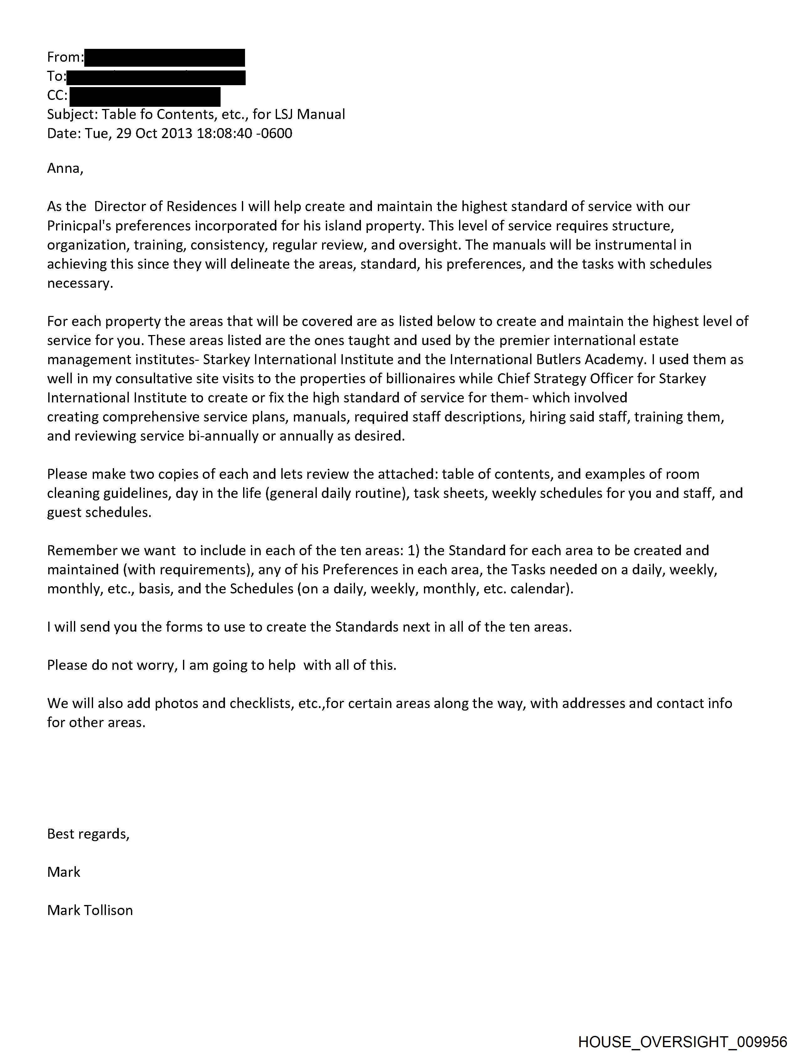 or CC: Subject: Table fo Contents, etc., for LSJ Manual Date: Tue, 29 Oct 2013 18:08:40 -0600 Anna, As the Director of Residences | will help create and maintain the highest standard of service with our Prinicpal's preferences incorporated for his island property. This level of service requires structure, organization, training, consistency, regular review, and oversight. The manuals will be instrumental in achieving this since they will delineate the areas, standard, his preferences, and the tasks with schedules necessary. For each property the areas that will be covered are as listed below to create and maintain the highest level of service for you. These areas listed are the ones taught and used by the premier international estate management institutes- Starkey International Institute and the International Butlers Academy. | used them as well in my consultative site visits to the properties of billionaires while Chief Strategy Officer for Starkey International Institute to create or fix the high standard of service for them- which involved creating comprehensive service plans, manuals, required staff descriptions, hiring said staff, training them, and reviewing service bi-annually or annually as desired. Please make two copies of each and lets review the attached: table of contents, and examples of room cleaning guidelines, day in the life (general daily routine), task sheets, weekly schedules for you and staff, and guest schedules. Remember we want to include in ea