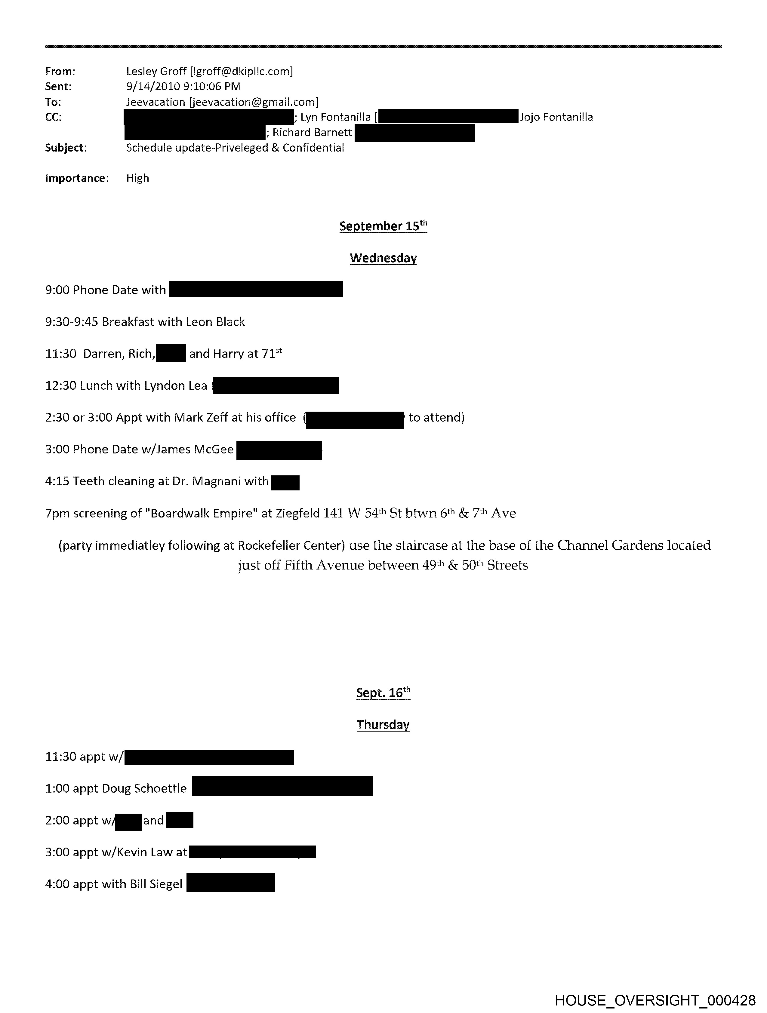 From: Lesley Groff [Igroff@dkiplic.com] Sent: 9/14/2010 9:10:06 PM To: Jeevacation [jeevacation@gmail.com] CC: ; Lyn Fontanilla i... Fontanilla ; Richard Barnett Subject: Schedule update-Priveleged & Confidential Importance: High September 15" Wednesday 9:00 Phone Date with is 9:30-9:45 Breakfast with Leon Black 11:30 Darren, rich and Harry at 71° 12:30 Lunch with Lyndon Lea a 2:30 or 3:00 Appt with Mark Zeff at his office HO to attend) 3:00 Phone Date w/James VcGee 4:15 Teeth cleaning at Dr. Magnani with 7pm screening of "Boardwalk Empire" at Ziegfeld 141 W 54th St btwn 6% & 7h Ave (party immediatley following at Rockefeller Center) use the staircase at the base of the Channel Gardens located just off Fifth Avenue between 49% & 50% Streets Sept. 16" Thursday 11:30 appt w/ 1:00 appt Doug Schoettle Be 2:00 appt wie c 3:00 appt w/Kevin Law at [EEE 4:00 appt with Bill Siegel a HOUSE_OVERSIGHT_000428
