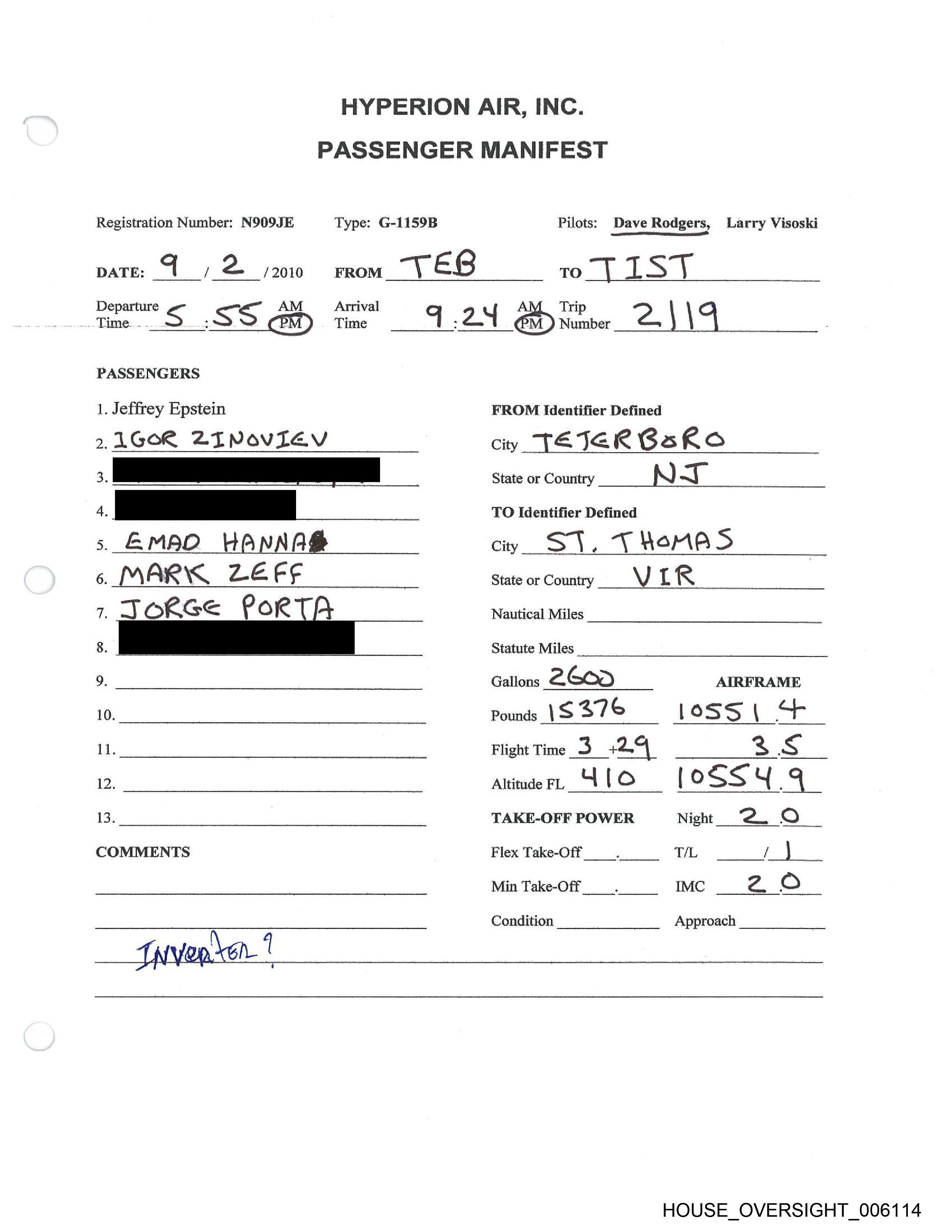 HYPERION AIR, INC. PASSENGER MANIFEST Registration Number: N909JE DATE: GA 1] jr FROM TES Type: G-1159B Pilots: Dave Rodgers, Larry Visoski egos Se er ro | LST z, S SS a ae 9.24 GM) Number 2. | \ | PASSENGERS 1. Jeffrey Epstein 2, 1GOR ZITNoviEev == =~ s EMARO HANNA 6 MARK ZEFF 1 TORGE ae 8. COMMENTS FROM Identifier Defined ciy TETER BsaKOo State or Country NT TO Identifier Defined city SI. THOMA om State or Country VU iB & Nautical Miles Statute Miles Gallons 2EOO AIRFRAME tone 1S Sr? loss | Sr Flight Time 3 +29. 55 |. AltimderL ALO [OSSY 9. TAKE-OFF POWER Night 2. O | Flex Take-Off. T/L - oa Min Take-Off. _—S— IMC ZO Condition Approach HOUSE_OVERSIGHT_006114