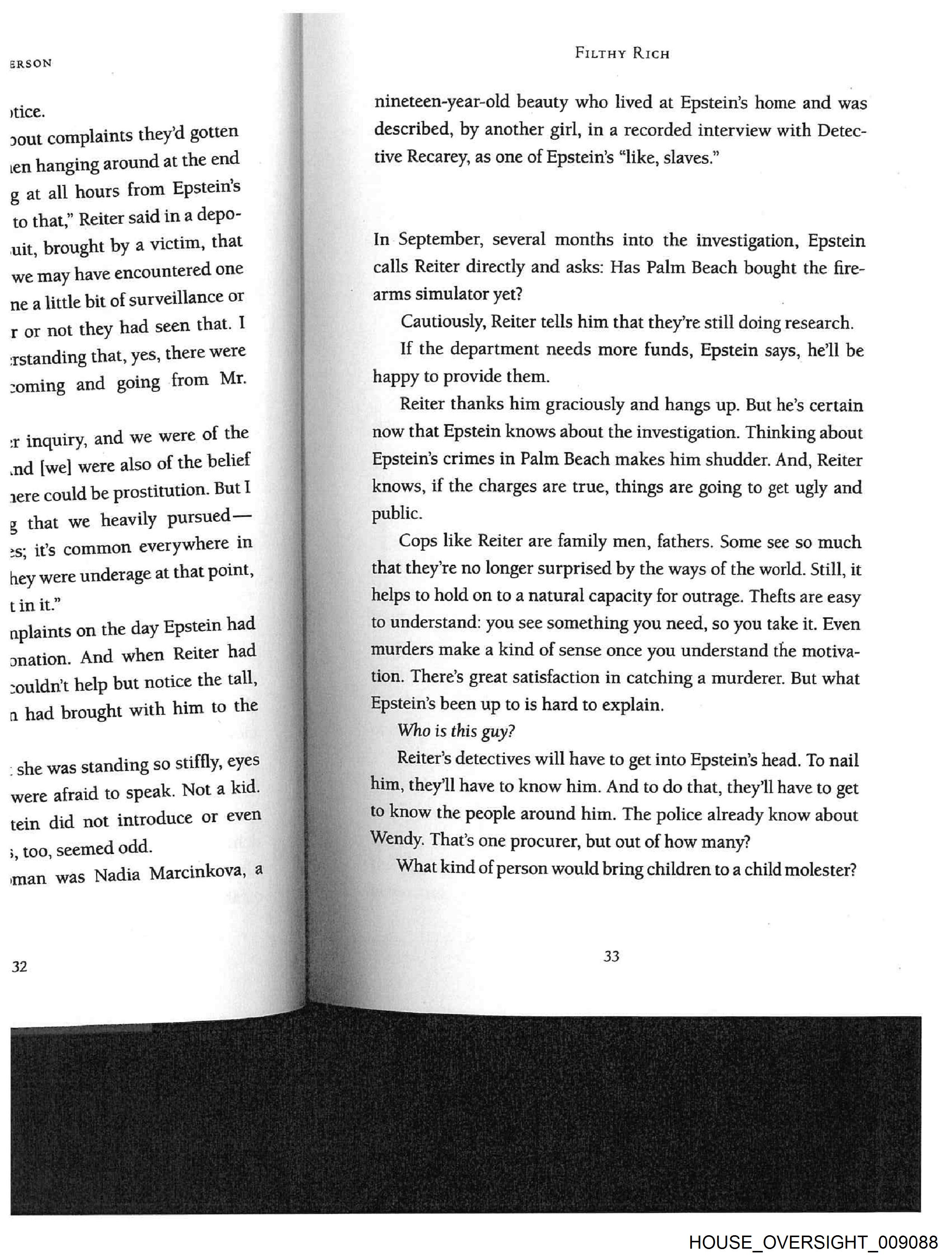 ERSON him to have the investigation icheonette, he explained, and noney. At the time, it made no yusy man. He was going to get yolice into his home to install at the Palm Beach PD provided ly one with access lo the foot- e police had noticed a group of ~med to be camped out at the (len - Nadia Marcinkova. tive of Epstein—that fact had nues, the cops see photographs cers find Alison’s high school can't shake the feeling that the yp for their arrival. Shelves look and several photographs appeat walls. n of the place to be searched, ysition for B.B. vs. Epstein, “some- a bit.” surprising about this. After al in’s gotten wind of their investiga- - for a house that’s been scrubbed, od. about the search is that someone FILTHY RicH appears to have gone through the house, gotten rid of incrimi- nating materials, but left many clues behind. It was as if the things the police were seeing didn’t even reg- ister as Wrong. There’s another feeling the cops can’t shake: the nagging sense that they themselves are being investigated and tailed. First Reiter hears through the grapevine that Epstein’s law- yers have hired private investigators to perform background checks. A public-records demand has been filed in an effort to obtain Reiter’s own records. Detective Recarey tells Reiter that he, too, is being surveilled and that his trash has been picked through. In his entire career as a police officer, this is the first time that Reiter’s seen or heard of such a thing: a suspe