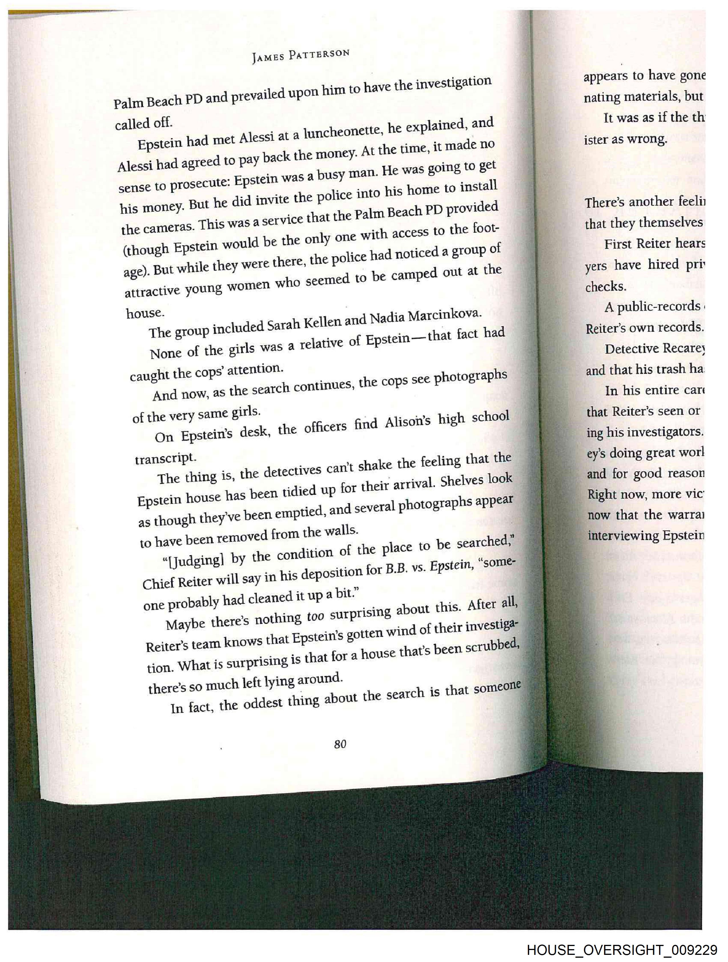 James PATTERSON Palm Beach PD and prevailed upon him to have the investigation called off. Epstein had met Alessi a ined, and made no g to get t a luncheonette, he expla Alessi had agreed to pay back the money. At the time, it s a busy man. He was goin sense to prosecute. Epstein wa e police into his home to install his money. But he did invite th meras. [his was a service that the Palm Beach PD provided ly one with access to the foot- the ca (though Epstein would be the on police had noticed a group of ed to be camped out at the + while they were there, the age). Bu young women who seem attractive house. The group included Sarah Kellen None of the girls was 4 relative 0 caught the cops’ attention. And now, as the search continues, of the very same girls. On Epstein's desk, the officers transcript. The thing is, Epstein house ha as though they've to have been remo “(Judging] by t Chief Reiter will say 10 his one probably had cleaned it up 4 bit.” Maybe there's nothing too surprising abou Reiter’s team knows that Epstein’s gotten wind of tion. What is surprising is that for a house that’s b there’s so much left lyin In fact, the oddest t and Nadia Marcinkova. { Epstein — that fact had the cops see photographs Gnd Alison’s high school the detectives cant shake the feeling that the arrival. Shelves look 5 been tidied up for their been emptied, and several photographs appear ved from the walls. he condition of the plac deposition for B.B. v g around.