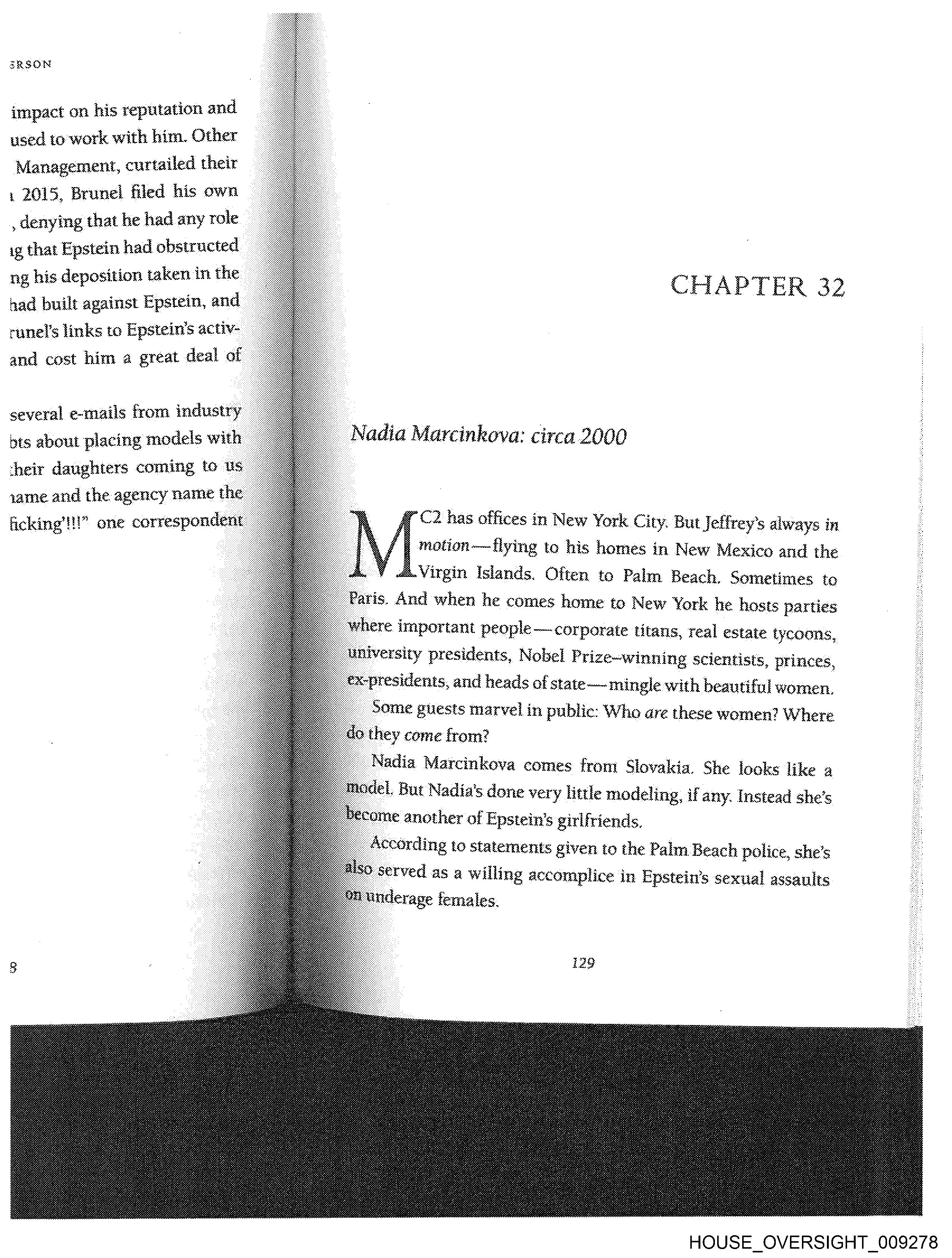 ERSON impact on his reputation and used to-work with him. Other Management, curtailed their | 2015, Brunel filed his own denying that he had any role ig that Epstein had obstructed. ng his deposition taken in the had built against Epstein, and runel’s links to Epstein’s activ and cost him a great deal of several e-mails from industr or re a ee oo _ Nadia Marcinkova: circa 2000 their daughters coming tot same and the agency name U Acking’ Il!” one corresponde: @f C2 has offices in New York City. But Jeffrey’s always in | motion—flying to his homes in New Mexico and the i. Virgin Islands. Often to Palm Beach. Sometimes to ris. And when he comes home to New York he hosts parties ersity presidents, Nobel Prize-winning scientists, princes, residents, and heads of state—mingle with beautiful women. Some guests marvel in public: Who are these women? Where erved as a willing accomplice in Epstein’s sexual assaults derage females. HOUSE_OVERSIGHT_009278