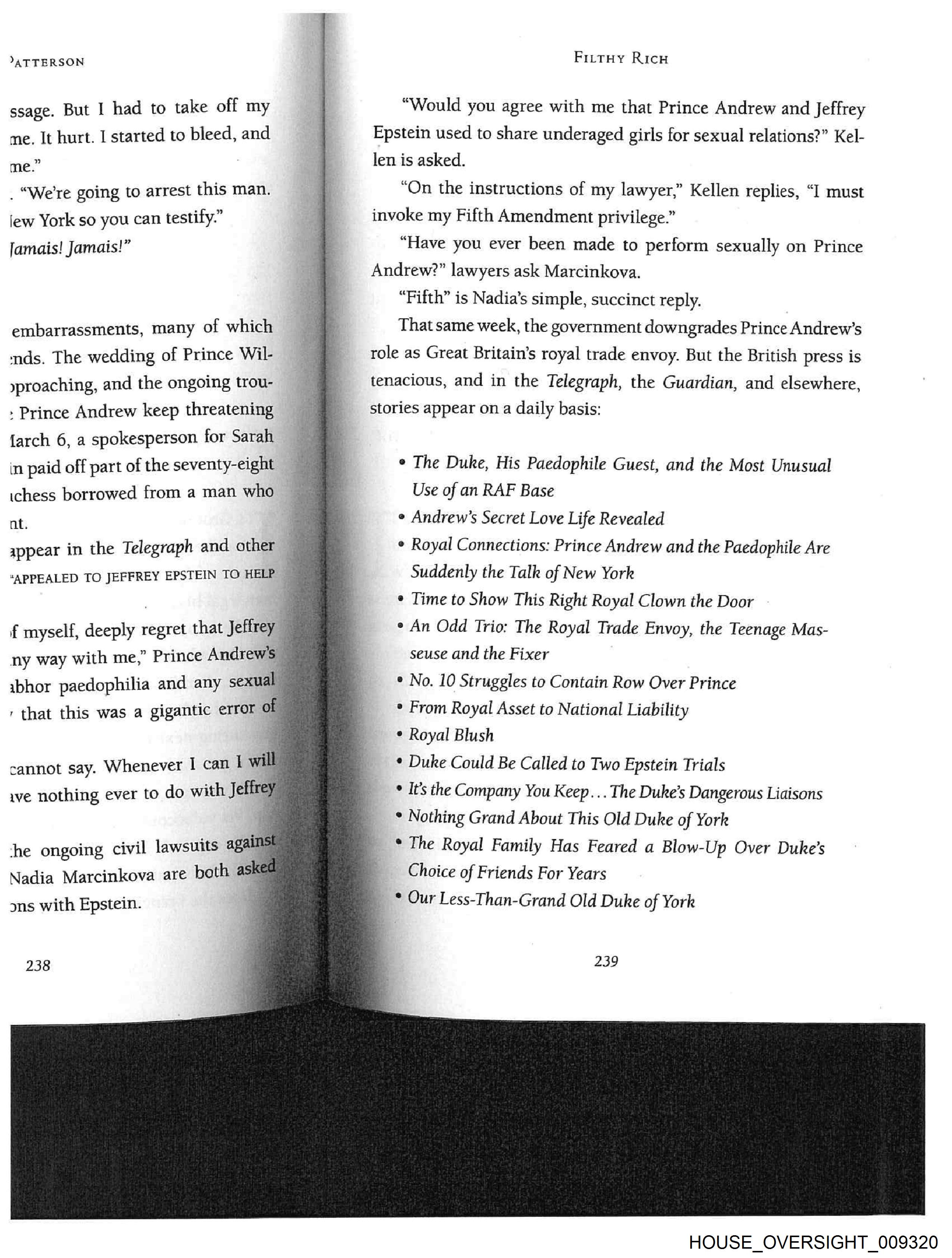 JATTERSON ssage. But I had to take off my ne. It hurt. I started to bleed, and me.” _ “We're going to arrest this man. lew York so you can testify.” ir lamais! Jamais! embarrassments, many of which nds. The wedding of Prince Wil- yproaching, and the ongoing trou- : Prince Andrew keep threatening {arch 6, a spokesperson for Sarah in paid off part of the seventy-eight ichess borrowed from a man who appear in the Telegraph and other a ‘APPEALED TO JEFFREY EPSTEIN TO HELP = i f myself, dccplys regret that Jeffrey = ny way with me,” Prince Andrew's © ibhor paedophilia and any sexual | ‘that this was a gigantic error of cannot say. Whenever I can I vill ve nothing ever to do with Jeffrey : ; he ongoing civil lawsutts agail ns Nadia Marcinkova are both ask ce ms with Epstein. 4 FittHy Ricw “Would you agree with me that Prince Andrew and Jeffrey Epstein used to share underaged girls for sexual relations?” Kel- len is asked. On the instructions of my lawyer,” Kellen replies, “I must invoke my Fifth Amendment privilege.” “Have you ever been made to perform sexually on Prince Andrew?” lawyers ask Marcinkova. “Fifth” is Nadia’s simple, succinct reply. That same week, the government downgrades Prince Andrew’s role as Great Britain’s royal trade envoy. But the British press is tenacious, and in the Telegraph, the Guardian, and elsewhere, stories appear on a daily basis: ¢ The Duke, His Paedophile Guest, and the Most Unusual Use of an RAF Base e Andrew’s Secret Love Life Rev