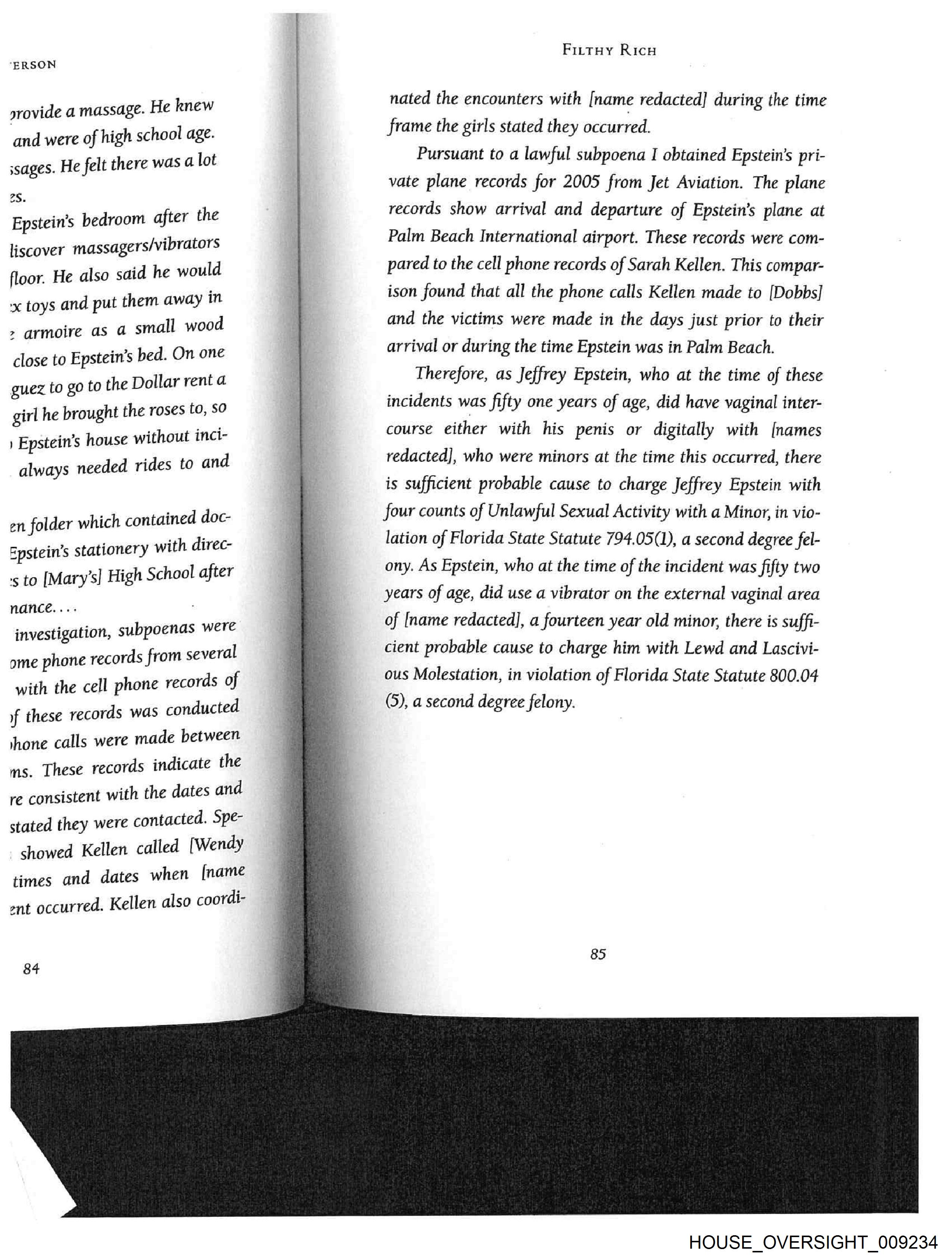 ‘ERSON srovide a massage. He knew and were of high school age. sages. He felt there was a lot 2S. Epstein’s bedroom after the liscover massagers/vibrators floor. He also said he would + toys and put them awdy in > armoire as a small wood close to Epstein’s bed. On one guez to go to the Dollar rent a girl he brought the roses to, ‘ad | Epstein’s house without inci- always needed rides to and en folder which contained doc- Epstein’s stationery with direc- 's to [Mary’s] High School after nance. ... investigation, subpoenas were ome phone records from several with the cell phone records of if these records was conducted one calls were made between ms. These records indicate the re consistent with the dates and stated they were contacted. Spe- showed Kellen called [Wendy times and dates when [name nt occurred. Kellen also coordi- Firtyy Ricw nated the encounters with [name redacted] during the time frame the girls stated they occurred. Pursuant to a lawful subpoena I obtained Epstein’s pri- vate plane records for 2005 from Jet Aviation. The plane records show arrival and departure of Epstein’s plane at Palm Beach International airport. These records were com- pared to the cell phone records of Sarah Kellen. This compar- ison found that all the phone calls Kellen made to [Dobbs] and the victims were made in the days just prior to their arrival or during the time Epstein was in Palm Beach. Therefore, as Jeffrey Epstein, who at the time of these incidents was fifty one years