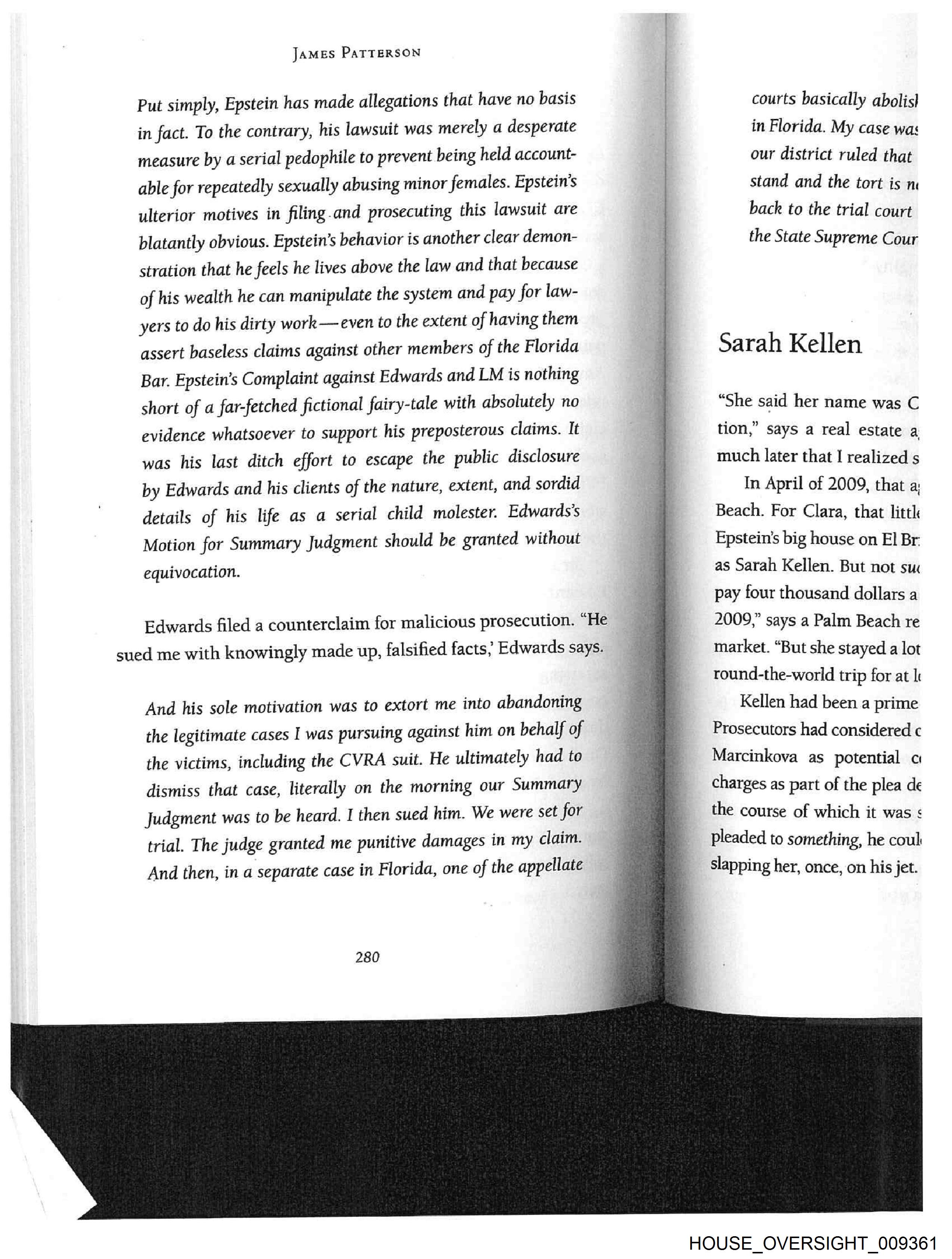 JamMEs PATTERSON Put simply, Epstein has made allegations that have no basis in fact. To the contrary, his lawsuit was merely a desperate measure by a serial pedophile to prevent being held account- able for repeatedly sexually abusing minor females. Epstein’s ulterior motives in filing.and prosecuting this lawsuit are blatantly obvious. Epstein’s behavior is another clear demon- stration that he feels he lives above the law and that because of his wealth he can manipulate the system and pay for law- yers to do his dirty work— even to the extent of having them assert baseless claims against other members of the Florida Bar. Epstein’s Complaint against Edwards and LM is nothing short of a far-fetched fictional fairy-tale with absolutely no evidence whatsoever to support his preposterous claims. It was his last ditch effort to escape the public disclosure by Edwards and his clients of the nature, extent, and sordid details of his life as a serial child molester. Edwards’s Motion for Summary Judgment should be granted without equivocation. Edwards filed a counterclaim for malicious prosecution. “He sued me with knowingly made up, falsified facts; Edwards says. And his sole motivation was to extort me into abandoning the legitimate cases I was pursuing against him on behalf of the victims, including the CVRA suit. He ultimately had to dismiss that case, literally on the morning our Summary Judgment was to be heard. I then sued him. We were set for trial. The judge granted me