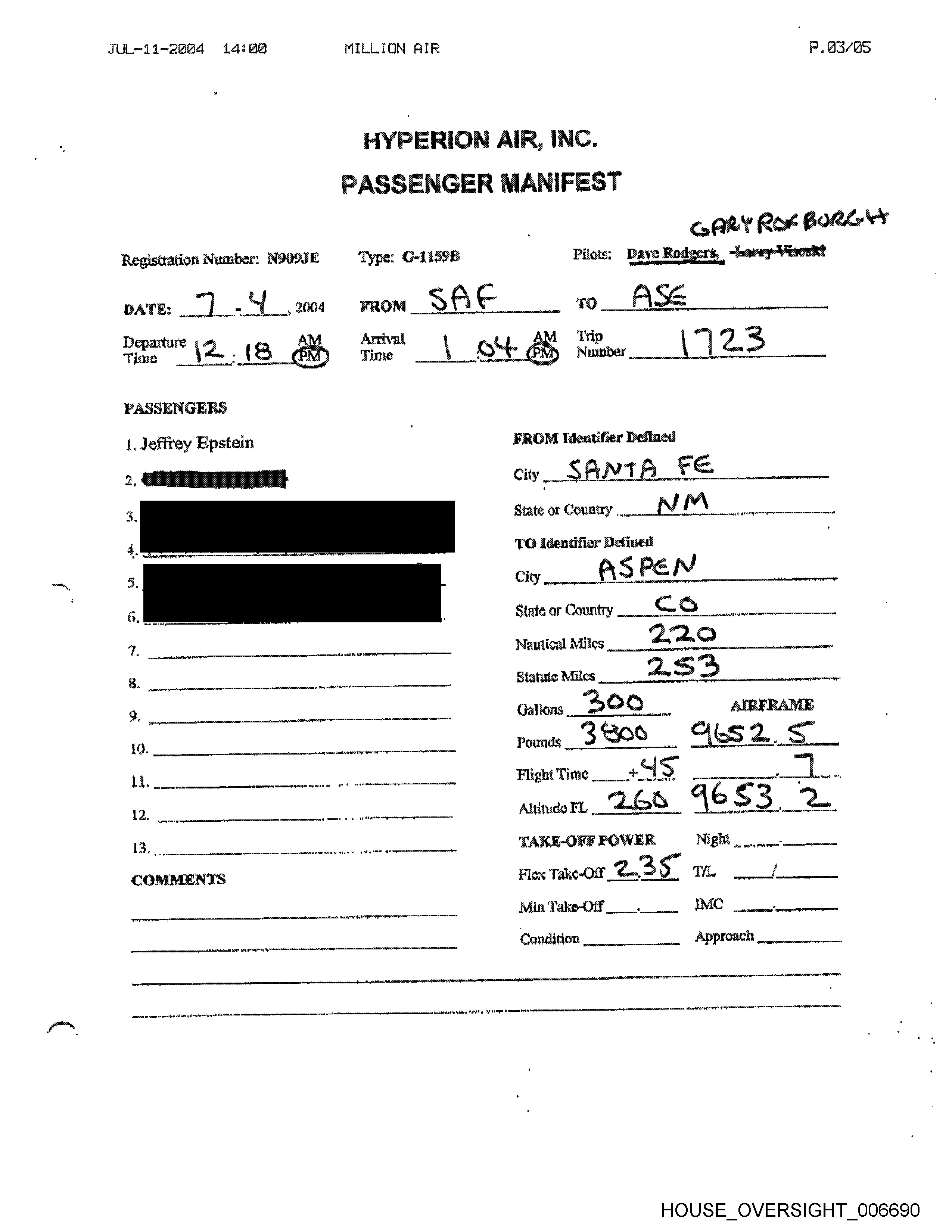 11/98/2084 68:37 619696631 DAVID RODGERS PAGE @1/85 Repistration Number: Nia IE Type: G-11598 Pilots; Duve Rodpers, DATE: AA te , 2004 PASSENGERS 1, Jeffrey Epstein FROM Identifier Defined State or Country | Nautical Miles 8. ; Blatute Miles 9. Gallons \ DO 10. | Pounds 11. Plight Time | Se" + 2..(% “es sped Aly Mele fic fate atm gt tp me ge oy rel i pipet eet A 17. Altitude FL ‘U3 oO TAKE-OFF POWER Night, Ze. Flex Take-OF TL f r Min Take-Oi? wnnnnnny=sseen” oooh peep aT yD del AONE Condition Approach rtrtriririrriririiciriet HOUSE _OVERSIGHT_006702