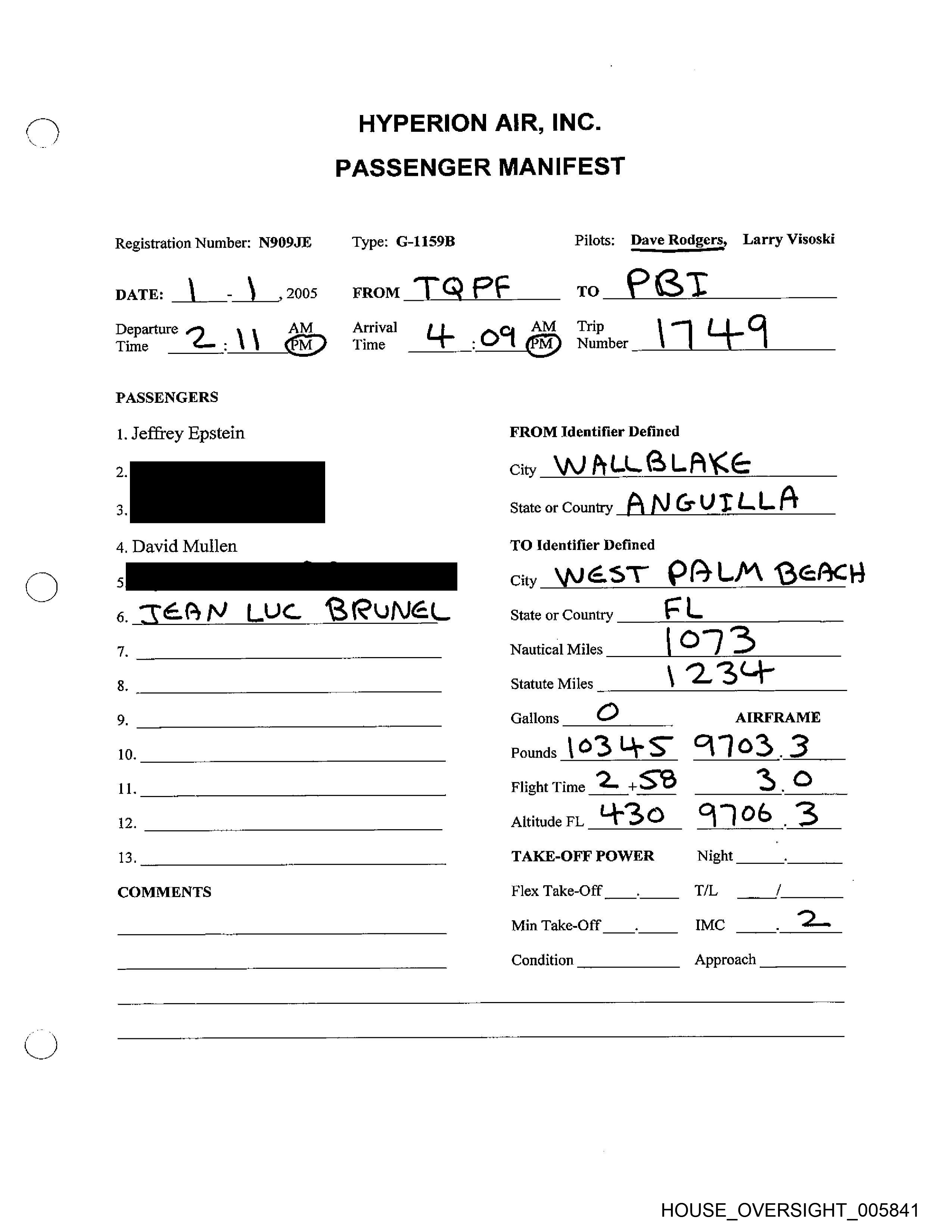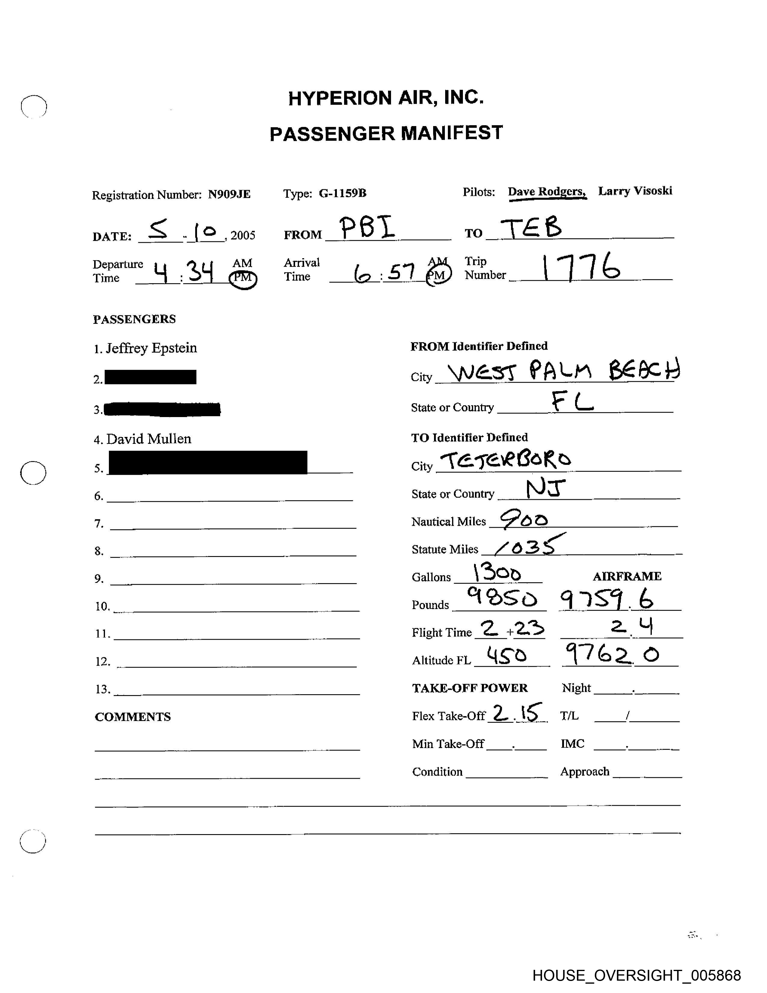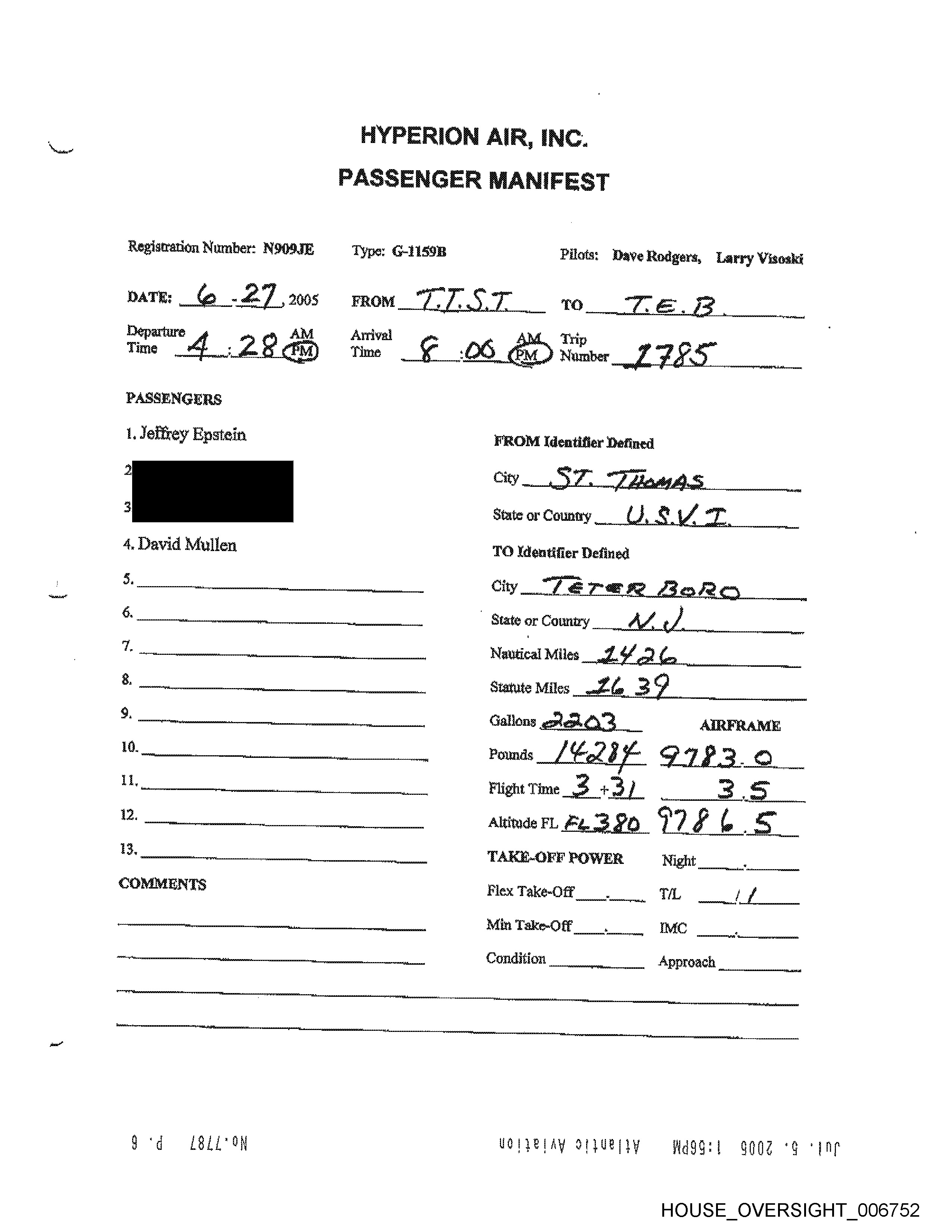 Registration Number: N909JE Type: G-LIS9B Pilots: Dave Rodgers, Larry Visoski