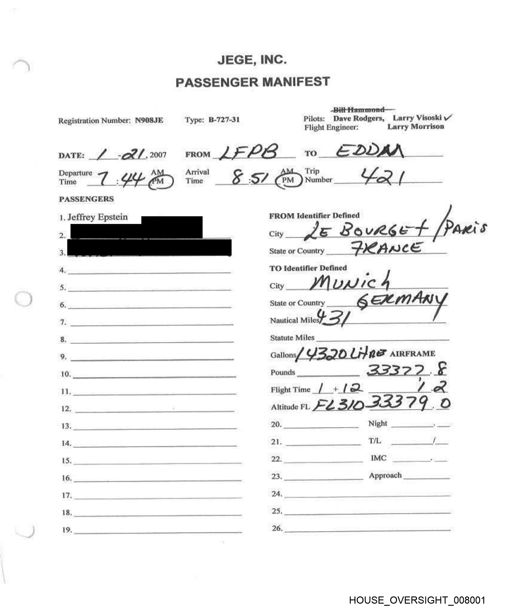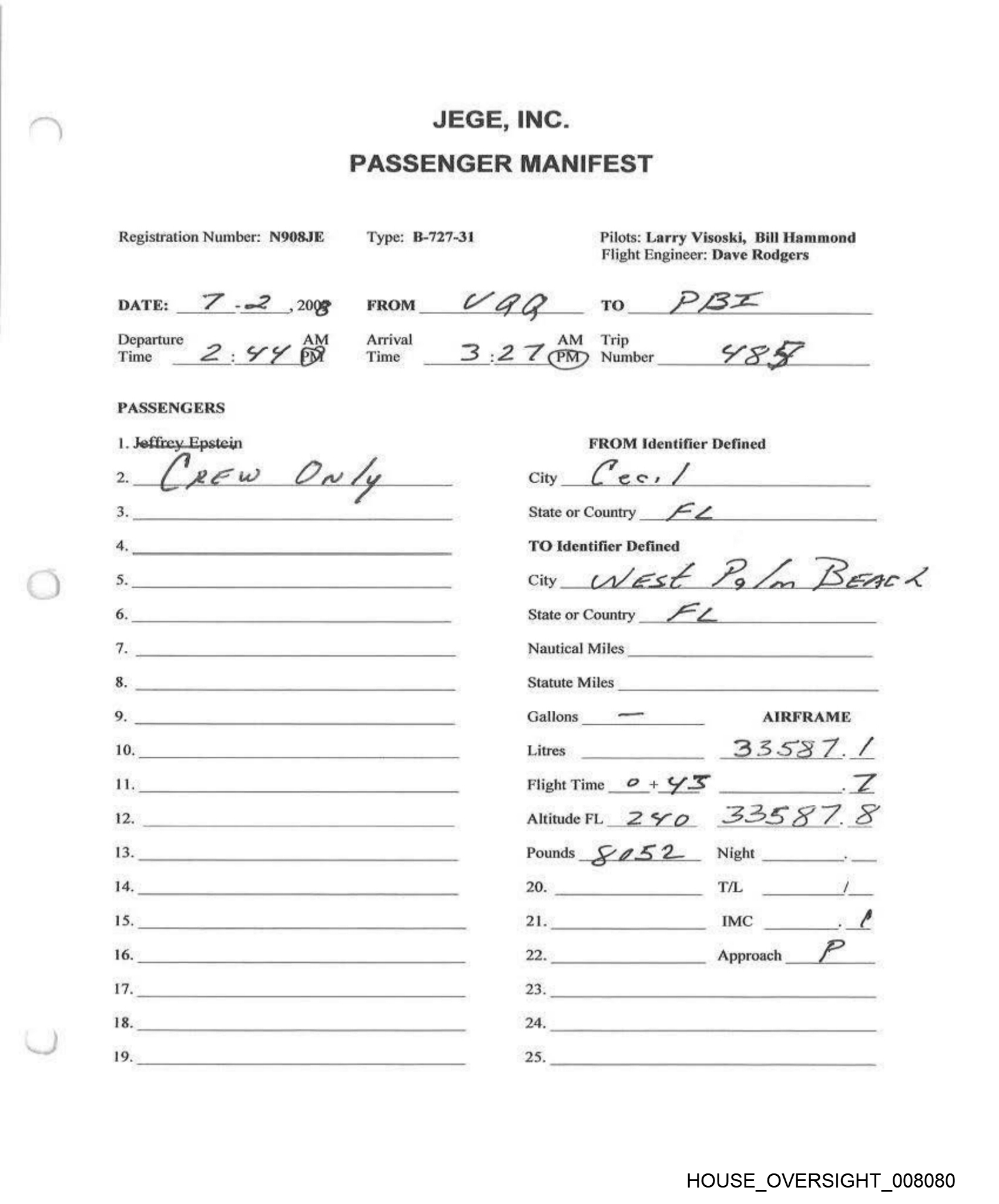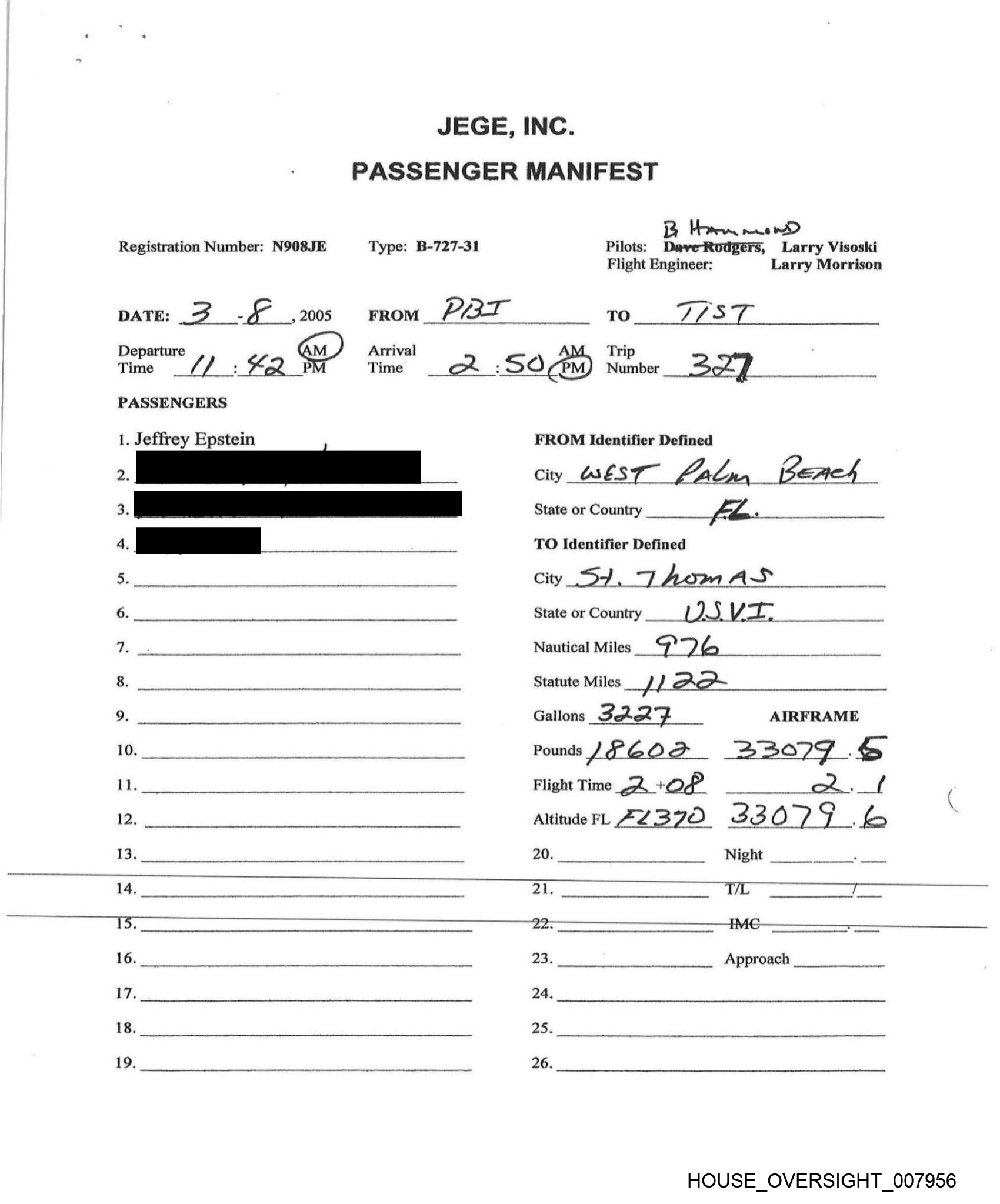 Registration Number: N908JE Type: B-727-31 Pilots: ‘odgers, Larry V Visoski